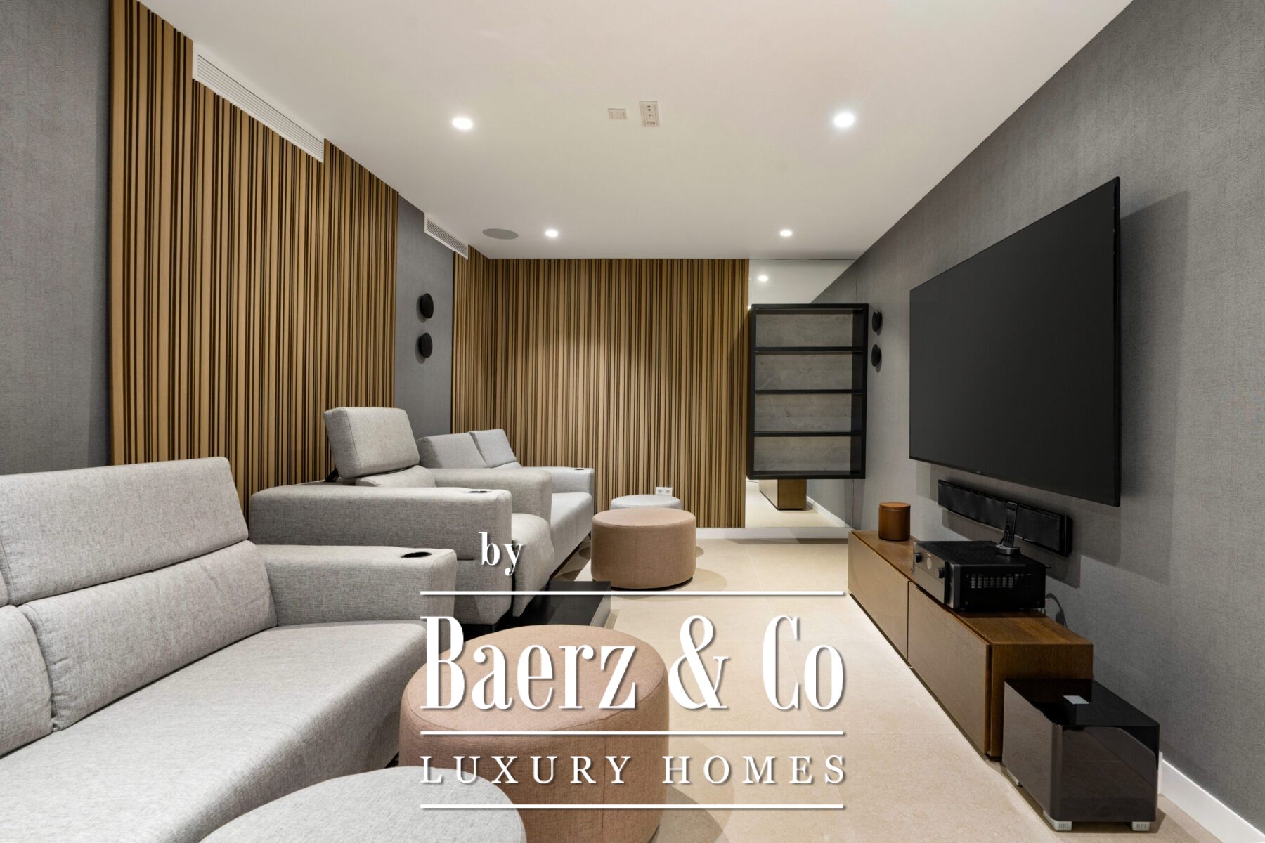 La vida al aire libre es protagonista con varias terrazas, piscina, hoguera hundida, jacuzzi y una cocina exterior completamente equipada con barbacoa y televisor resistente al agua. Dos dormitorios en suite adicionales en el nivel inferior gozan de patios ingleses. Una sala de cine insonorizada, zonas de servicio, garaje doble con carga eléctrica y un acceso privado con portón aumentan la seguridad y el confort.