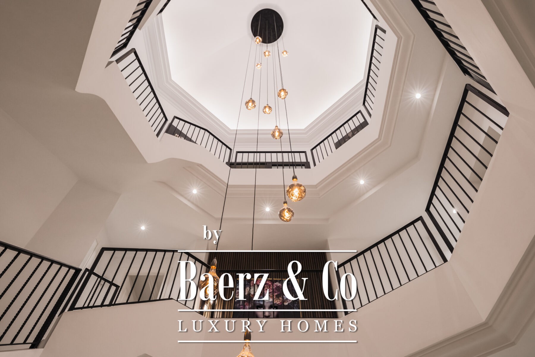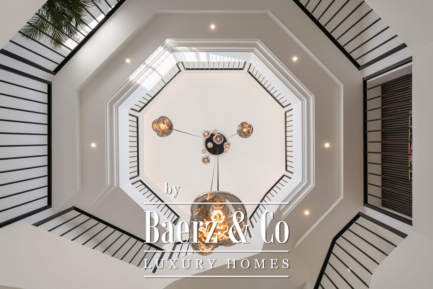 Upon entering, guests are greeted by an elegant spiral staircase adorned with a magnificent hanging chandelier, creating a captivating ambiance complemented by breath-taking sea views.