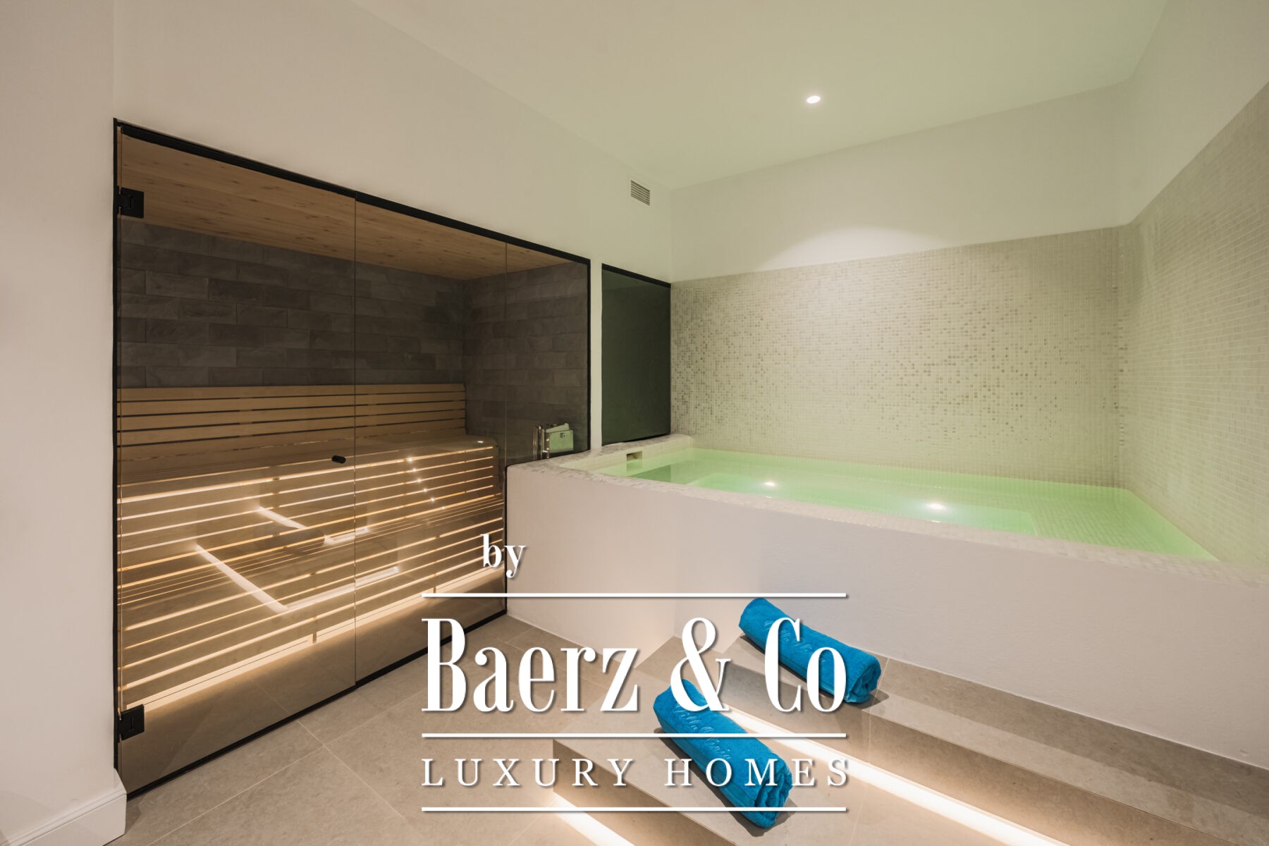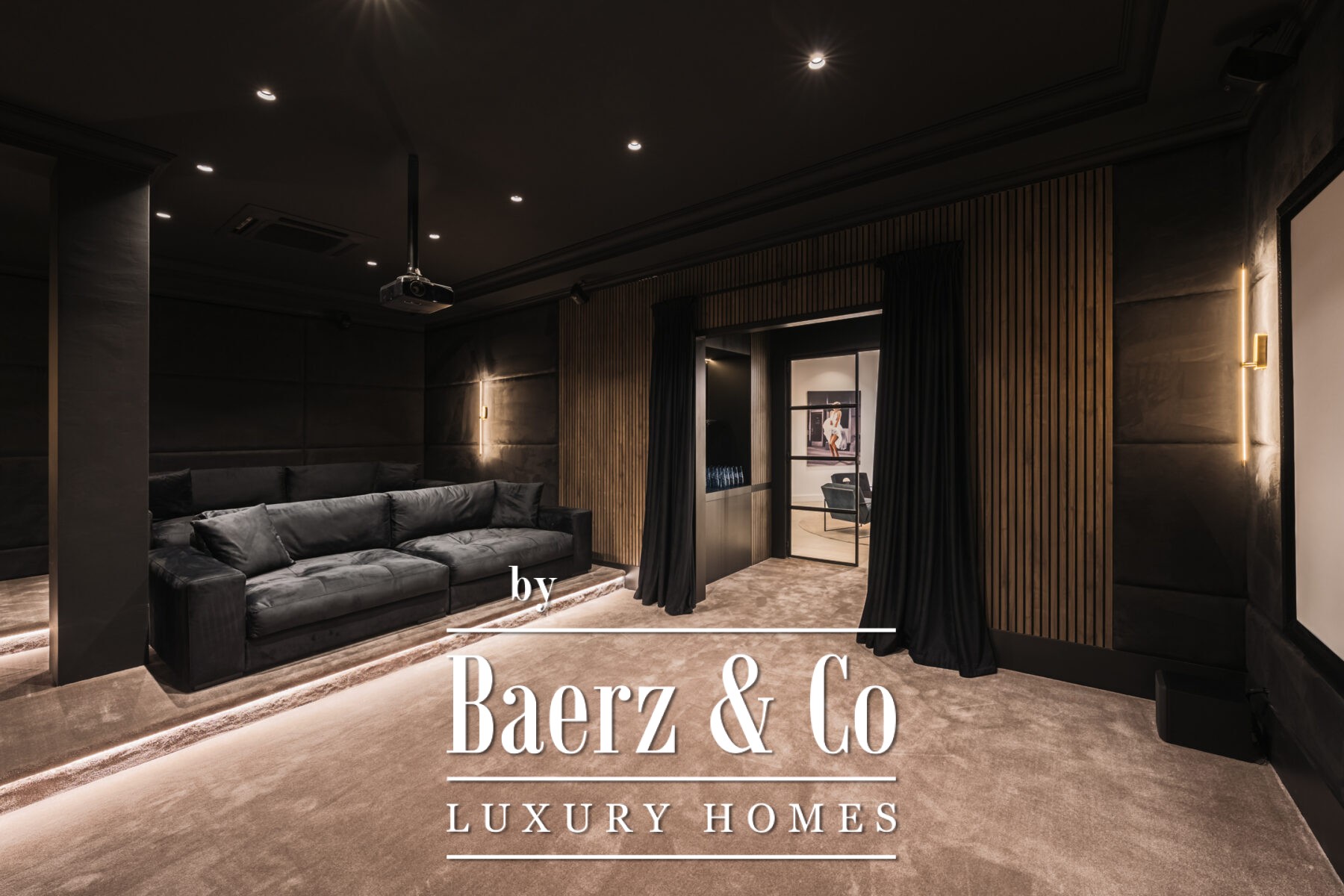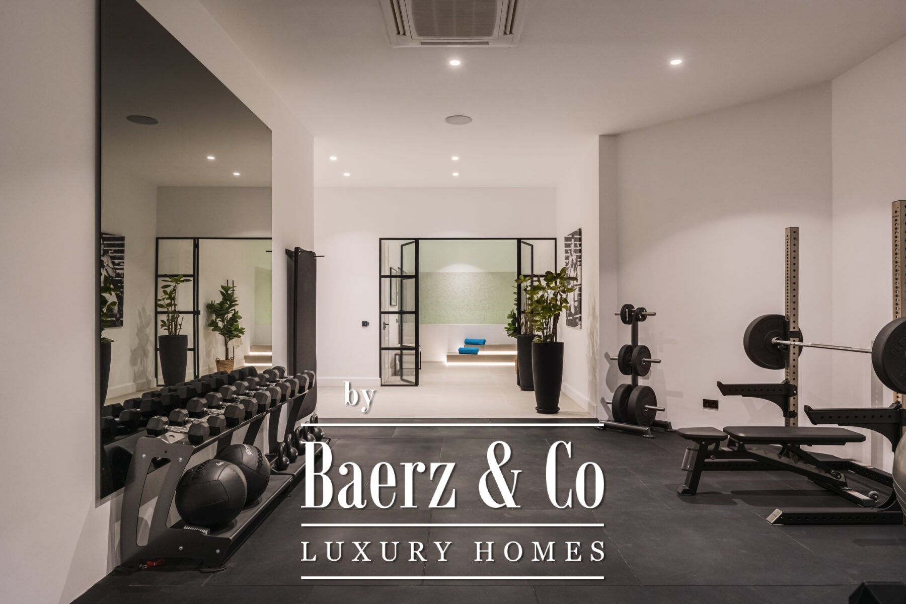 In the basement, this villa continues to impress with a fully stocked wine cellar, a state-of-the-art cinema room, a gym, a spa featuring a plunge pool, laundry facilities, and a spacious garage.