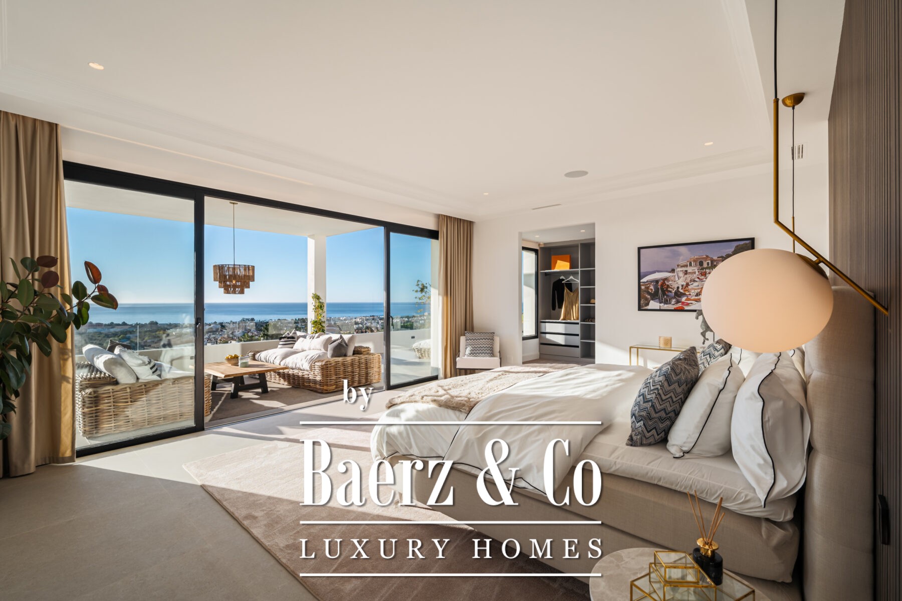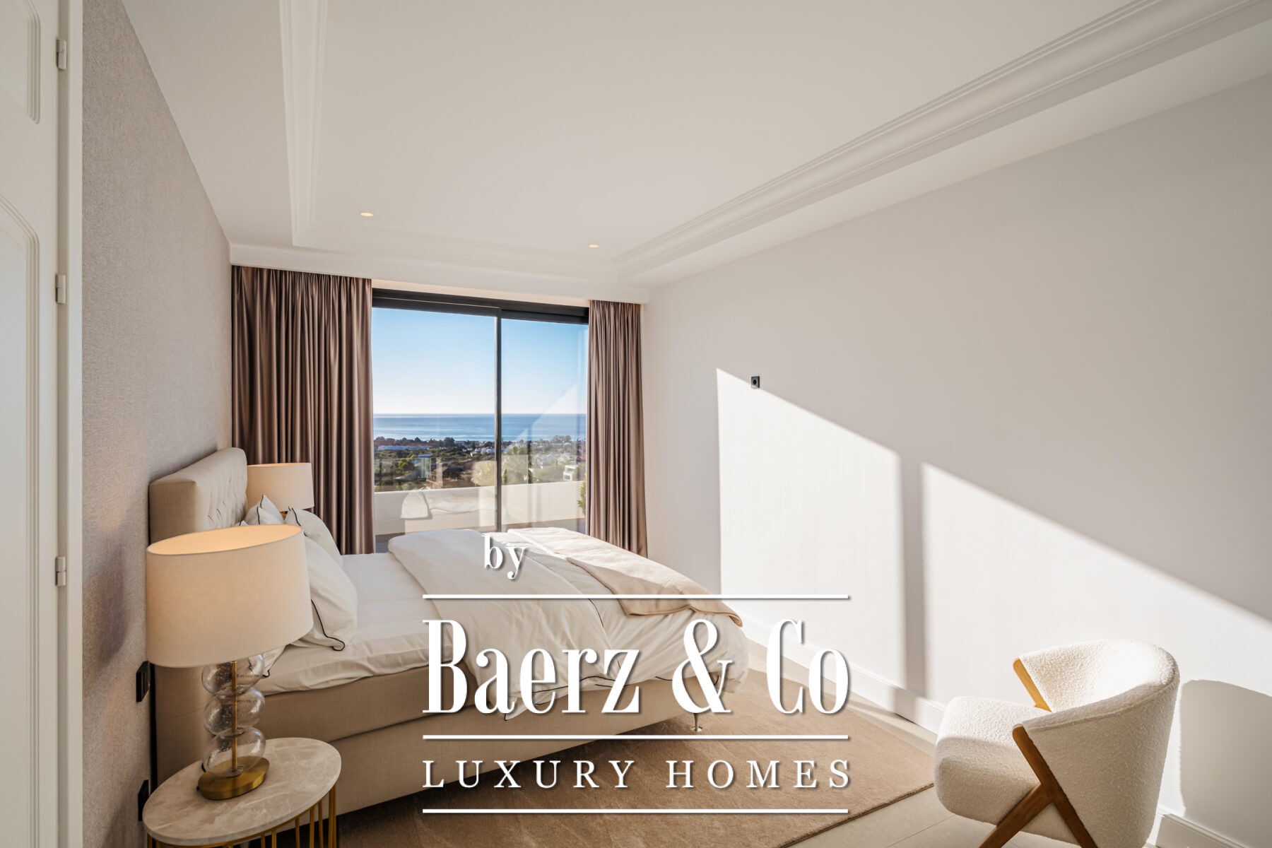 On the first floor, the en-suite master bedroom offers a serene retreat with a private bathroom, featuring a freestanding bathtub positioned to capture the views, access to the large terrace, and an expansive walk-in closet. Two additional en-suite bedrooms on this floor ensure comfort and privacy for all family members.