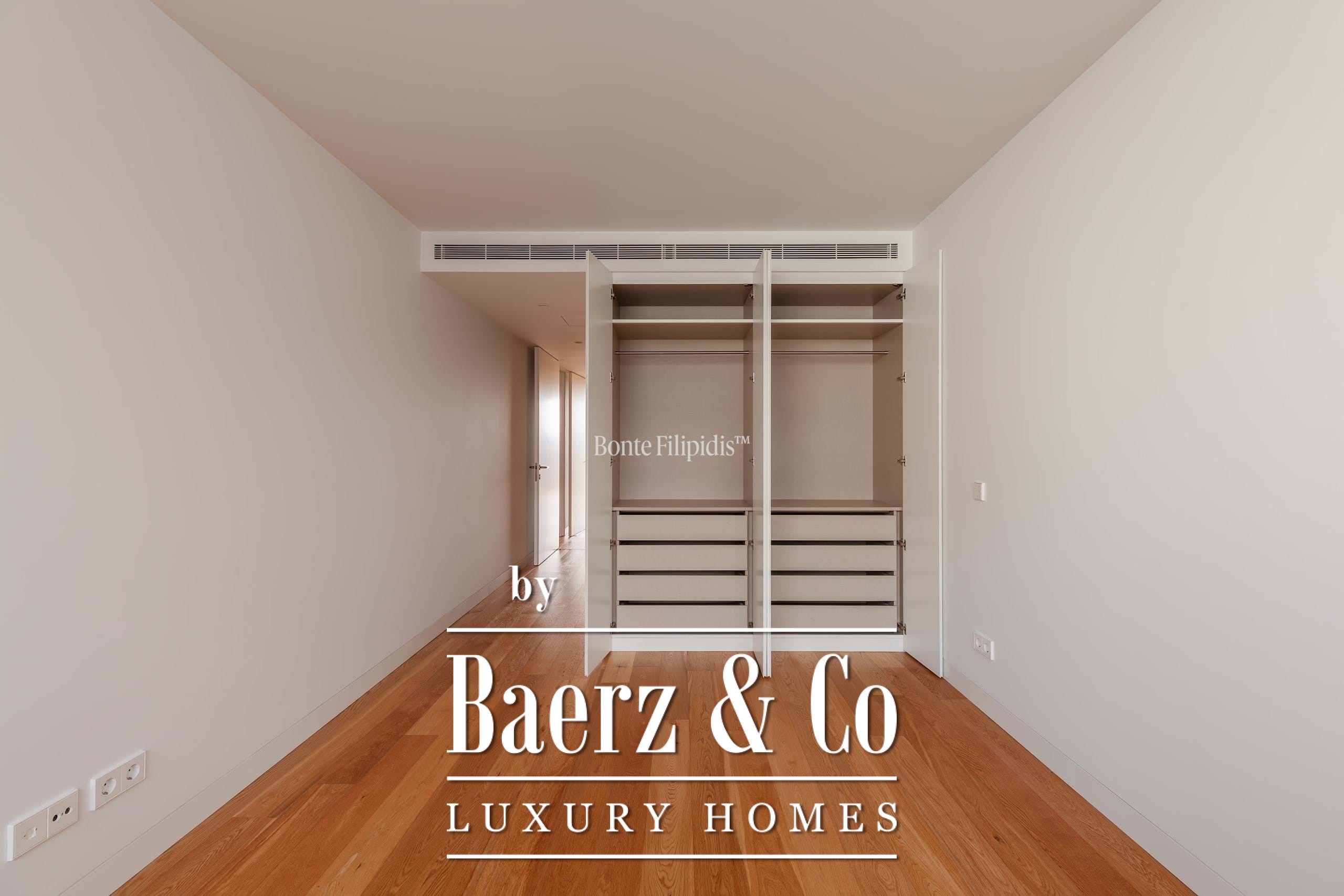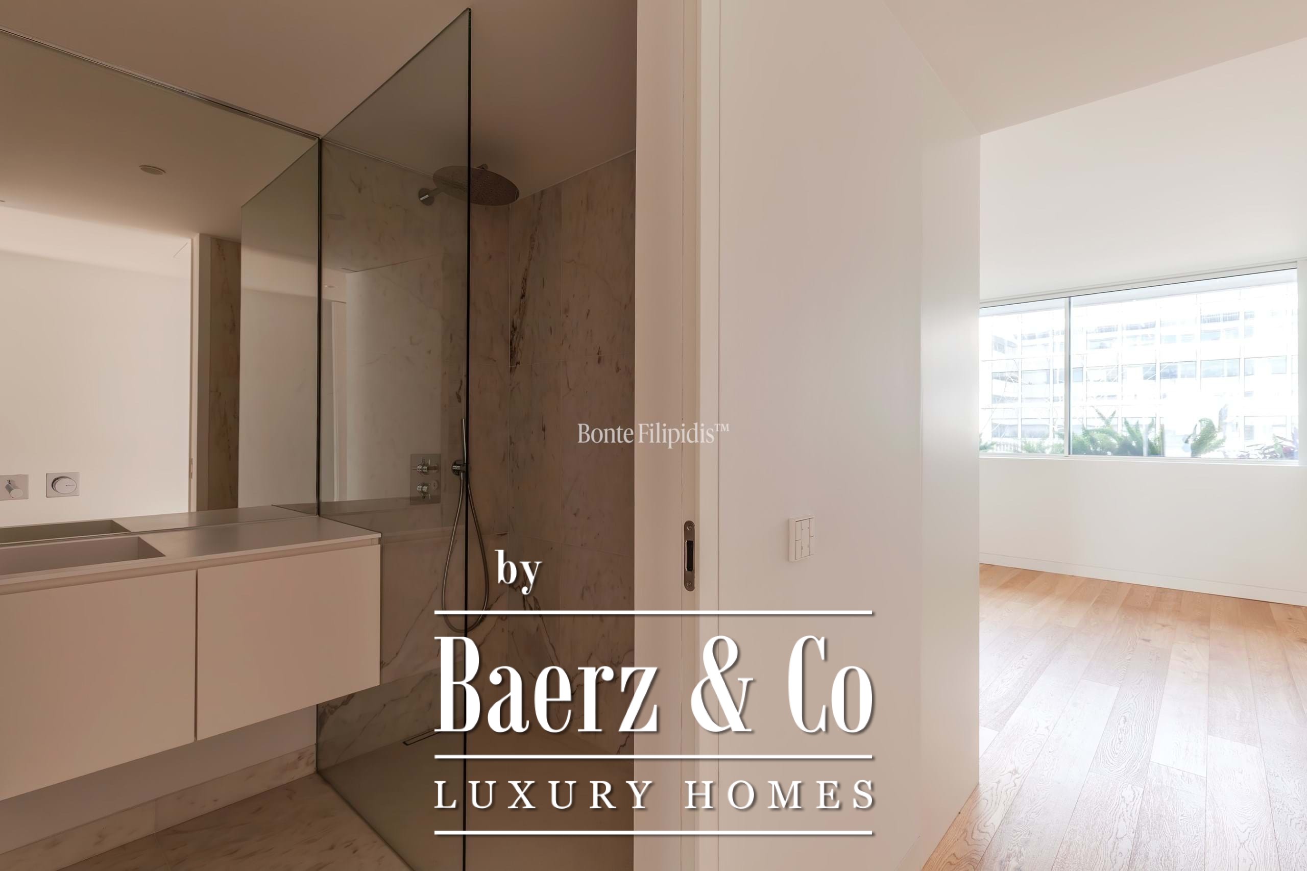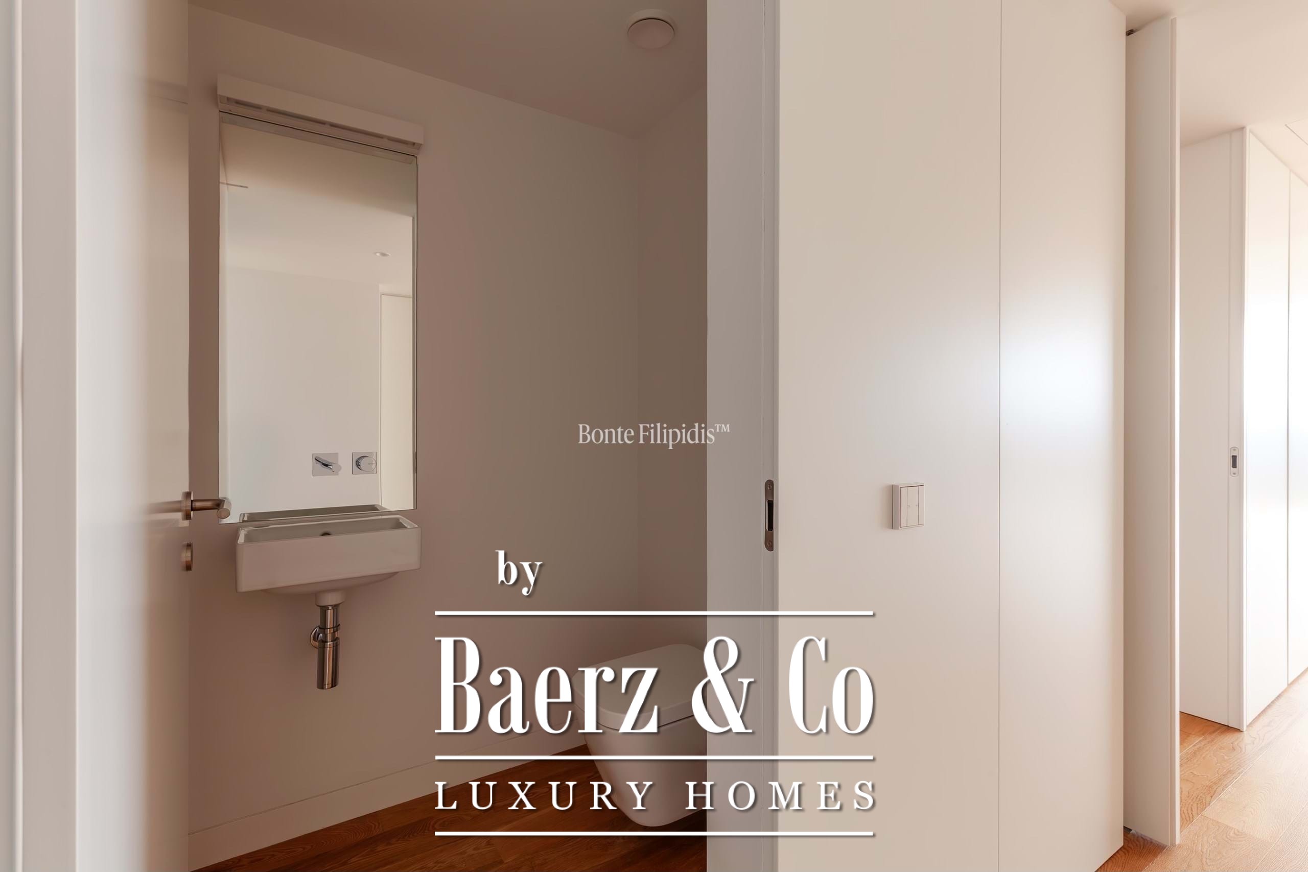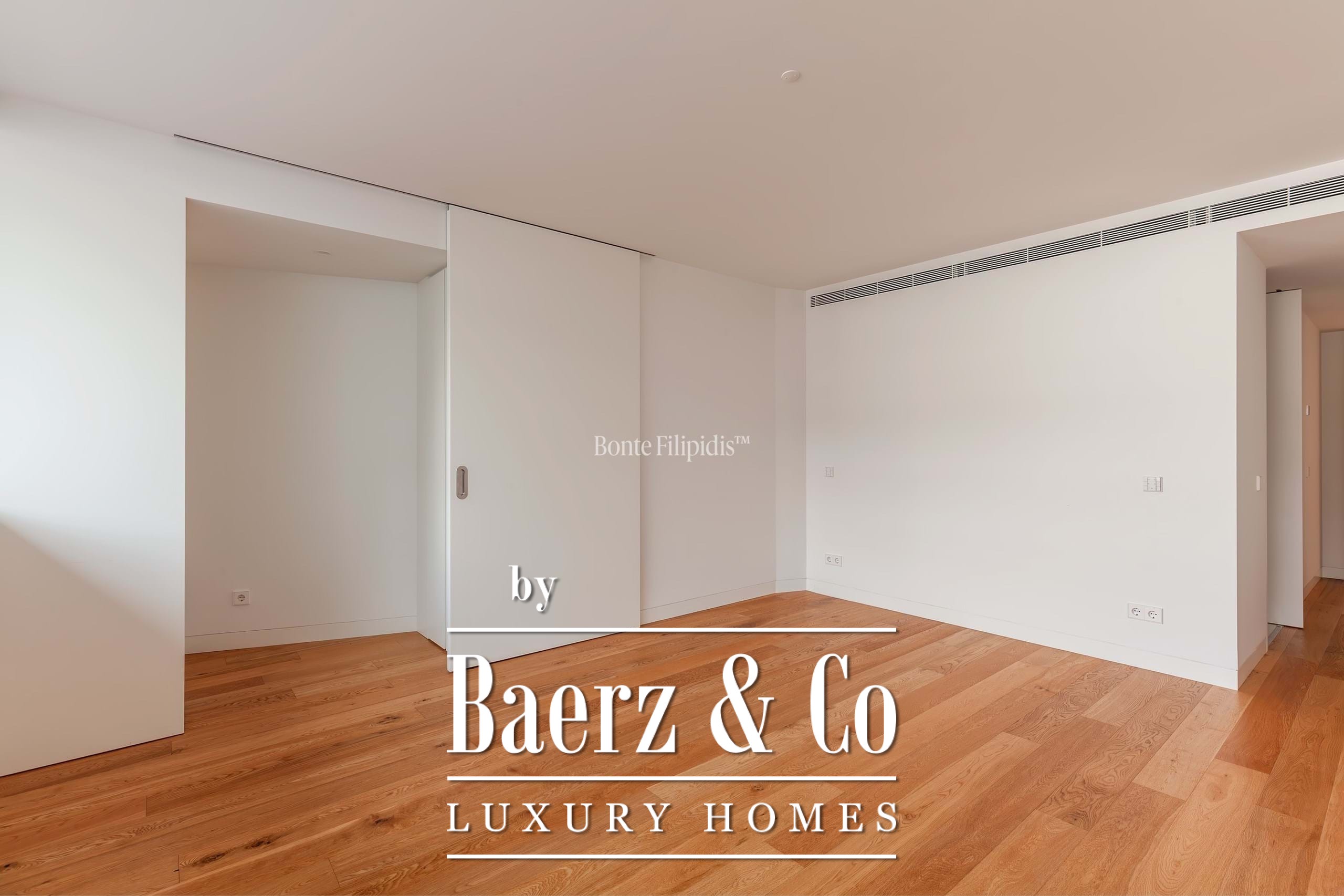La suite principal cuenta con armarios empotrados y un baño en suite con piedra natural. Los otros dos dormitorios ofrecen dimensiones generosas, amplios ventanales y almacenamiento integrado, complementados por un total de tres baños. Suelos de madera maciza, carpintería refinada y una cocina completamente equipada con electrodomésticos de alta gama subrayan el énfasis en la comodidad contemporánea.