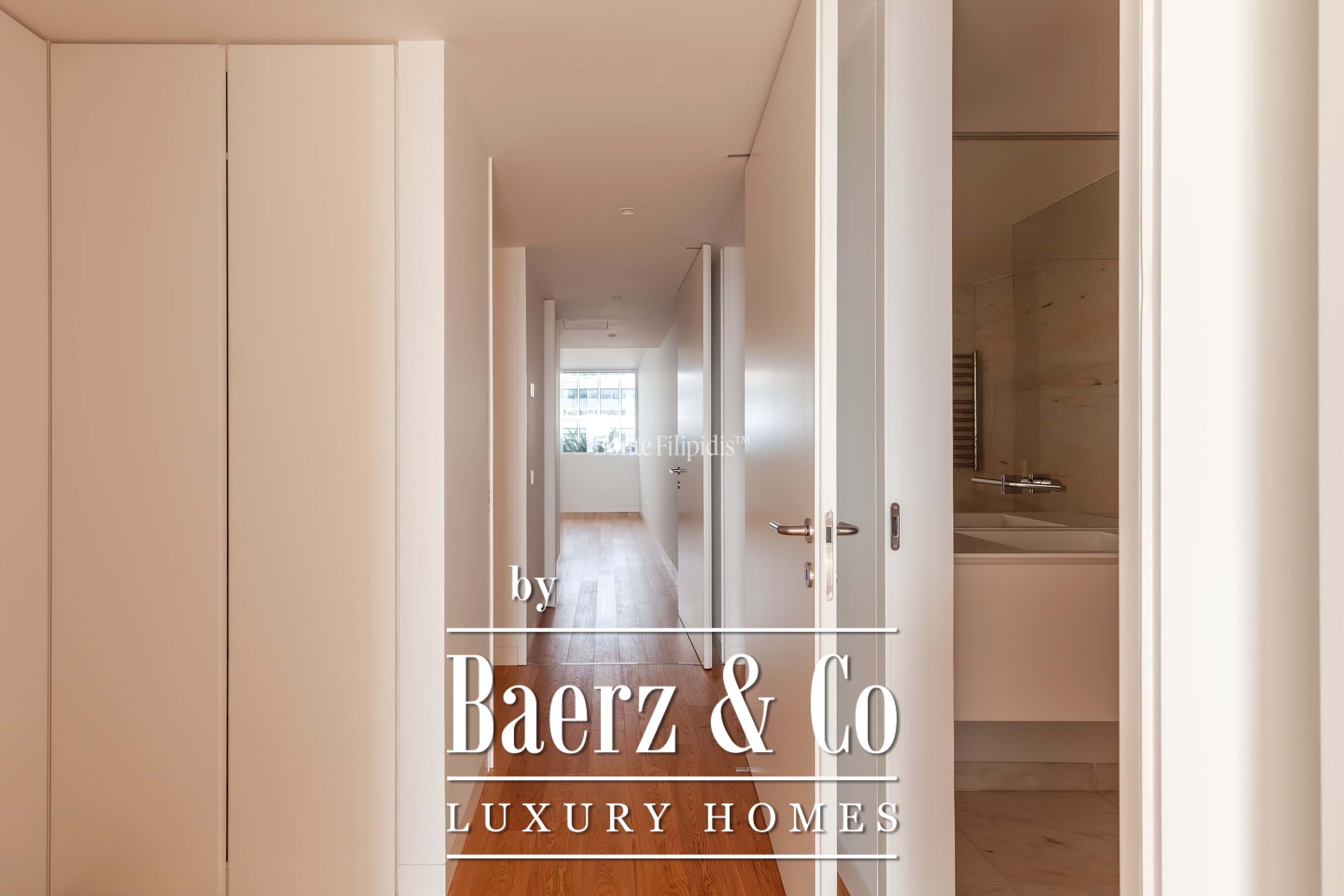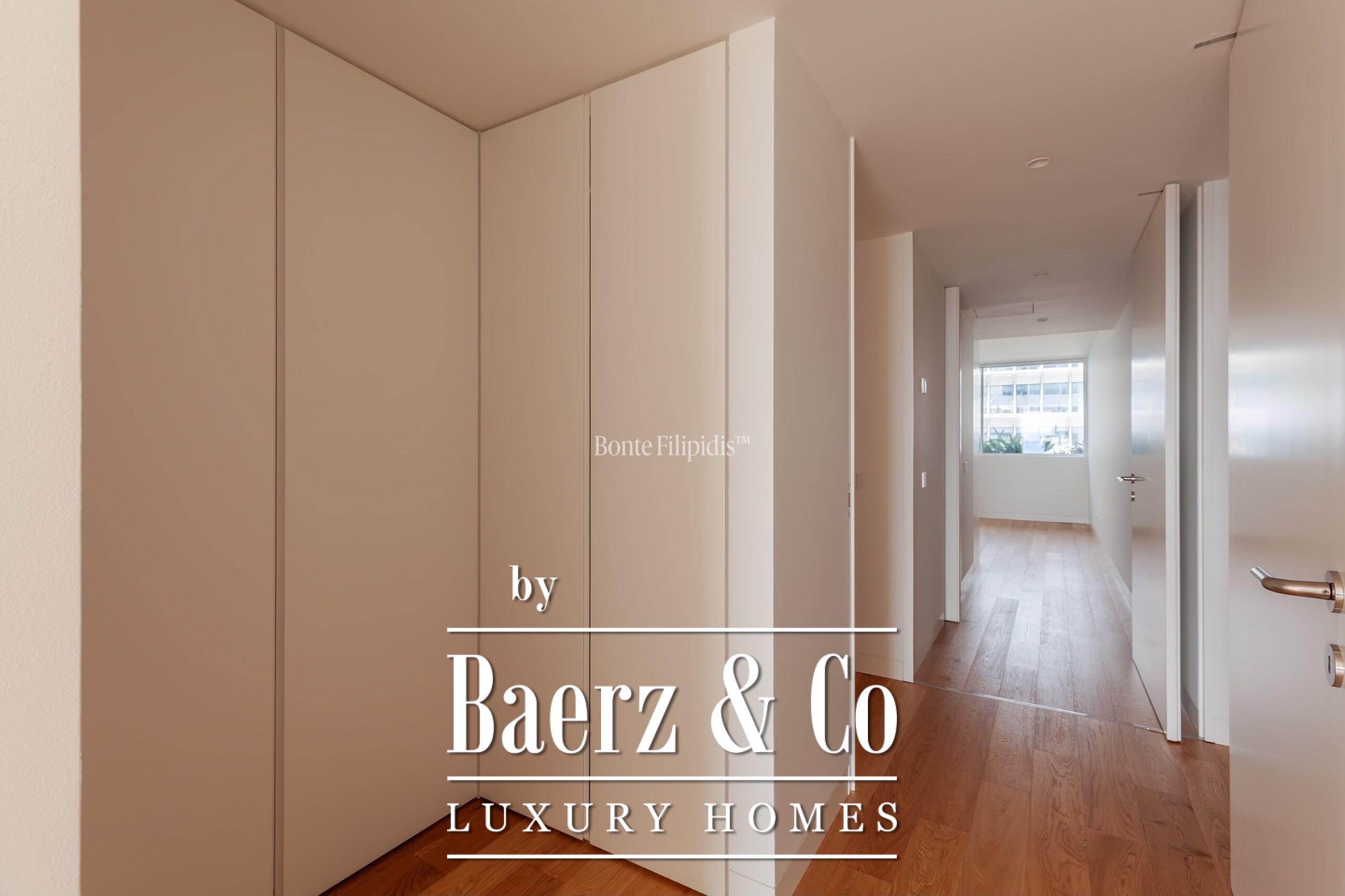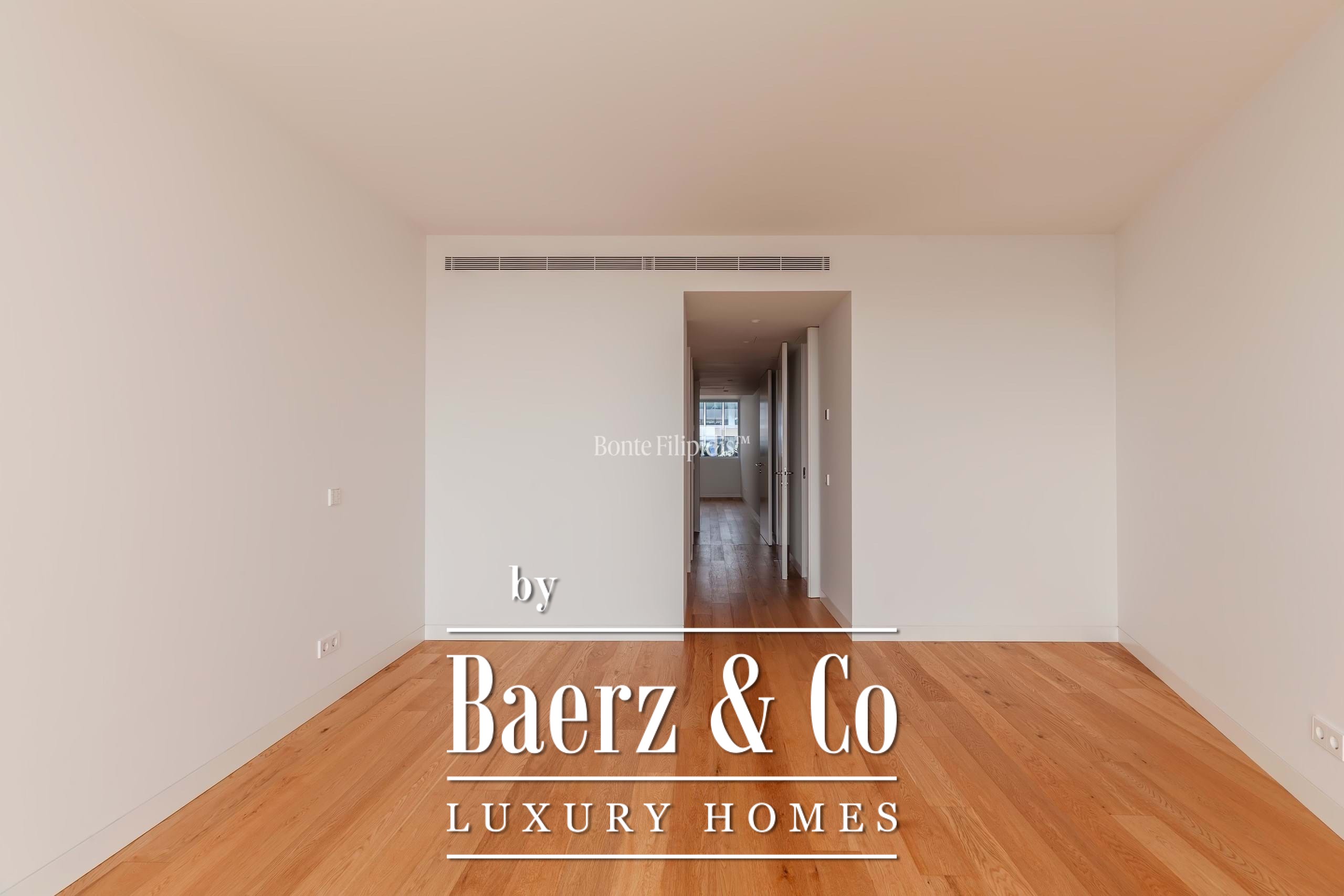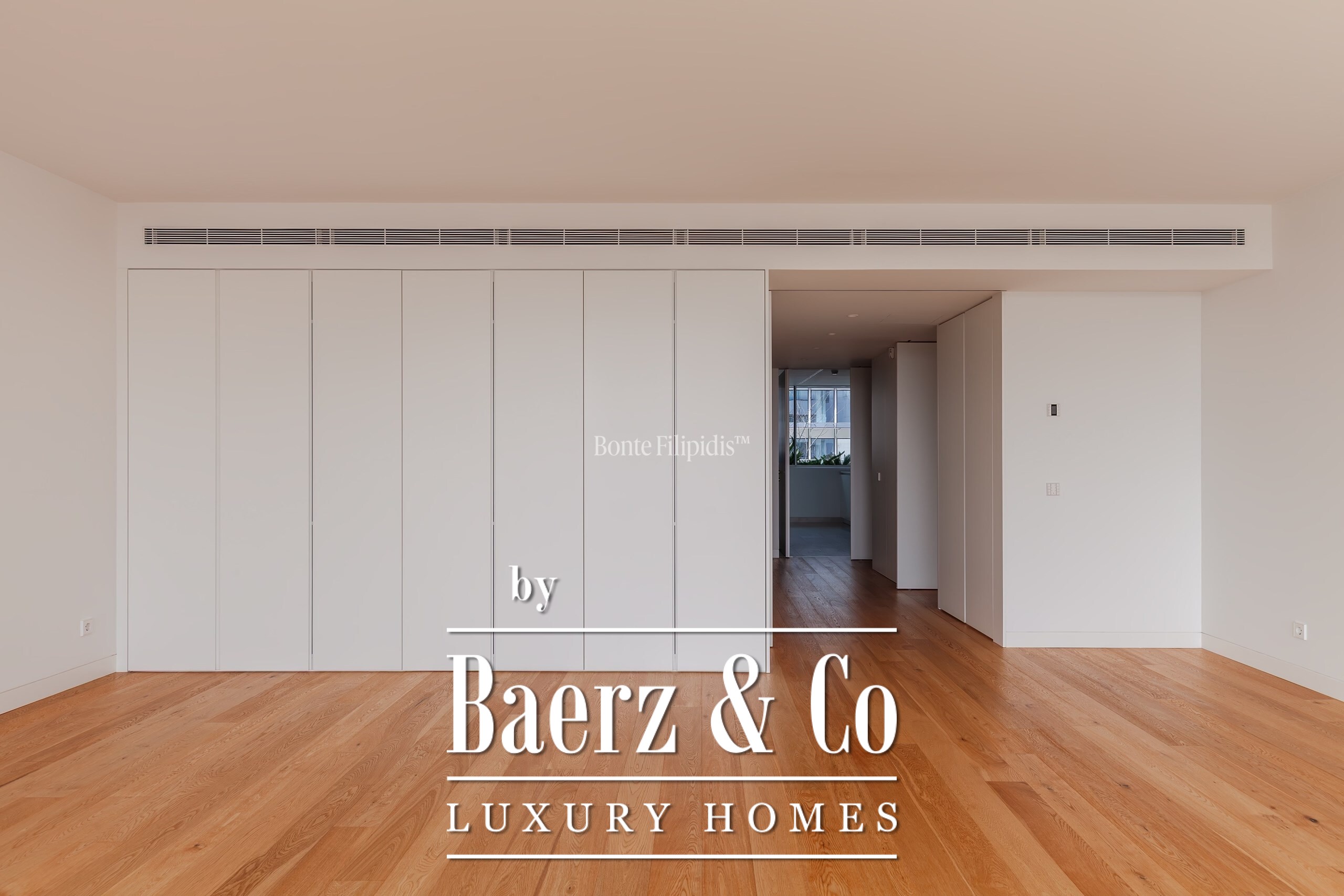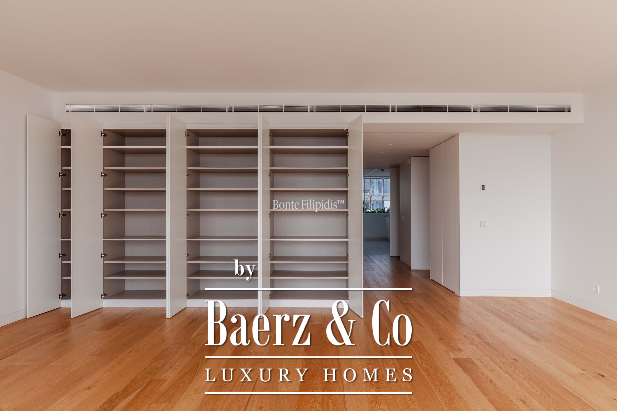 La suite principal cuenta con armarios empotrados y un baño en suite con piedra natural. Los otros dos dormitorios ofrecen dimensiones generosas, amplios ventanales y almacenamiento integrado, complementados por un total de tres baños. Suelos de madera maciza, carpintería refinada y una cocina completamente equipada con electrodomésticos de alta gama subrayan el énfasis en la comodidad contemporánea.