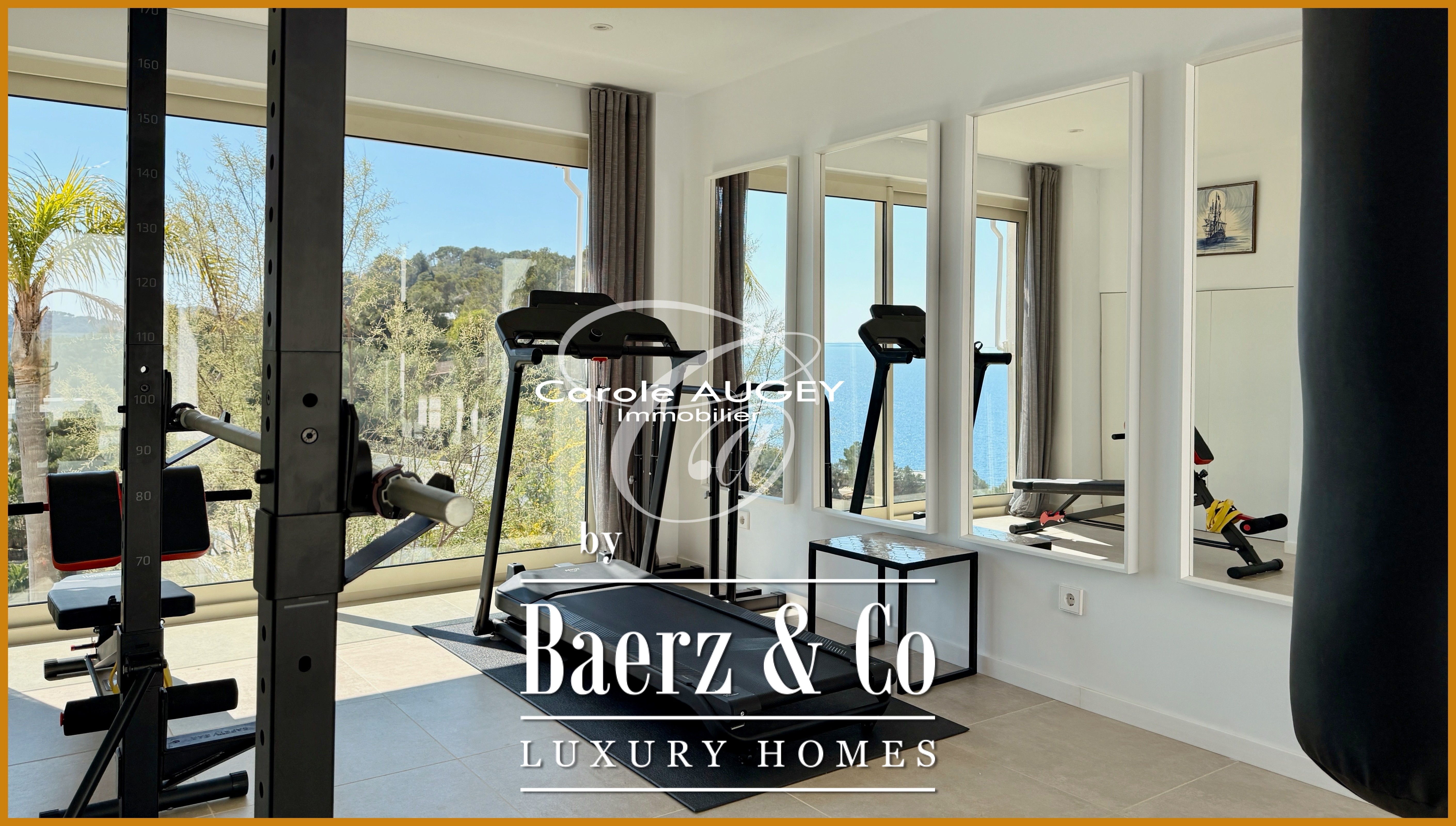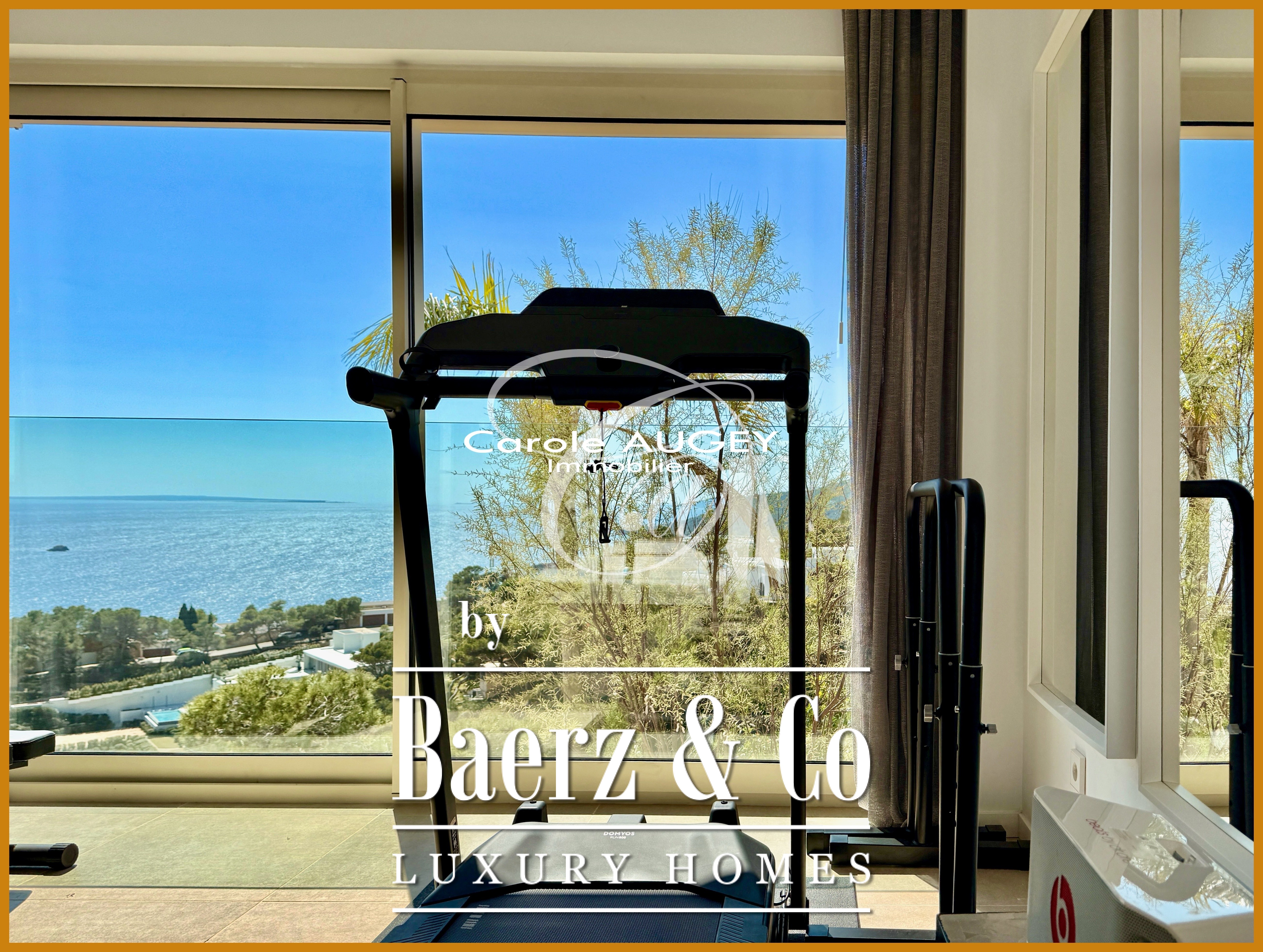 La propiedad cuenta con 5 suites, incluyendo un estudio con acceso independiente. La suite principal ofrece amplias vistas y un ambiente relajante. El salón principal destaca por sus grandes volúmenes, techos altos y una imponente chimenea XXL de doble cara. La cocina totalmente equipada favorece la conexión entre interior y exterior. Un ascensor proporciona acceso sencillo y un gimnasio con vistas al mar completa las comodidades.