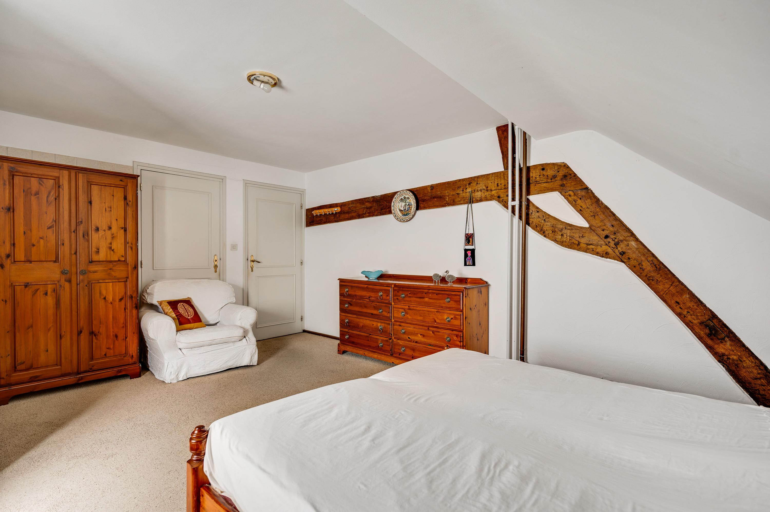 La entrada se realiza a través de un amplio vestíbulo que da paso a un salón versátil de unos 56 m², donde grandes ventanales y puertas dobles se abren al jardín paisajístico, y a una cocina de 21 m², impecablemente equipada para satisfacer las necesidades contemporáneas. Algunas estancias cuentan con calefacción por suelo radiante, paredes perfectamente enlucidas y suelos de madera que realzan elementos auténticos como la chimenea central. En la planta superior, tres dormitorios se acompañan de una sala de estar y un baño moderno; el acceso mediante diferentes escaleras refuerza la privacidad tanto para residentes como para huéspedes.