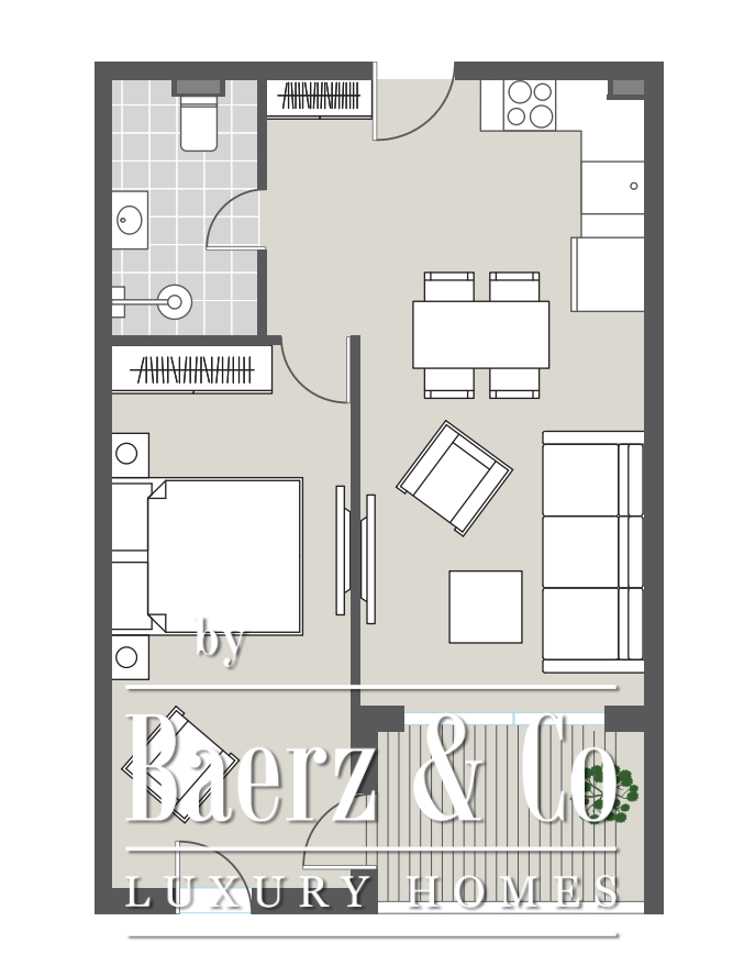 Situado en la primera planta, el apartamento dispone de un salón luminoso con cocina y comedor integrado, un dormitorio, un baño y una terraza. El concepto llave en mano incluye interiores personalizados diseñados por ANSER & Partners, mobiliario de Old Hara, así como electrodomésticos integrados y sistemas de hogar inteligente. Cada detalle, desde los sanitarios Villeroy & Boch hasta el control climático WindFree de Samsung, ha sido pensado para ofrecer un confort discreto y una experiencia tecnológica sin complicaciones.