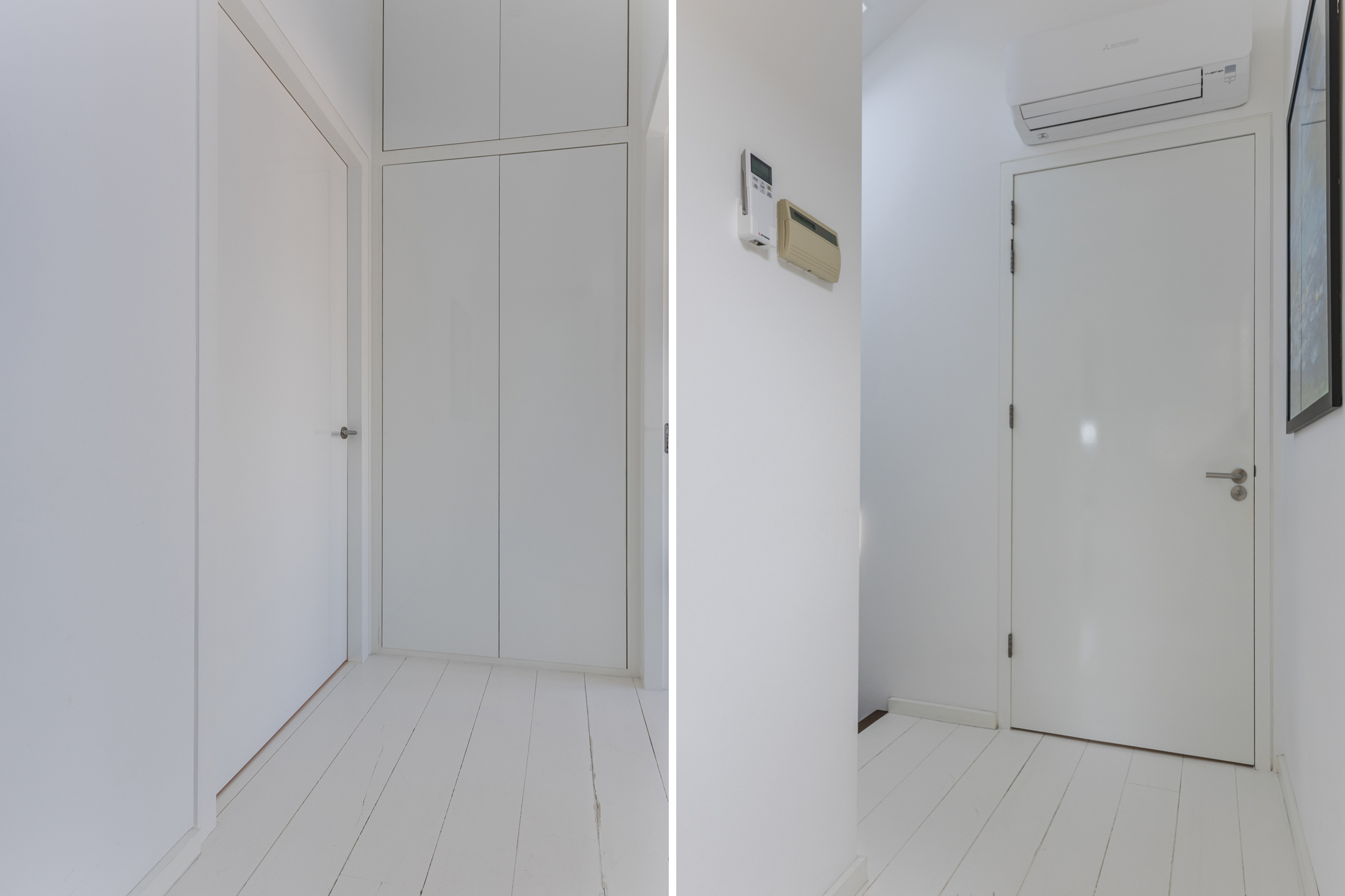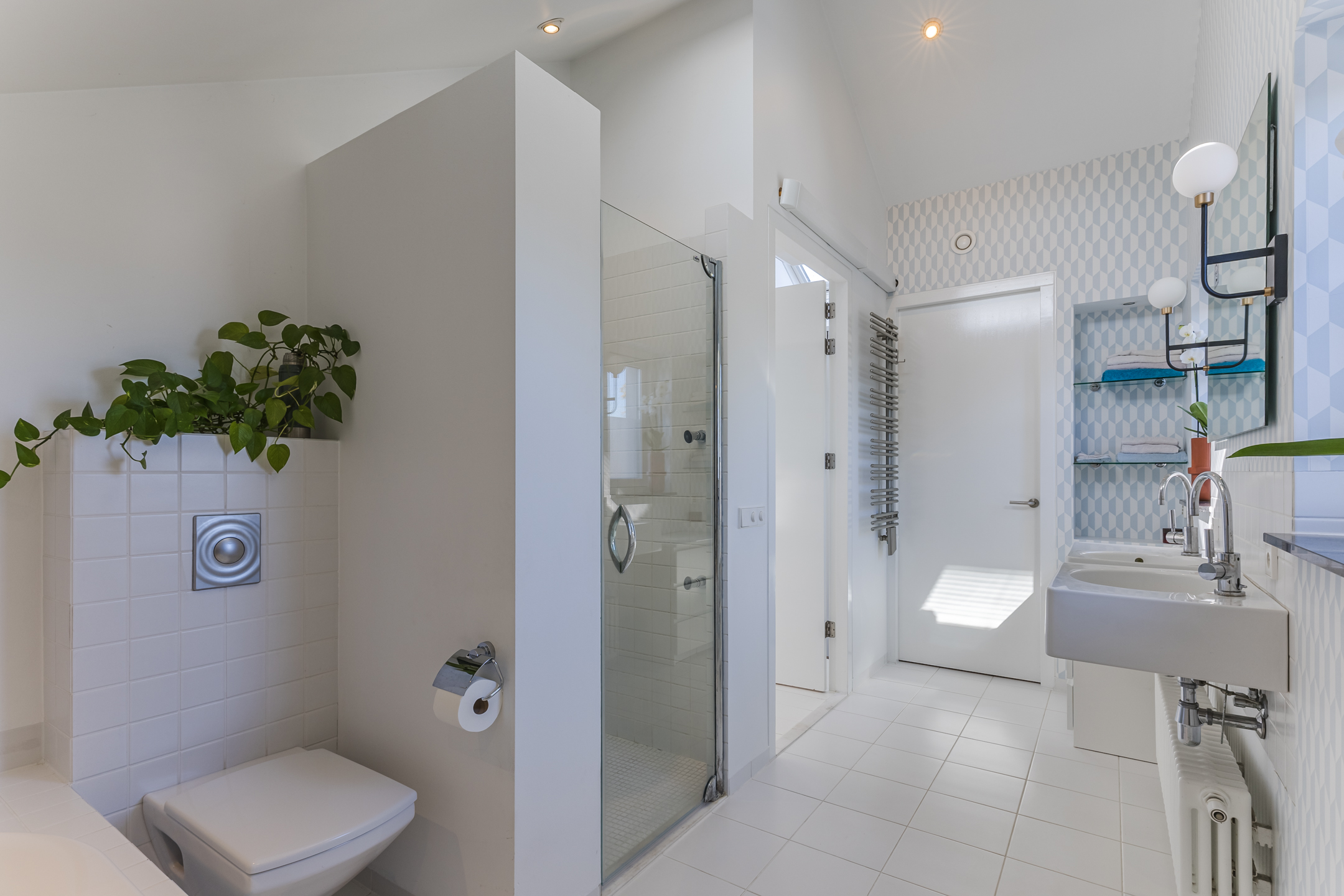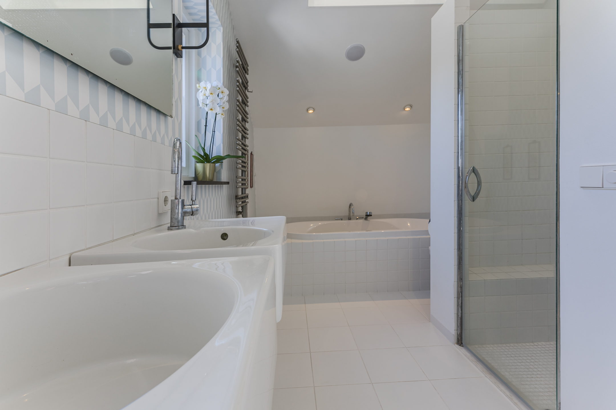 El amplio salón, con chimenea de gas, se conecta sin esfuerzo con una cocina-comedor luminosa y de acabado refinado. La calefacción por suelo radiante, los techos altos y materiales cuidadosamente seleccionados generan una sensación de confort, mientras que las puertas pivotantes permiten una sutil separación entre los ambientes. La cocina está equipada con electrodomésticos integrados, vistas al jardín y versatilidad tanto para la vida diaria como social. Los tres dormitorios, servidos por un baño bien equipado con suelo radiante y ducha a ras de suelo, muestran un acabado exquisito y discreto.