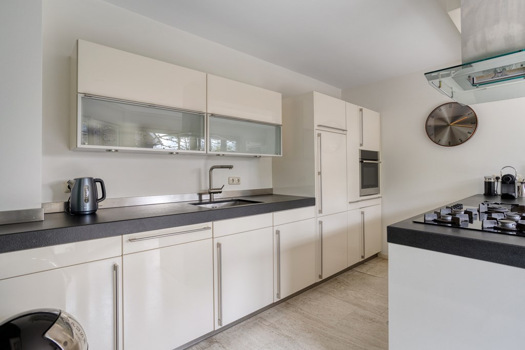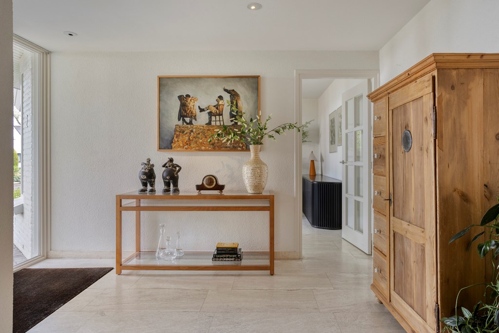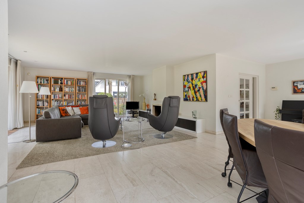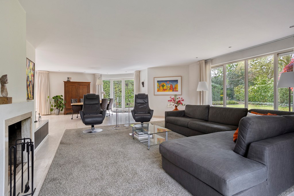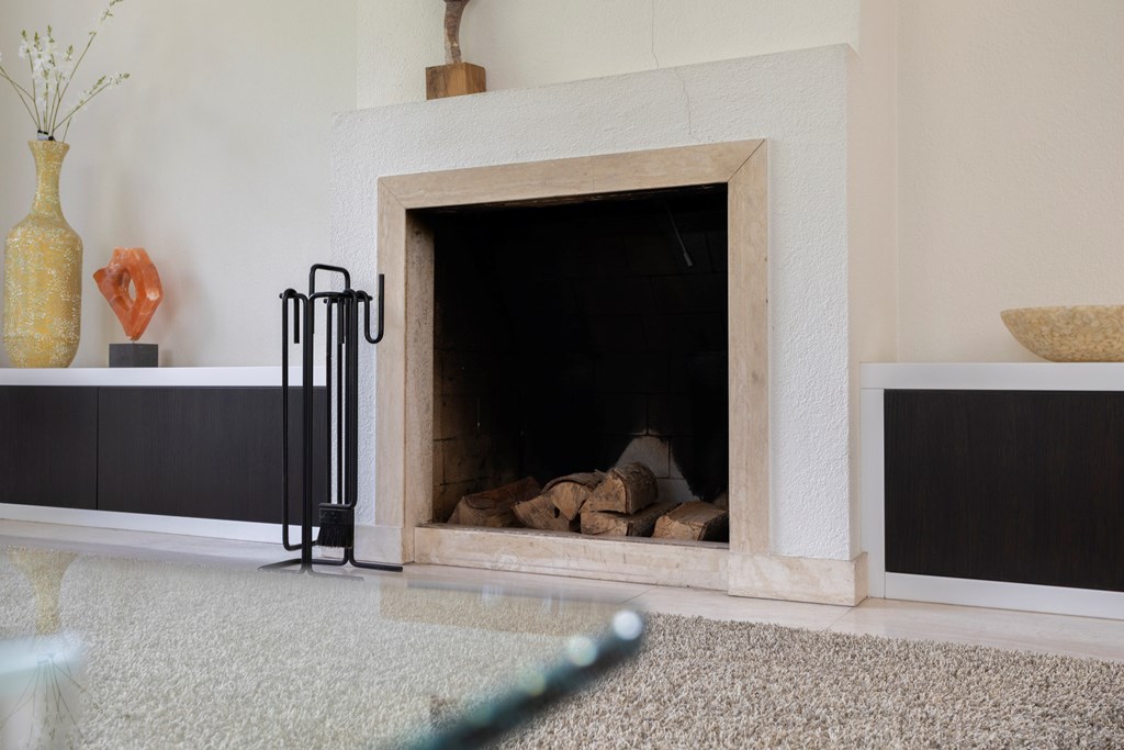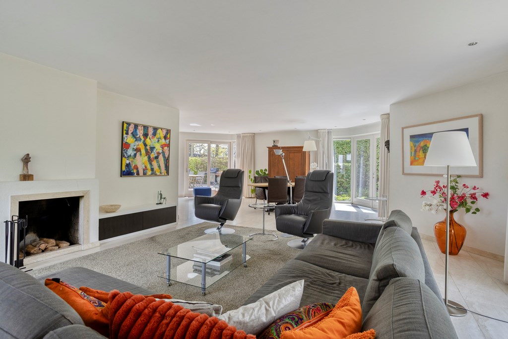 La luminosa sala de estar, presidida por una imponente chimenea y acceso directo al jardín a través de puertas francesas, constituye un núcleo armónico para la vida diaria. La cocina contemporánea de planta abierta, con una isla alargada y electrodomésticos integrados, responde tanto a las necesidades funcionales como a las sociales. Entre sus características destacan la calefacción por suelo radiante en la planta baja y 25 paneles solares, que subrayan el compromiso con la sostenibilidad y el bienestar.