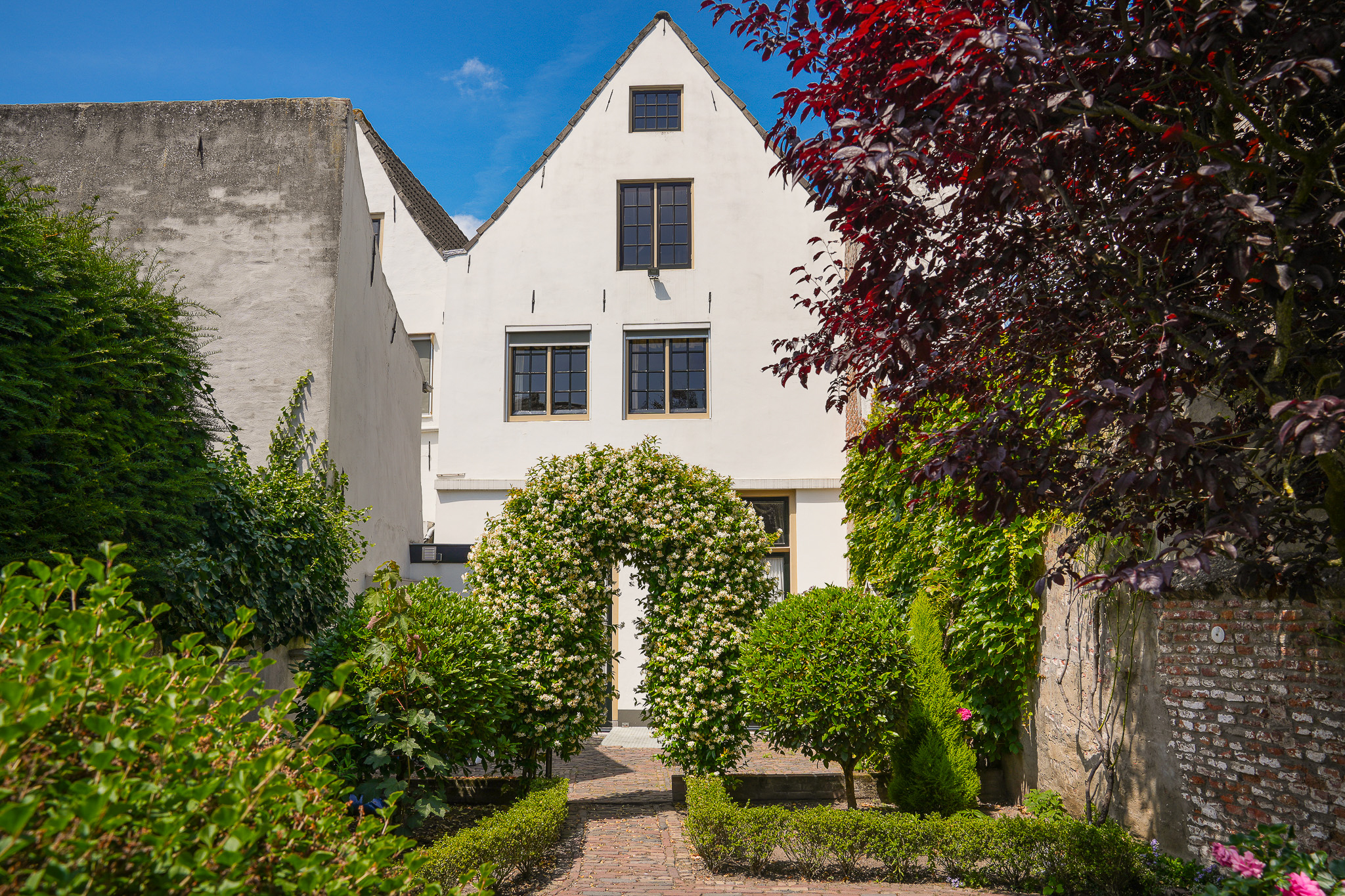 This floor radiates the atmosphere of the 16th century. At the front is a 40 m² bedroom that once served as a living room. Three large sash windows offer views of the broad Gasthuisstraat. The floor features wide wooden planks, and there are two built-in cupboards. At the rear is an even more imposing bedroom with a beam-and-rafter ceiling, white-painted wide floorboards, and a full-width fitted wardrobe with elegant panel doors. Two sash windows provide views of the garden.
