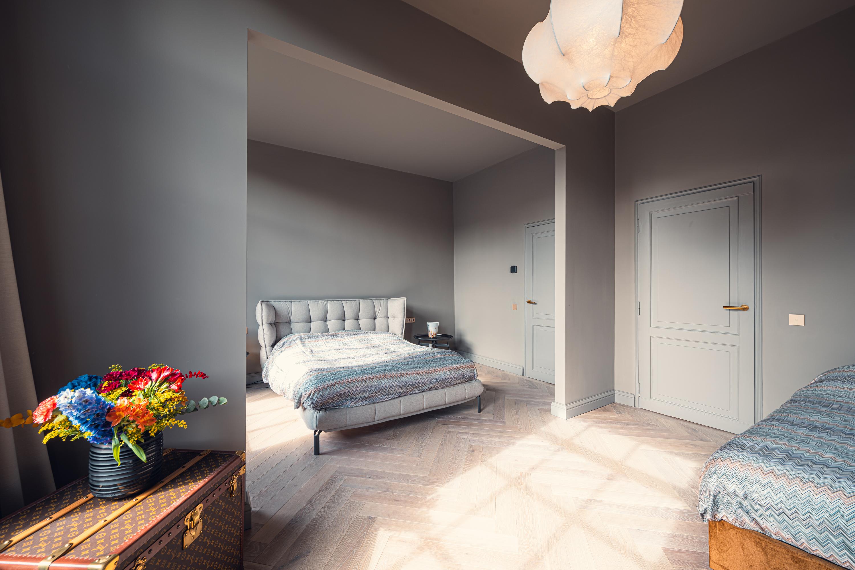 As soon as you step inside, the refined finishes are immediately apparent: high ceilings, paneled doors, a wooden floor with a black inlay border, and tasteful color choices create a luxurious and warm atmosphere.