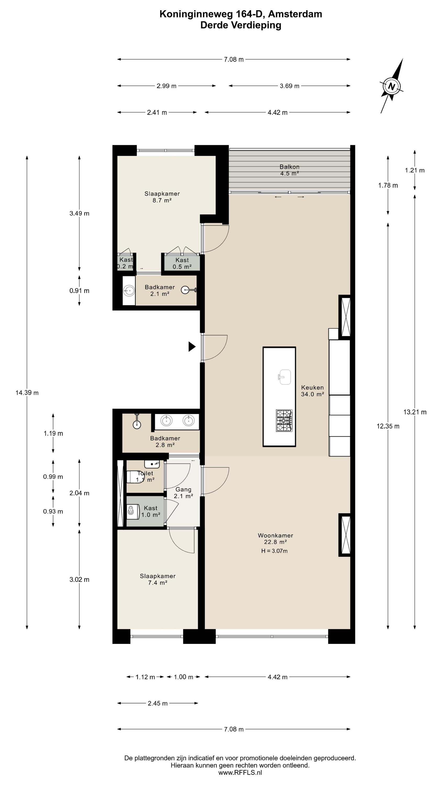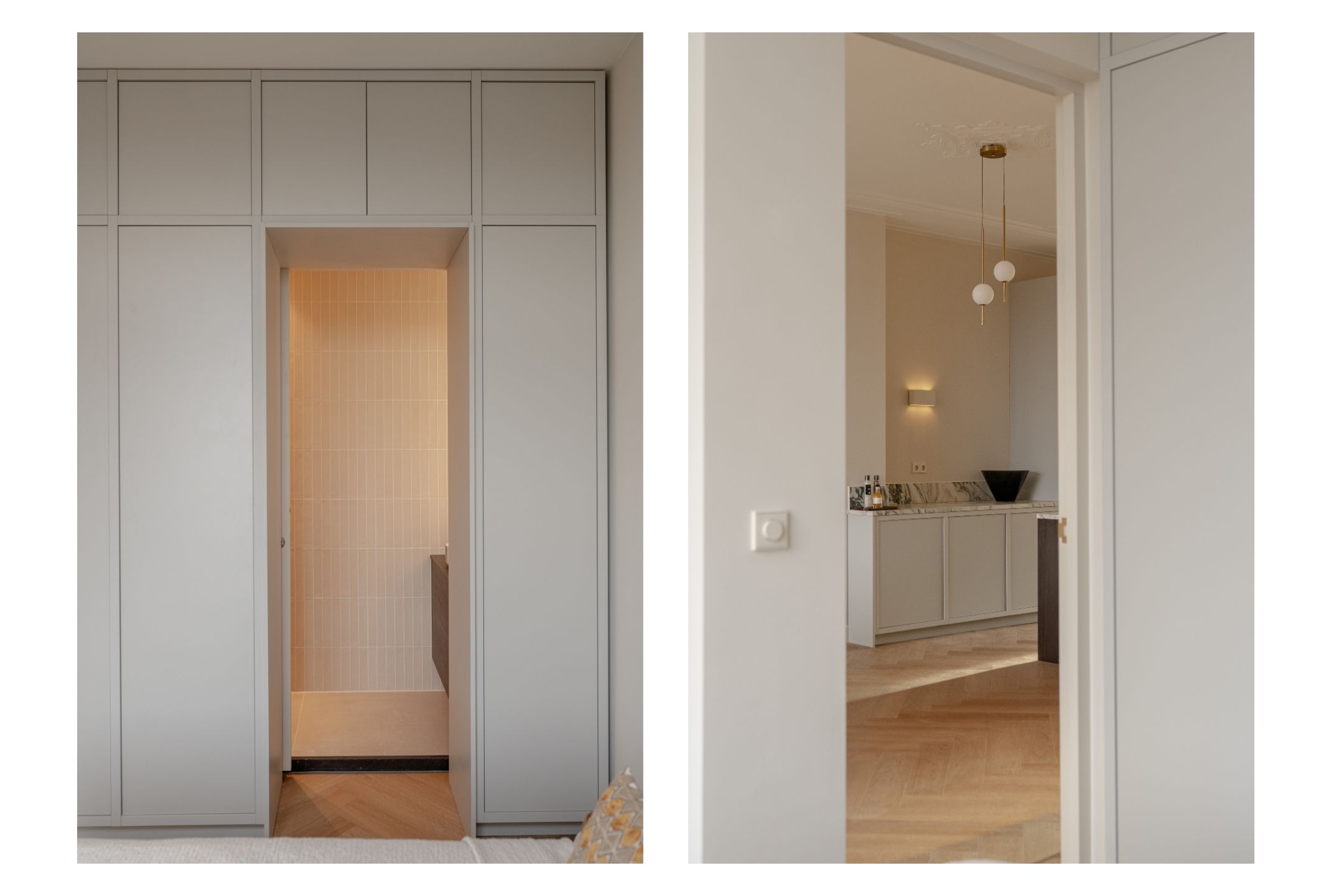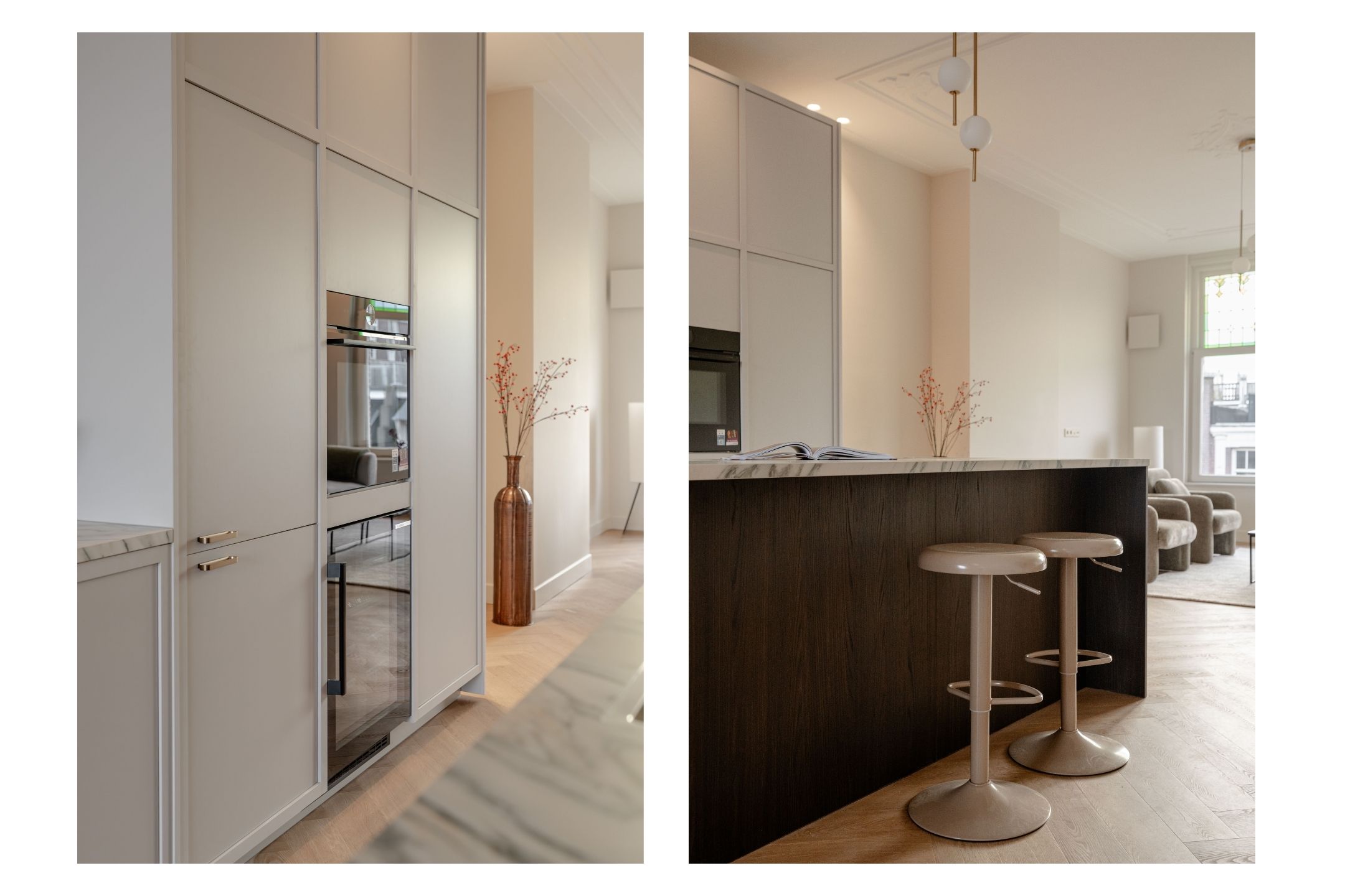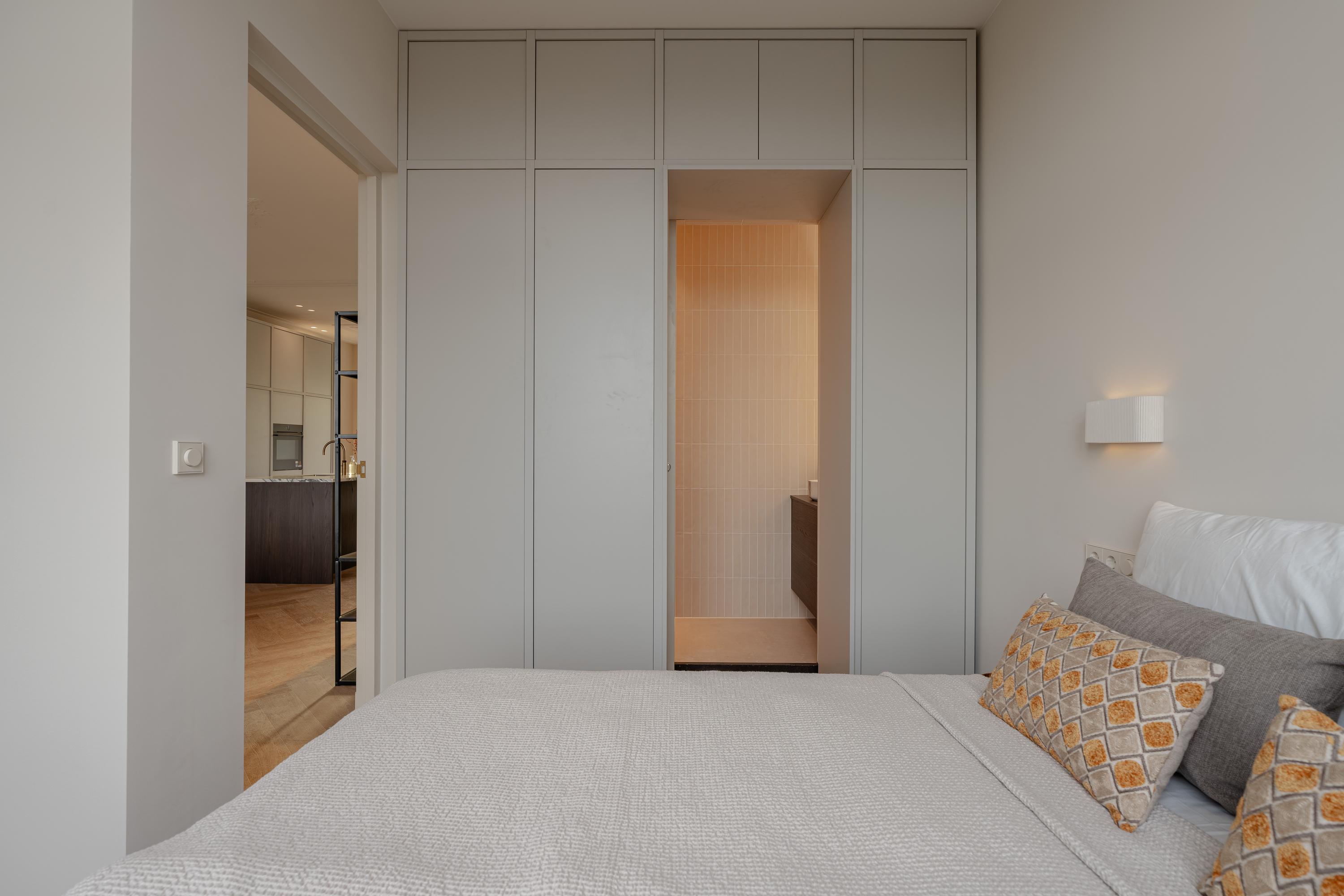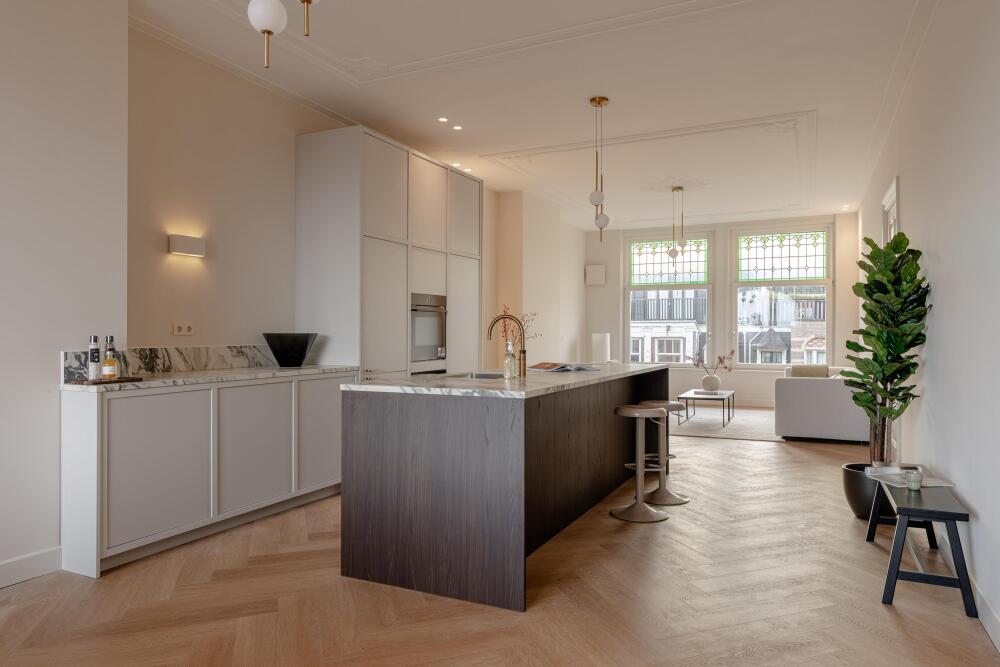 L’espace de vie ouvert se distingue par une lumière naturelle généreuse, grâce aux grandes fenêtres en façade et à l’arrière, soulignée par une hauteur sous plafond d’environ 3,07 mètres. La cuisine haut de gamme constitue le cœur convivial de l’appartement, avec un îlot spacieux doté de plaques à induction, d’un robinet Quooker, d’électroménagers intégrés et d’un espace bar propice aux conversations détendues. Deux chambres et deux salles de bains offrent intimité et confort ; la suite principale dispose d’armoires encastrées et d’une salle d’eau privative avec douche à l’italienne. La seconde salle de bains a été pensée pour accueillir famille et invités.
