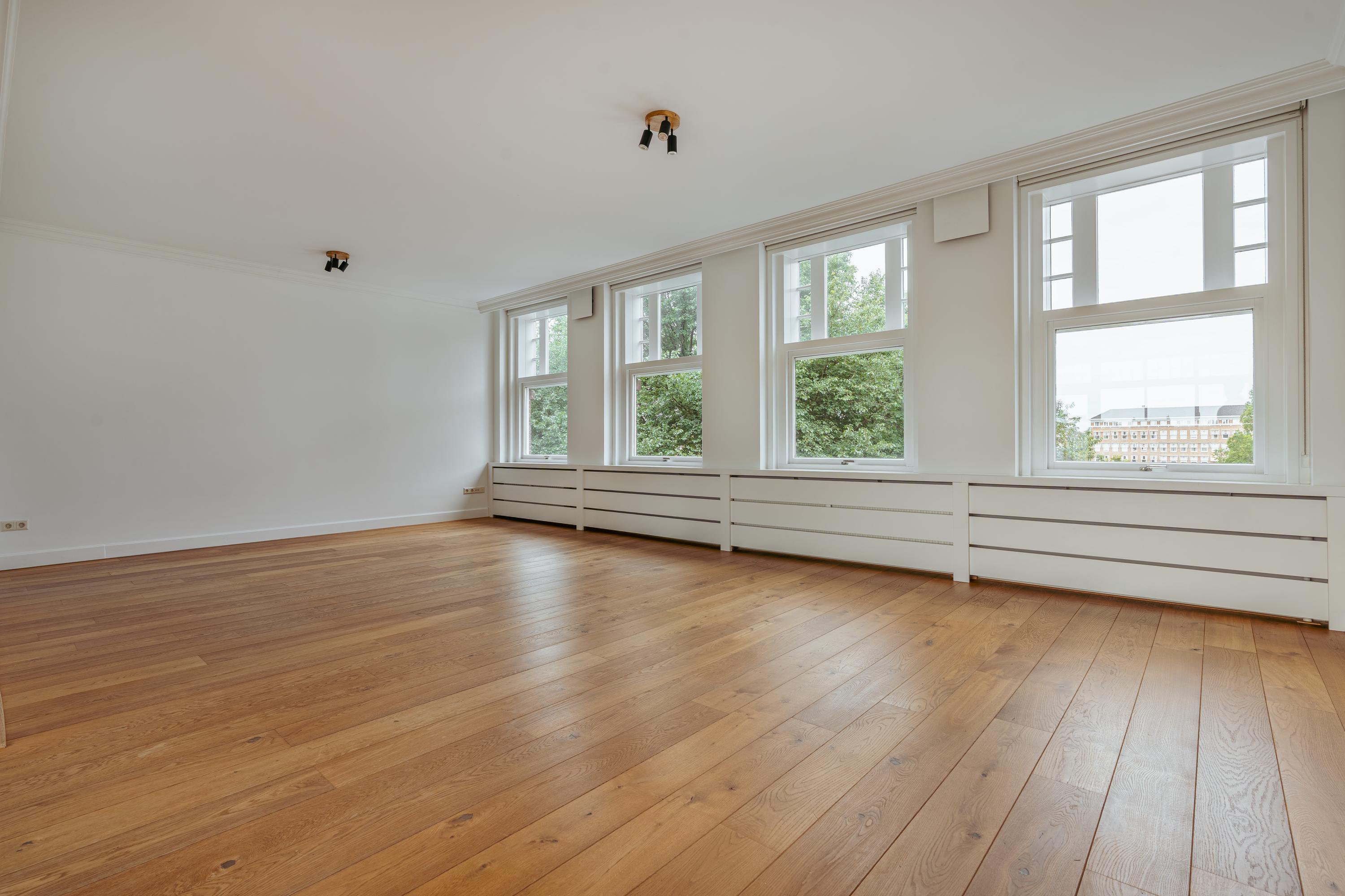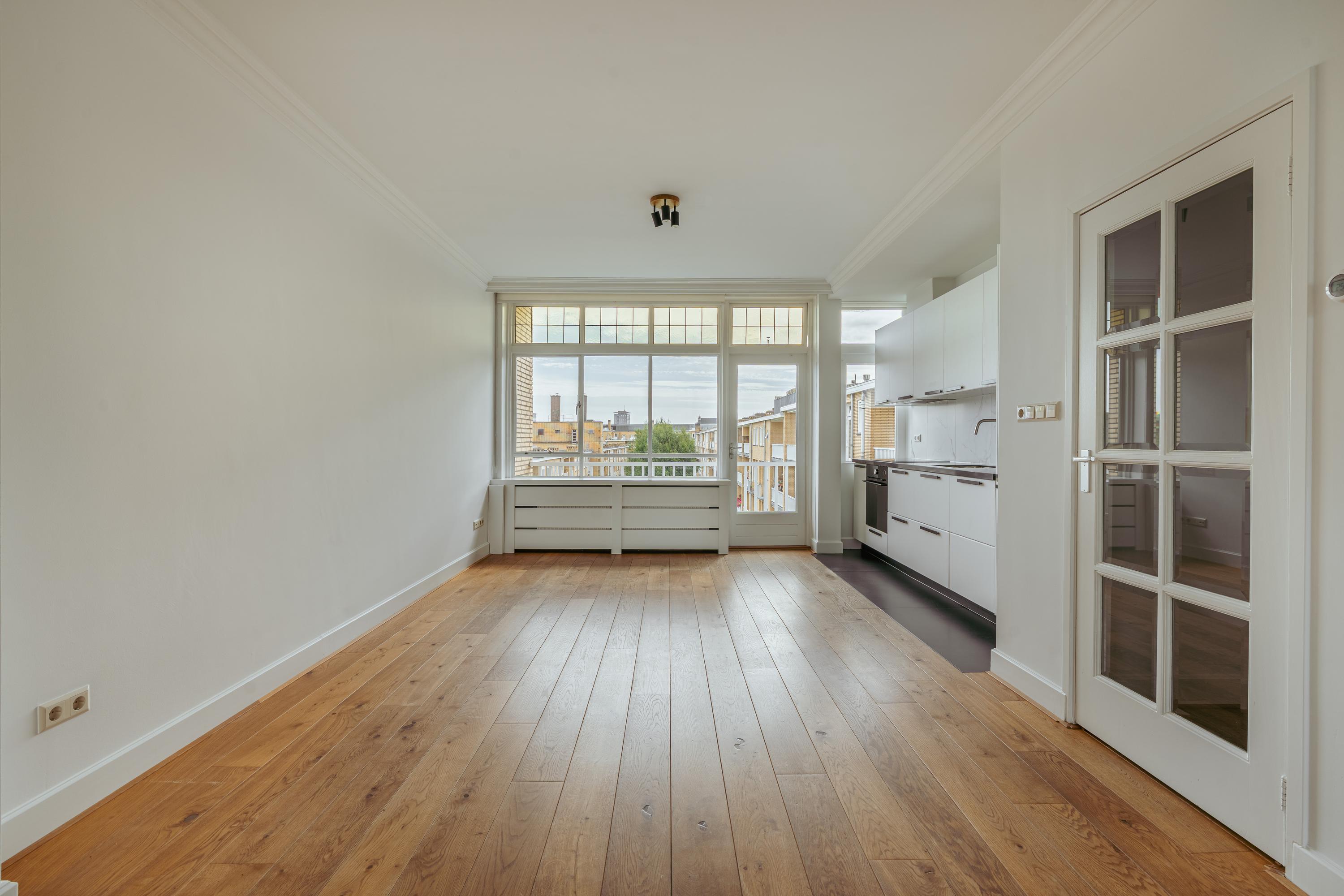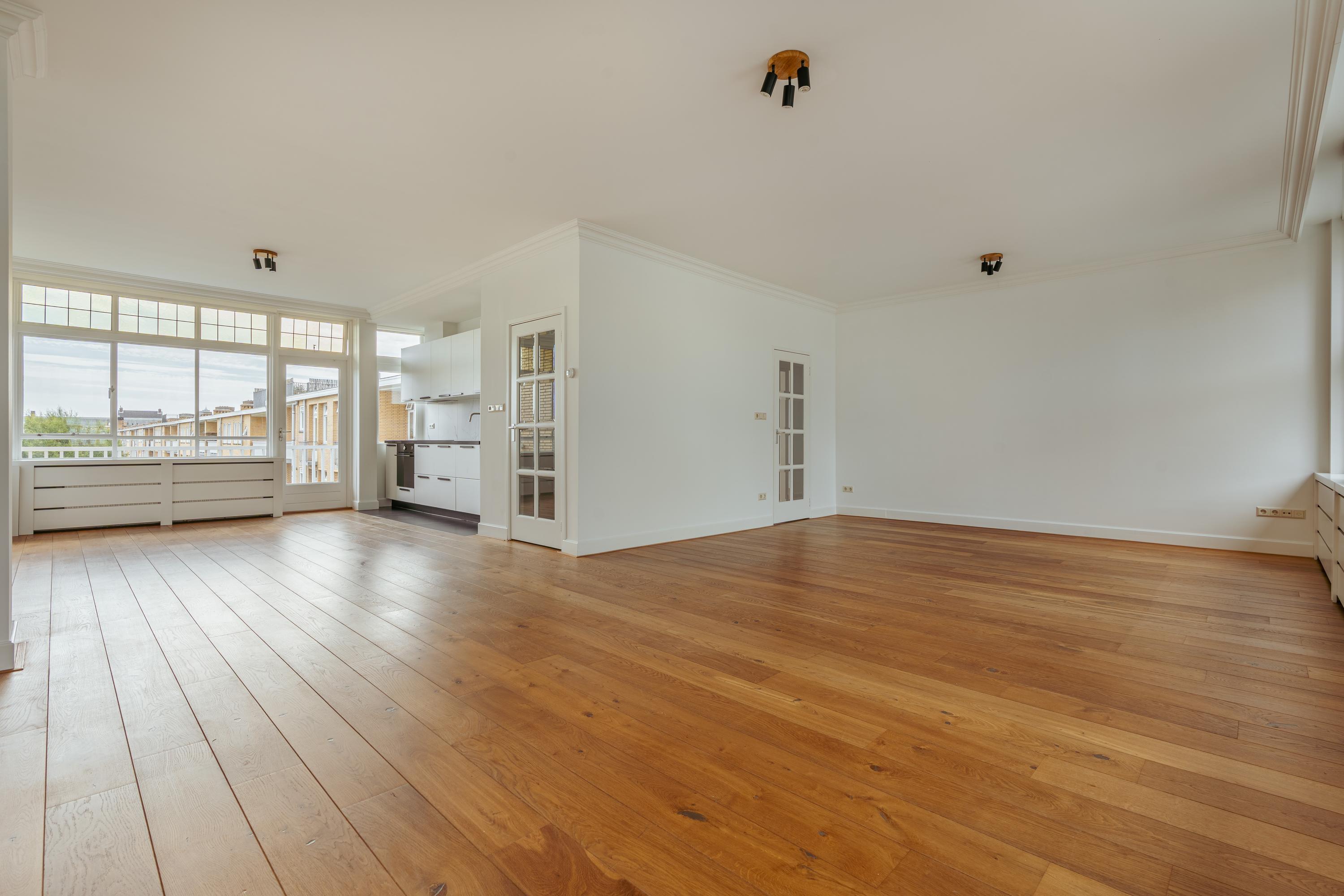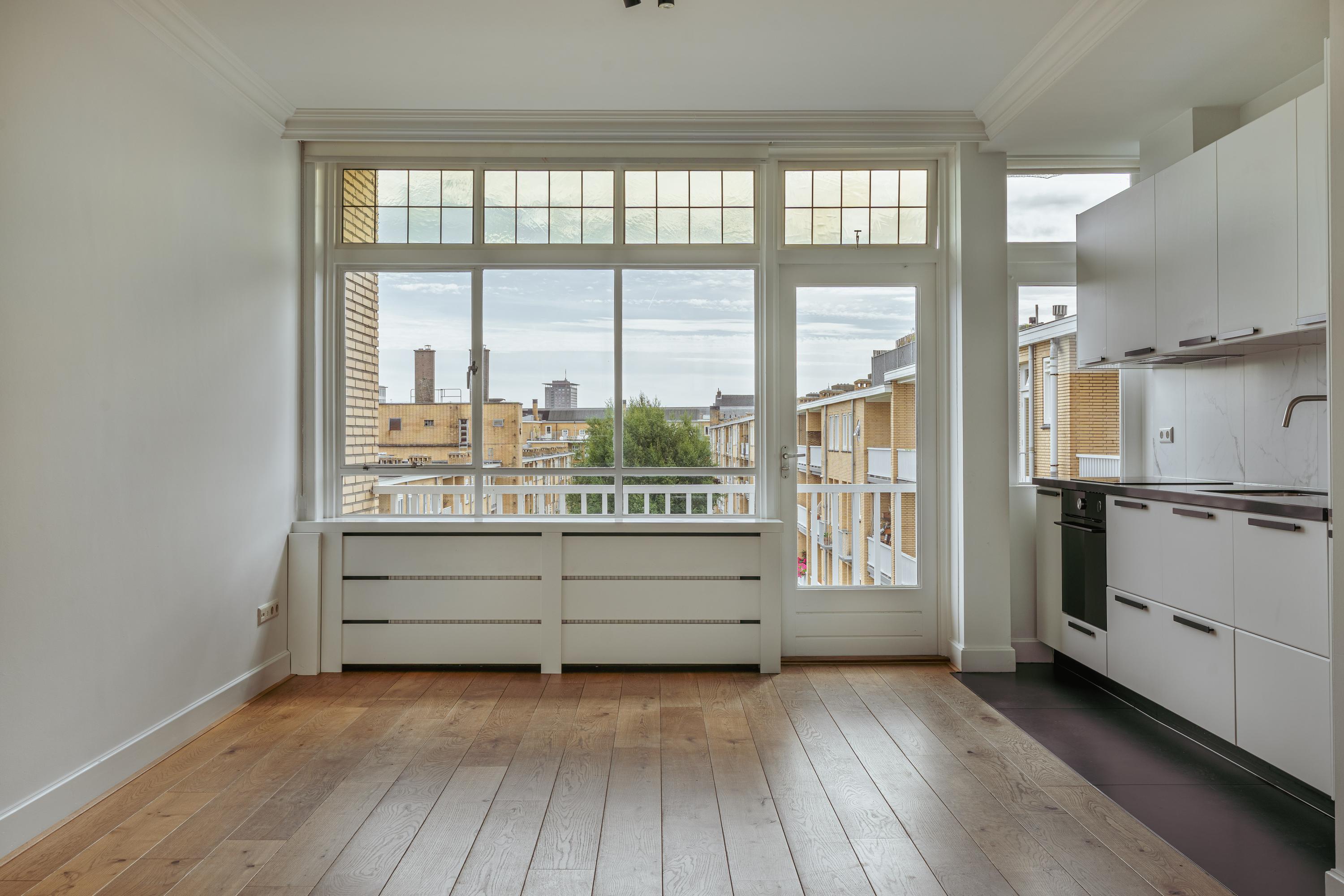 Un large hall d’entrée mène au séjour, un espace de 39,5 m² baigné de lumière naturelle grâce aux grandes fenêtres offrant une vue dégagée sur les espaces verts de Minervaplein. La cuisine moderne, ouverte et équipée d’appareils intégrés de qualité, s’ouvre sur un balcon orienté nord-est, créant ainsi un équilibre subtil entre intérieur et extérieur.