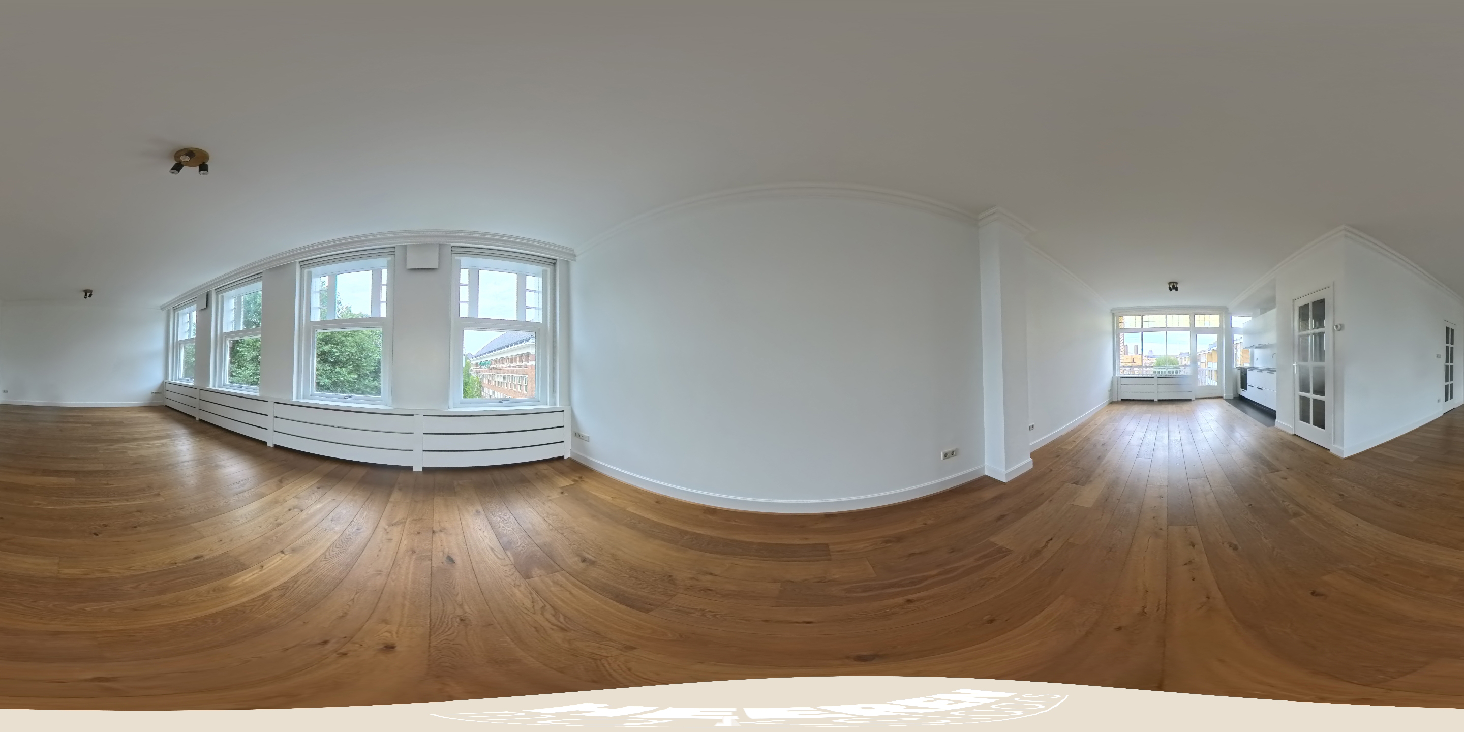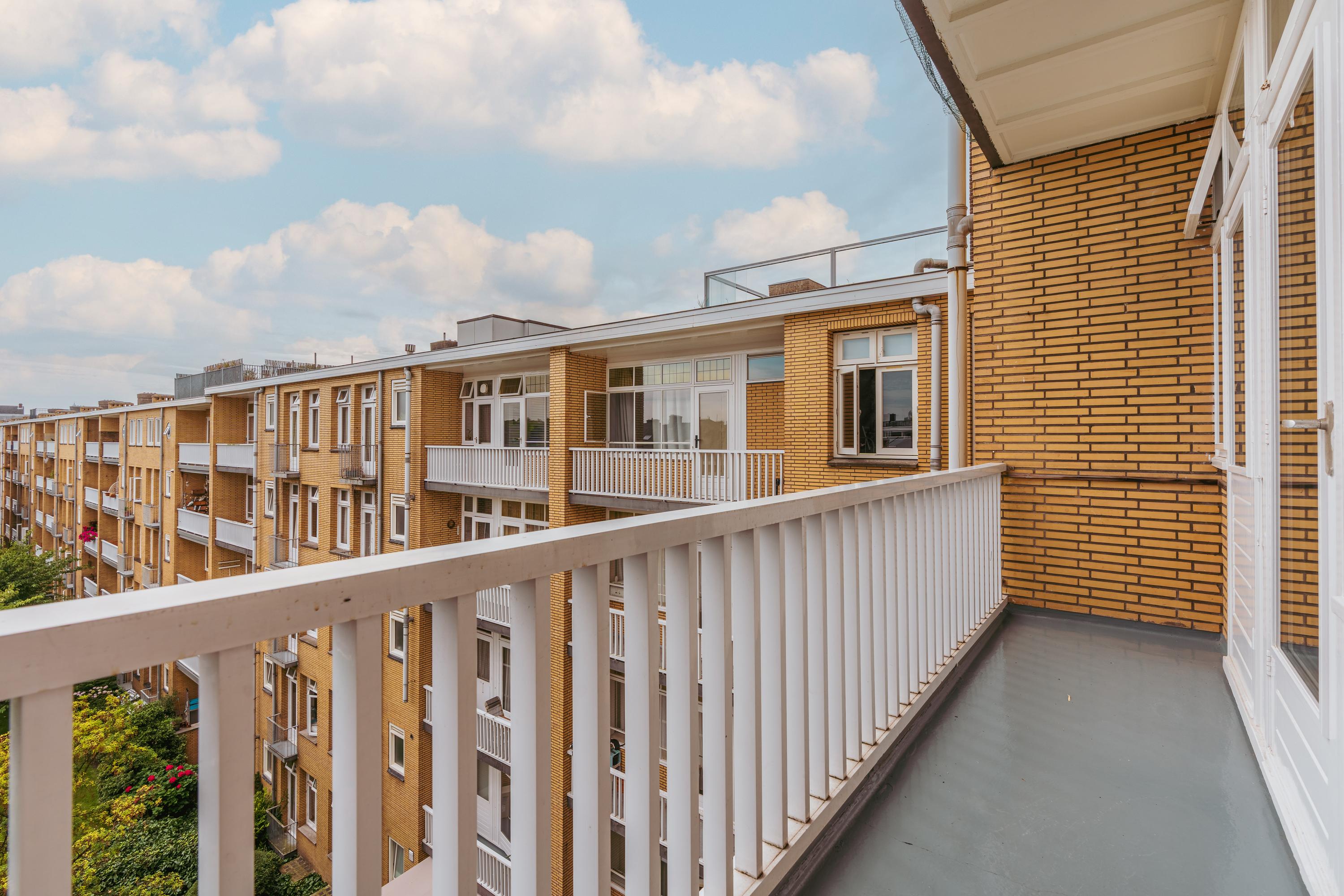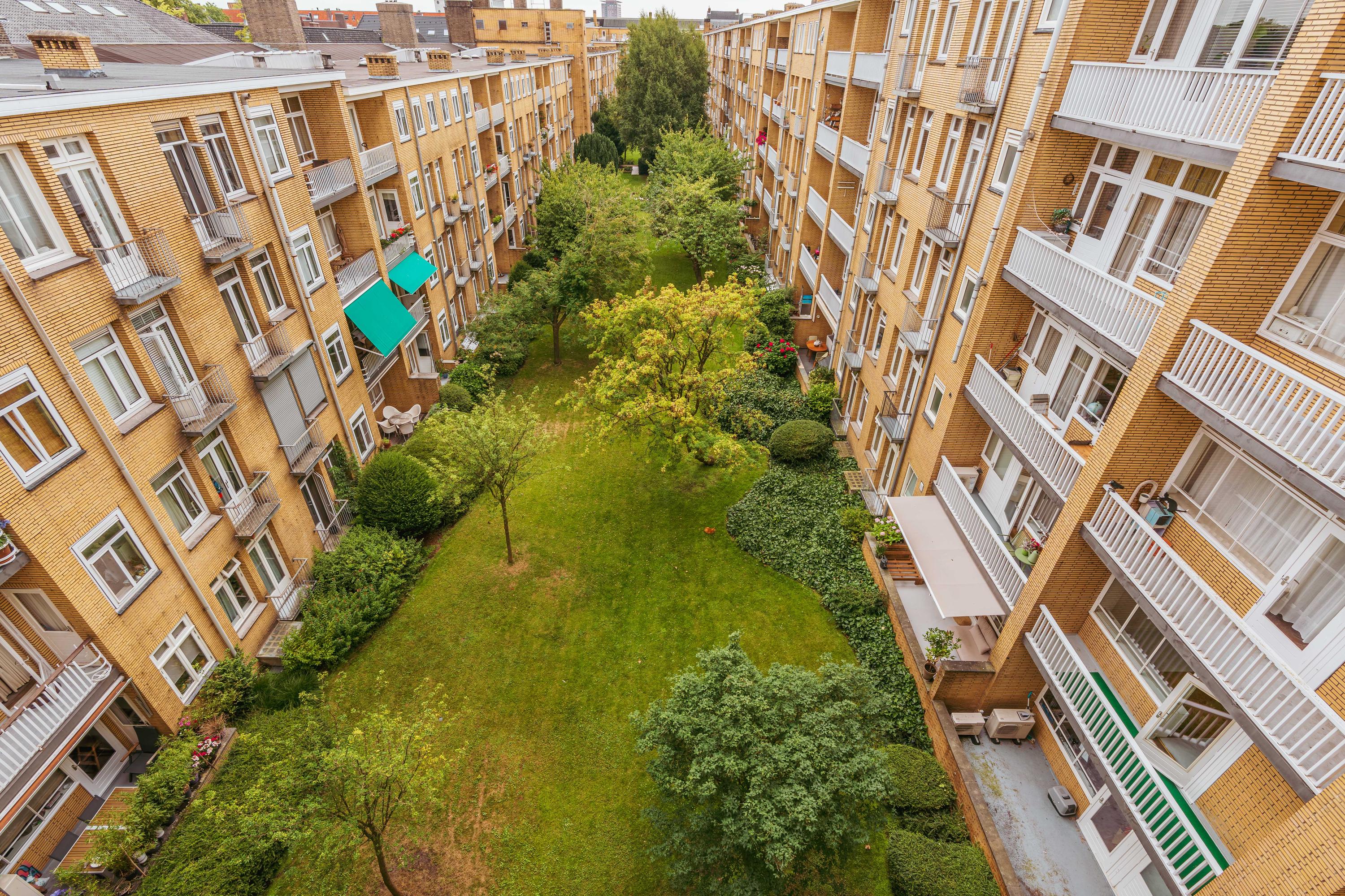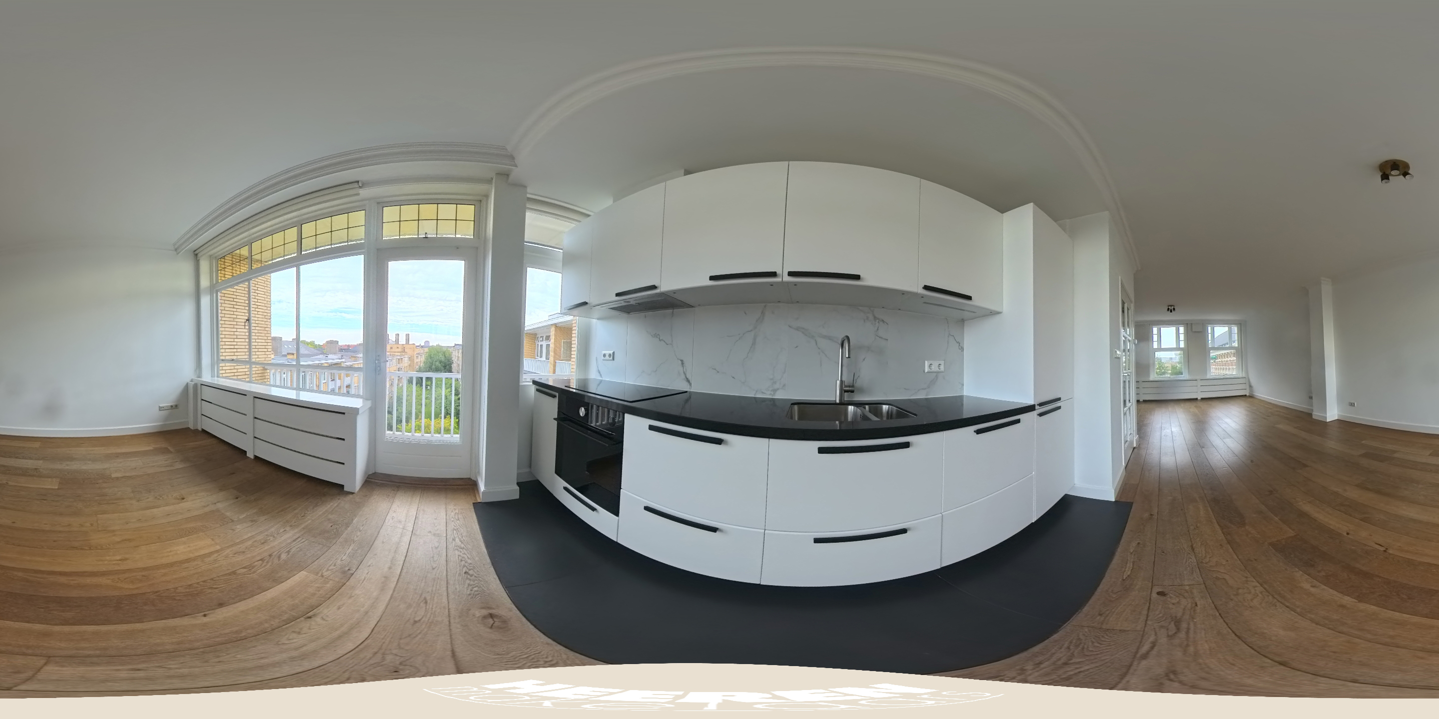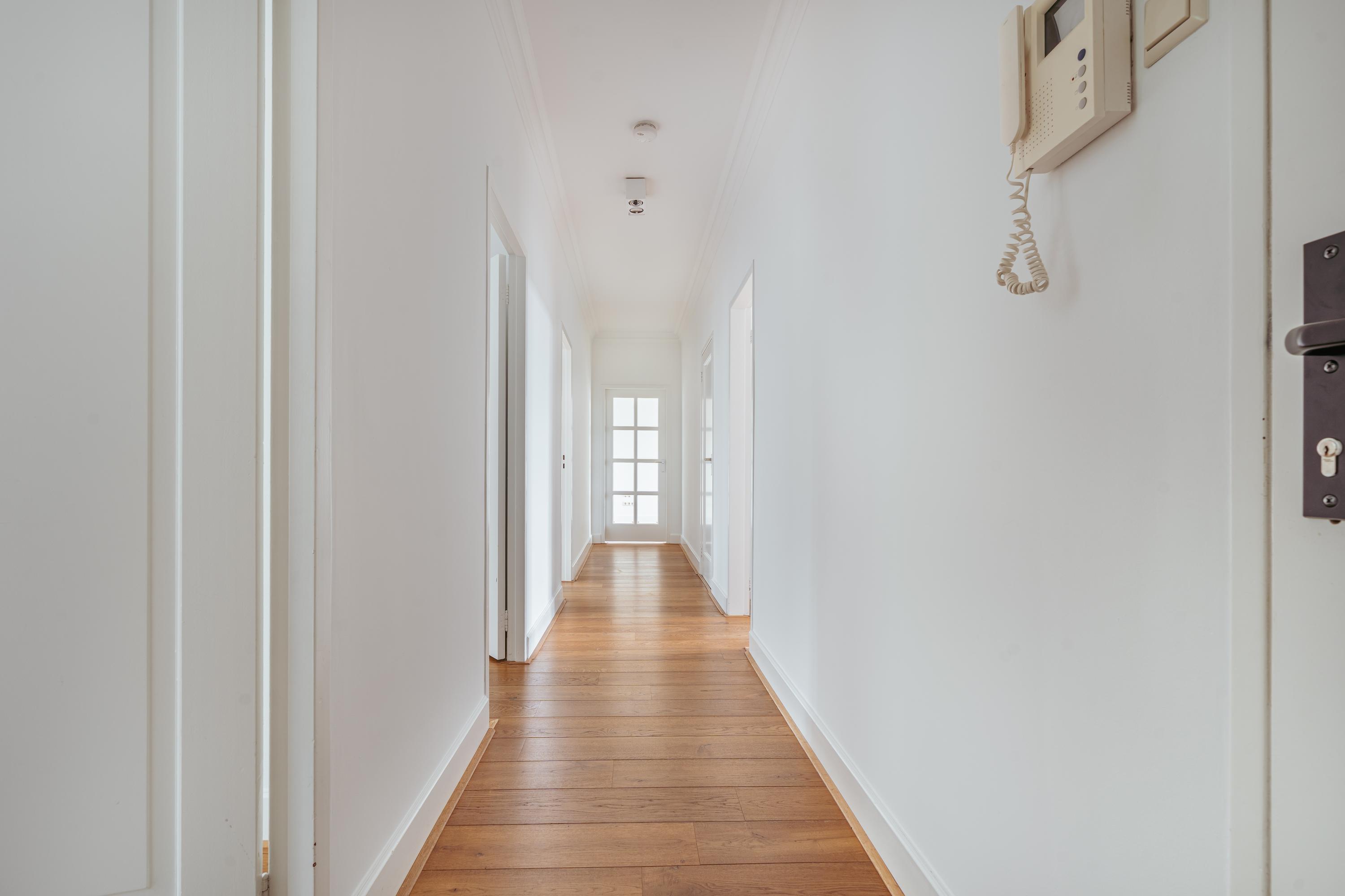 Un large hall d’entrée mène au séjour, un espace de 39,5 m² baigné de lumière naturelle grâce aux grandes fenêtres offrant une vue dégagée sur les espaces verts de Minervaplein. La cuisine moderne, ouverte et équipée d’appareils intégrés de qualité, s’ouvre sur un balcon orienté nord-est, créant ainsi un équilibre subtil entre intérieur et extérieur.