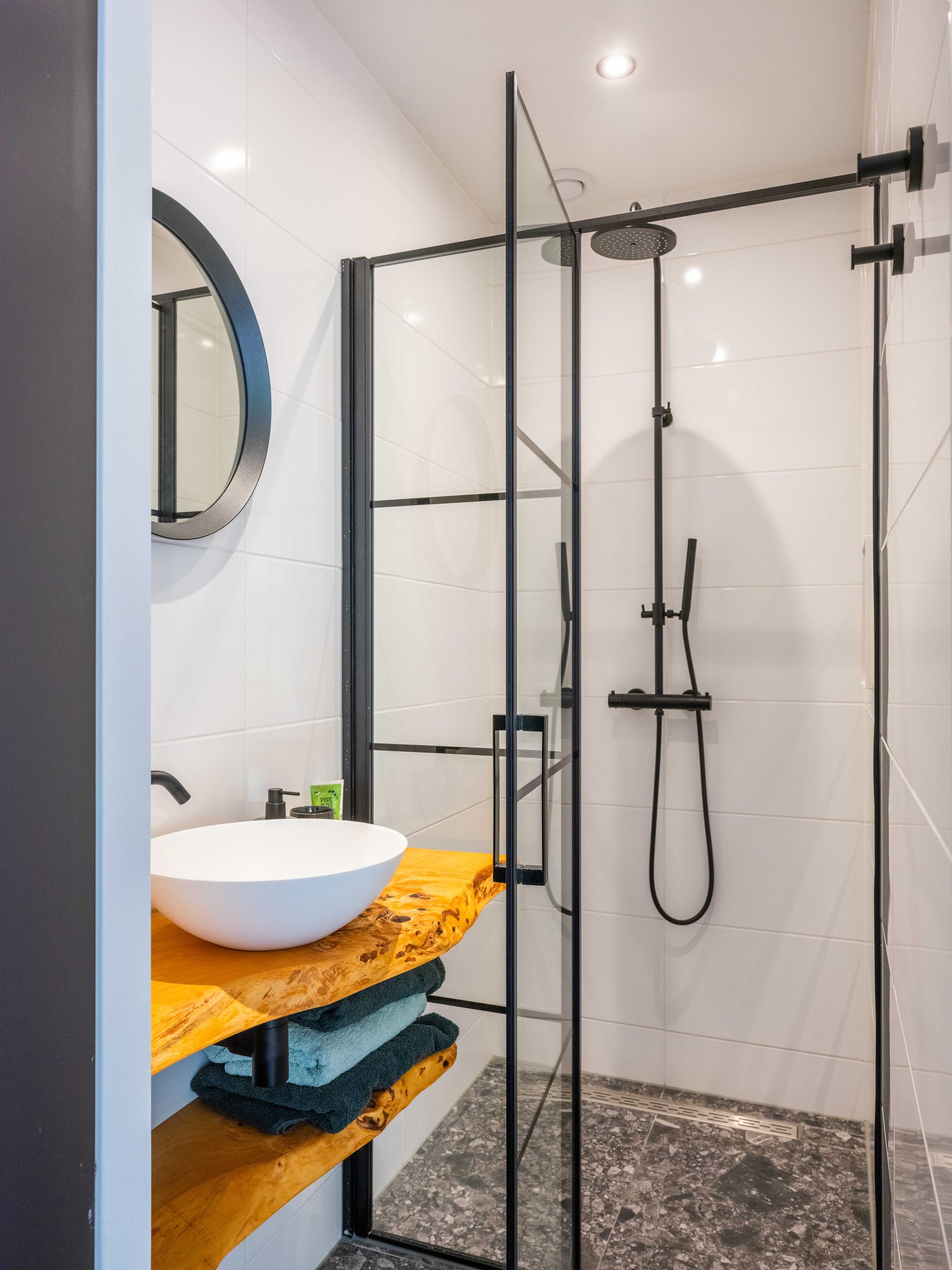 L’entrée révèle un salon à aire ouverte et une cuisine entièrement équipée, imaginés pour ceux qui savourent tant la cuisine que la convivialité. Le rythme de l’espace est donné par un escalier remarquable menant à l’étage, où deux chambres paisibles et deux salles de bains raffinées offrent un confort quotidien. Des placards sur mesure et un espace de travail dédié renforcent la fluidité du plan en mezzanine, préservant cette sensation d’espace.