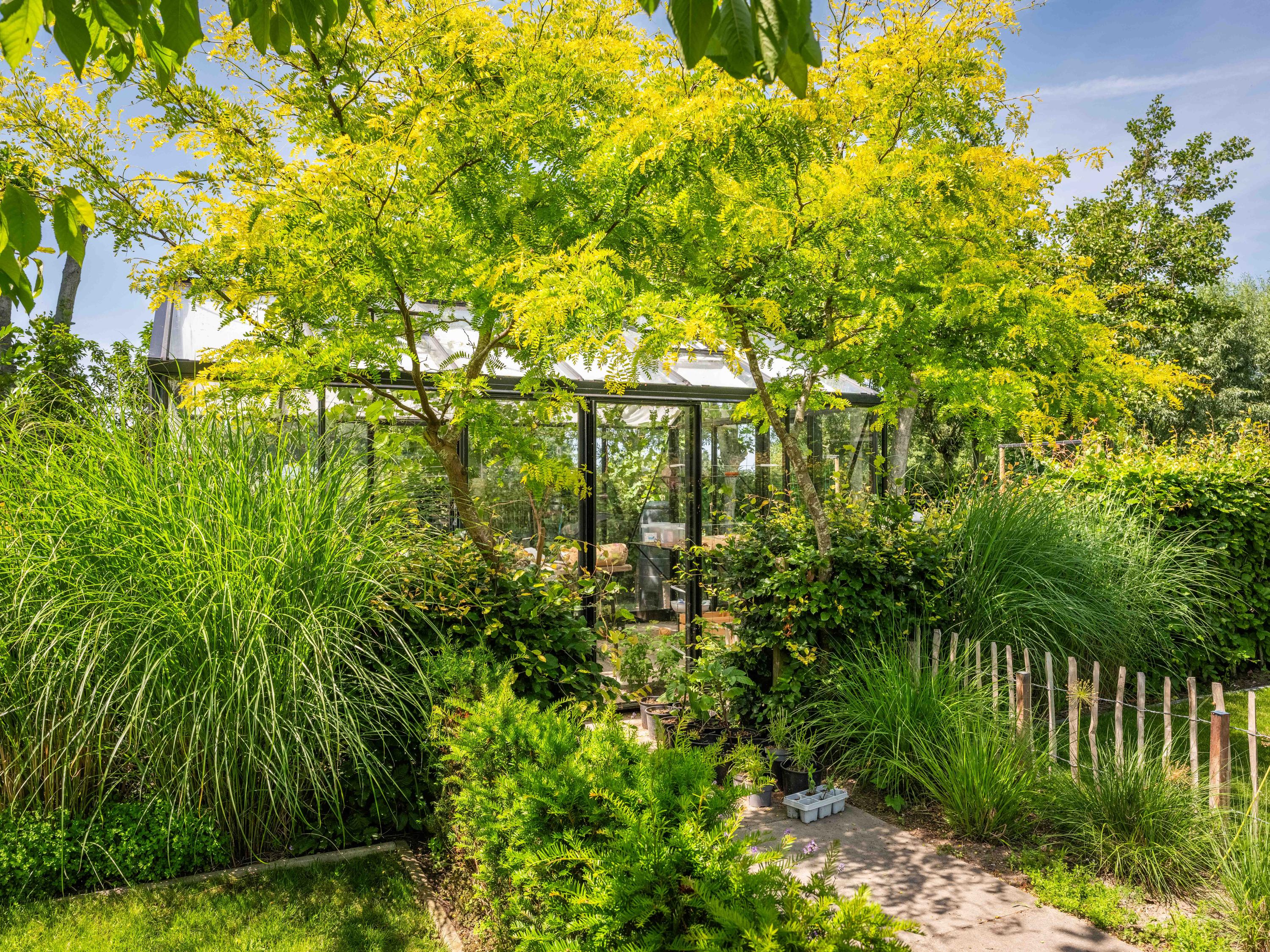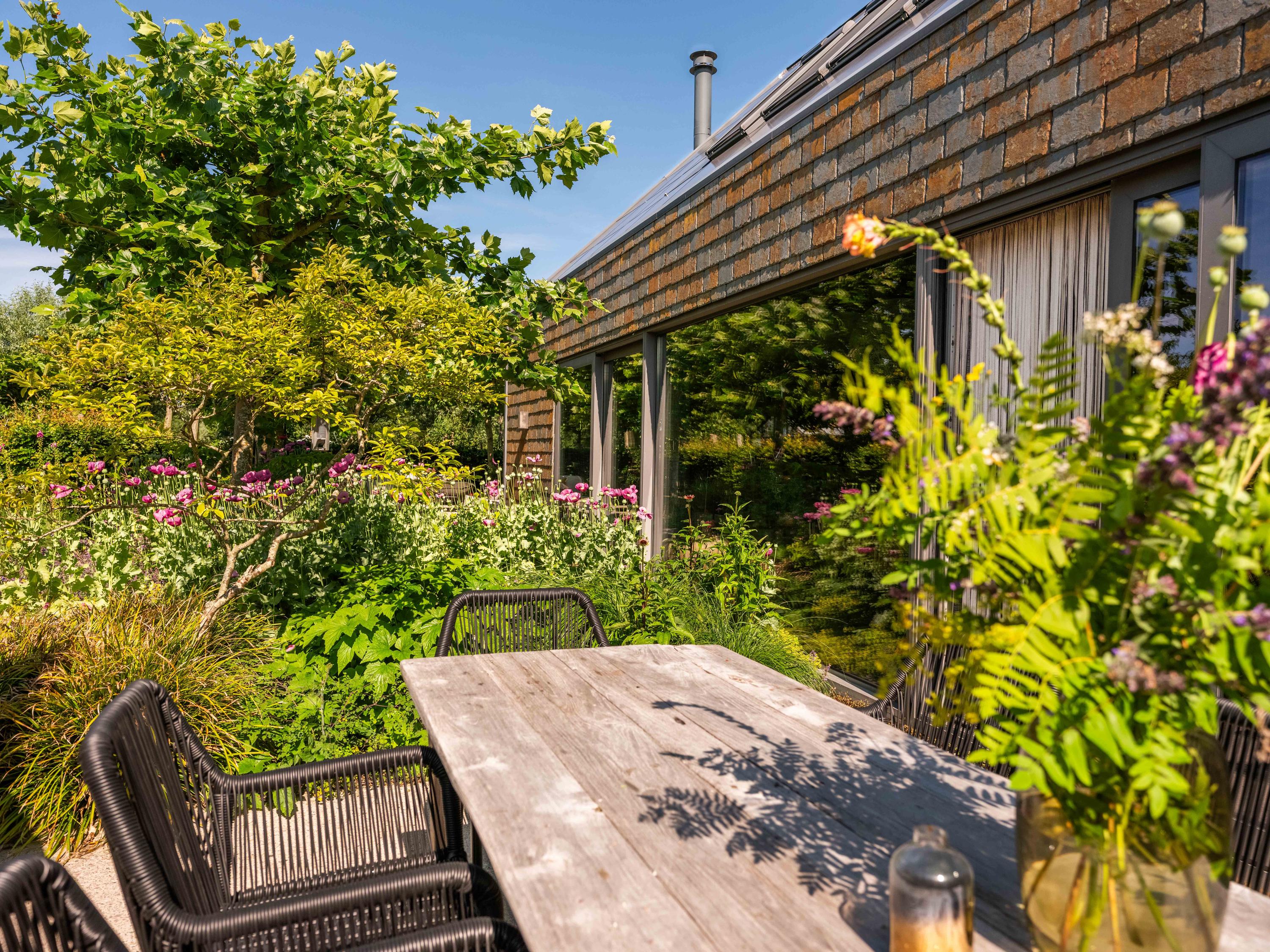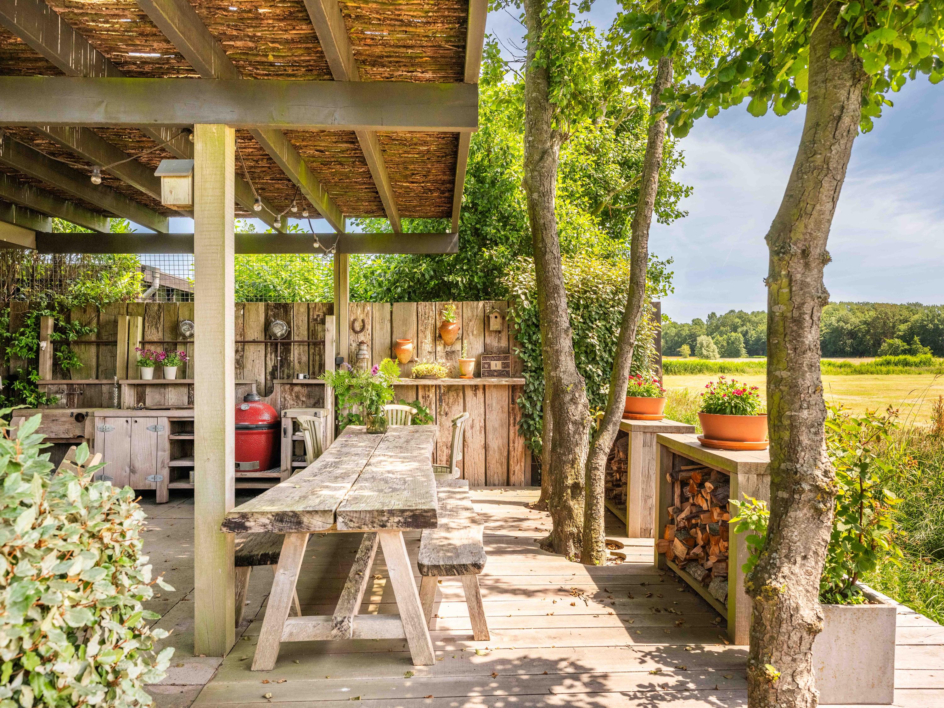 Le terrain paysager propose différents havres de détente ou d’inspiration : serre, jardin potager, poulailler et vaste terrasse conçue pour vivre dehors. La vue, libre et verdoyante, s’étend à l’infini, offrant paix et beauté contemplative.