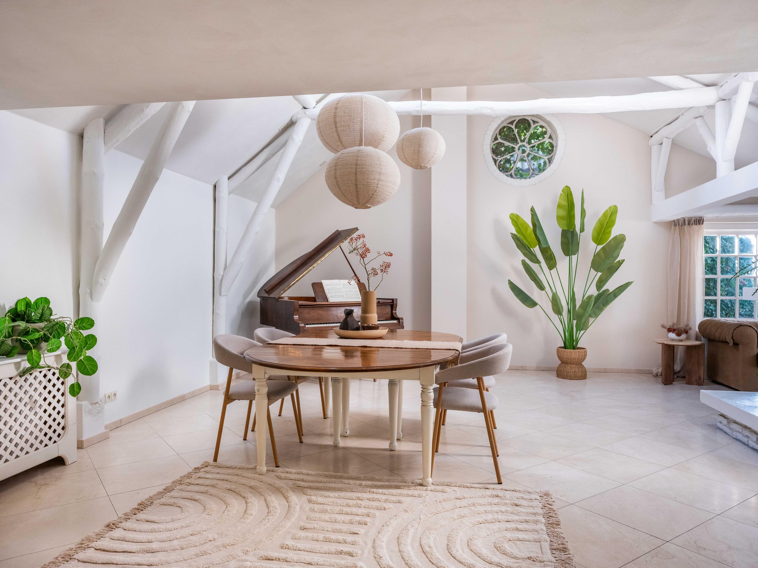 Le salon est centré autour d’une cheminée à gaz, rehaussée de poutres apparentes et de vitraux qui rappellent le patrimoine de la villa. Les hauts plafonds font entrer abondamment la lumière naturelle, tandis que la cuisine attenante, équipée d’appareils intégrés, communique avec une arrière-cuisine dotée de tout le confort moderne. À l’étage, la chambre principale s’ouvre sur une vaste terrasse, idéale pour admirer les couchers de soleil sur la campagne. La salle de bains à l’étage, rénovée en 2018, dispose d’une baignoire, d’une douche à l’italienne et d’une double vasque.