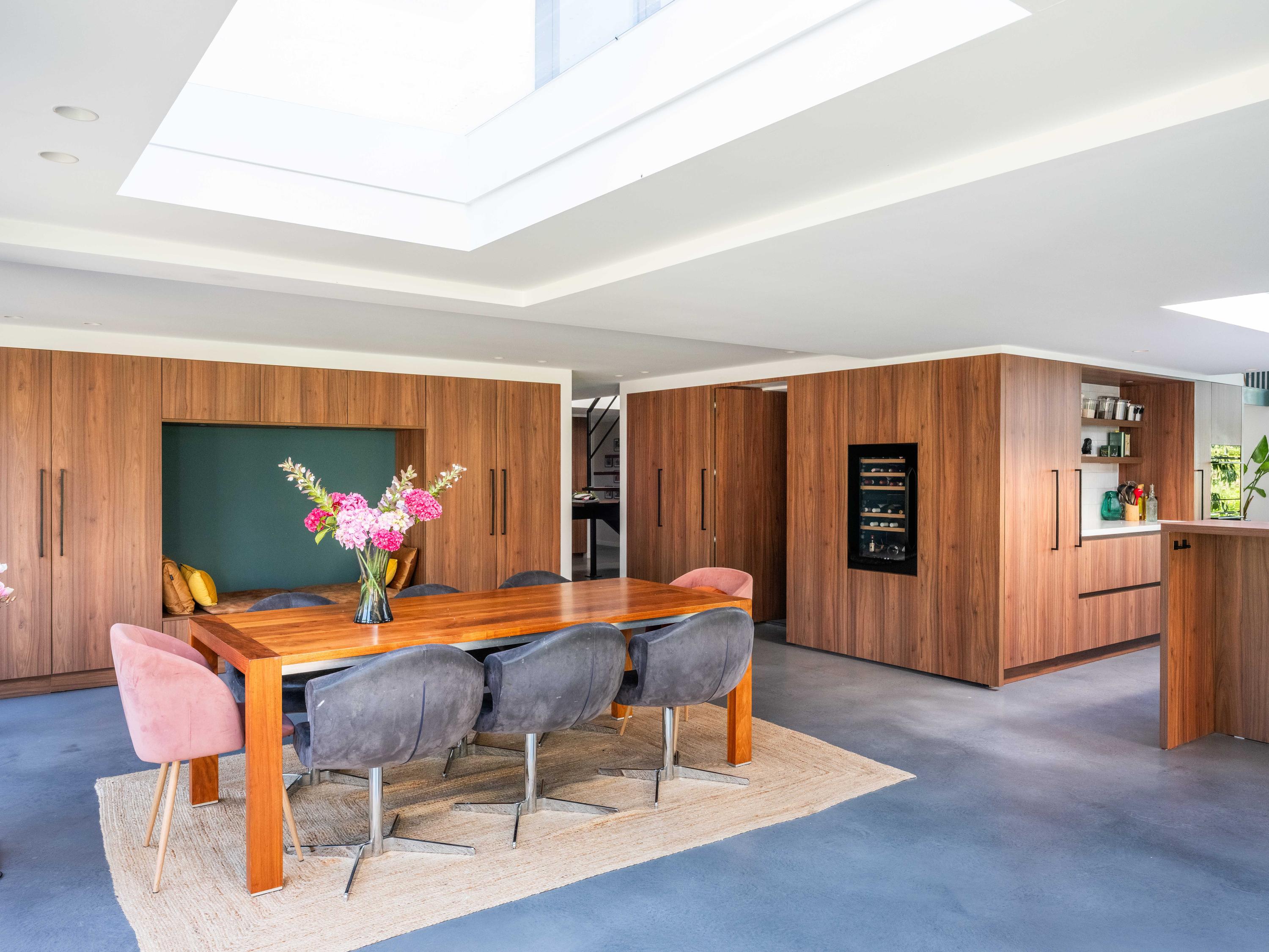 Le rez-de-chaussée baigné de lumière s’ouvre sur un hall d'entrée conçu sur mesure, un séjour chaleureux aux vues dégagées et une cuisine équipée d’appareils haut de gamme, d’une armoire à vin climatique et d’un mur architectural en noyer révélant un espace utilitaire dissimulé. La suite principale, également au rez-de-chaussée, dispose d’un dressing et d’une salle de bain type spa avec douche à l’italienne, baignoire, double vasque, chauffage au sol et accès direct à la quiétude du jardin.