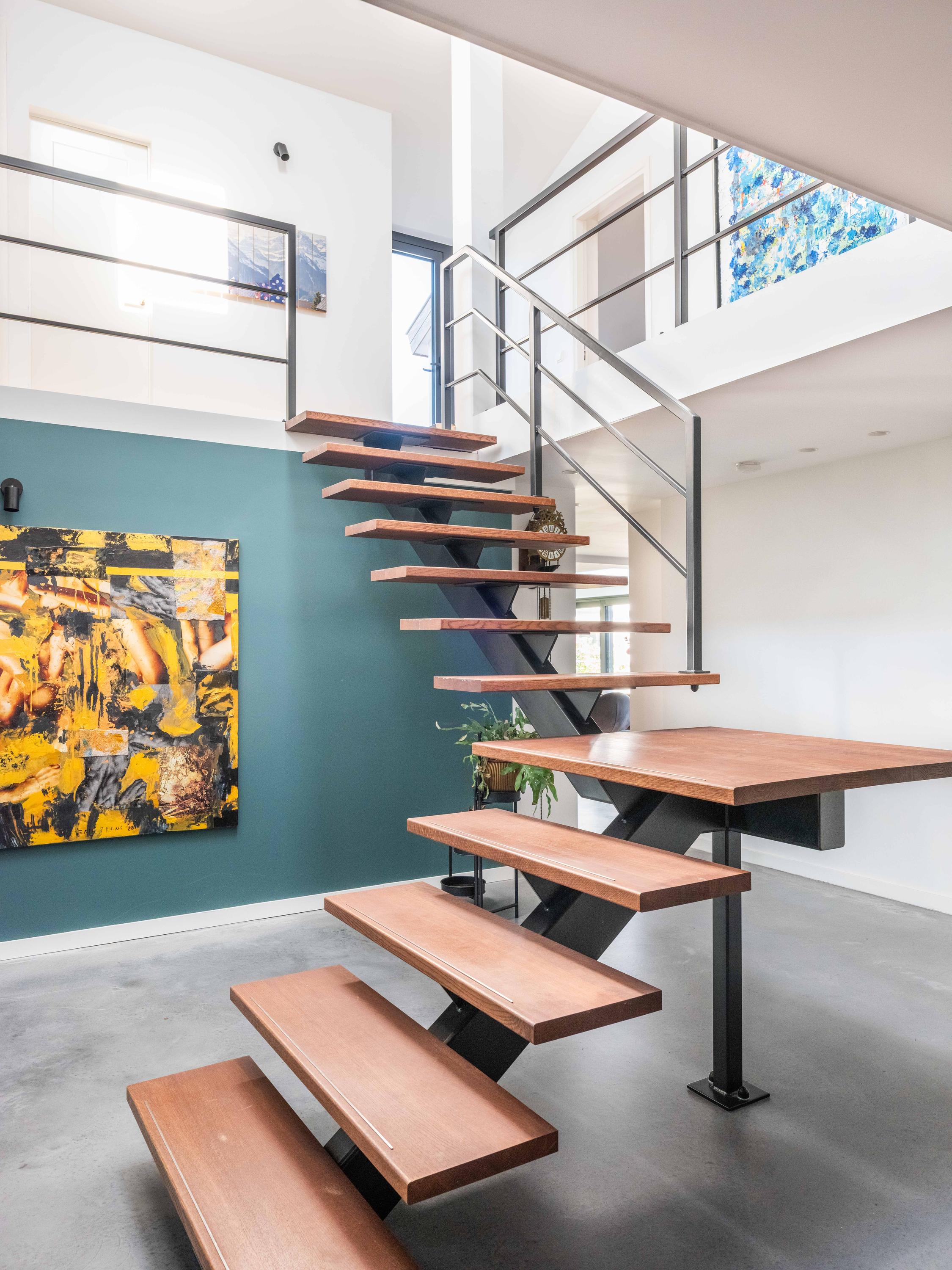 À l’étage, trois chambres, un bureau polyvalent avec vue panoramique, une salle de yoga et une mezzanine à la conception ludique répondent à la fois à la vie de famille et aux projets créatifs. Une seconde salle de bain complète, une buanderie séparée et un soin du détail constant offrent un confort réfléchi.