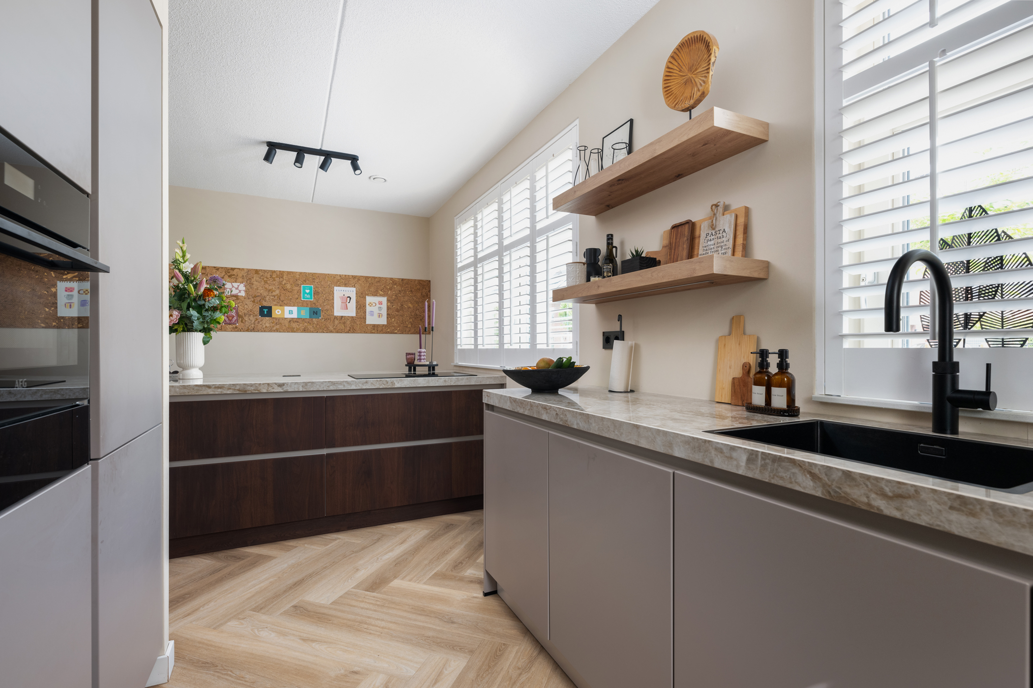 The inviting living room is bright and spacious, with the seating area at the rear. At the front, you’ll find the generous kitchen with a stylish island, finished with a luxurious marble countertop. The kitchen is fully equipped with high-end built-in appliances, including an induction cooktop with integrated extractor, oven, combination microwave, warming drawer, Quooker, fridge-freezer, and dishwasher.