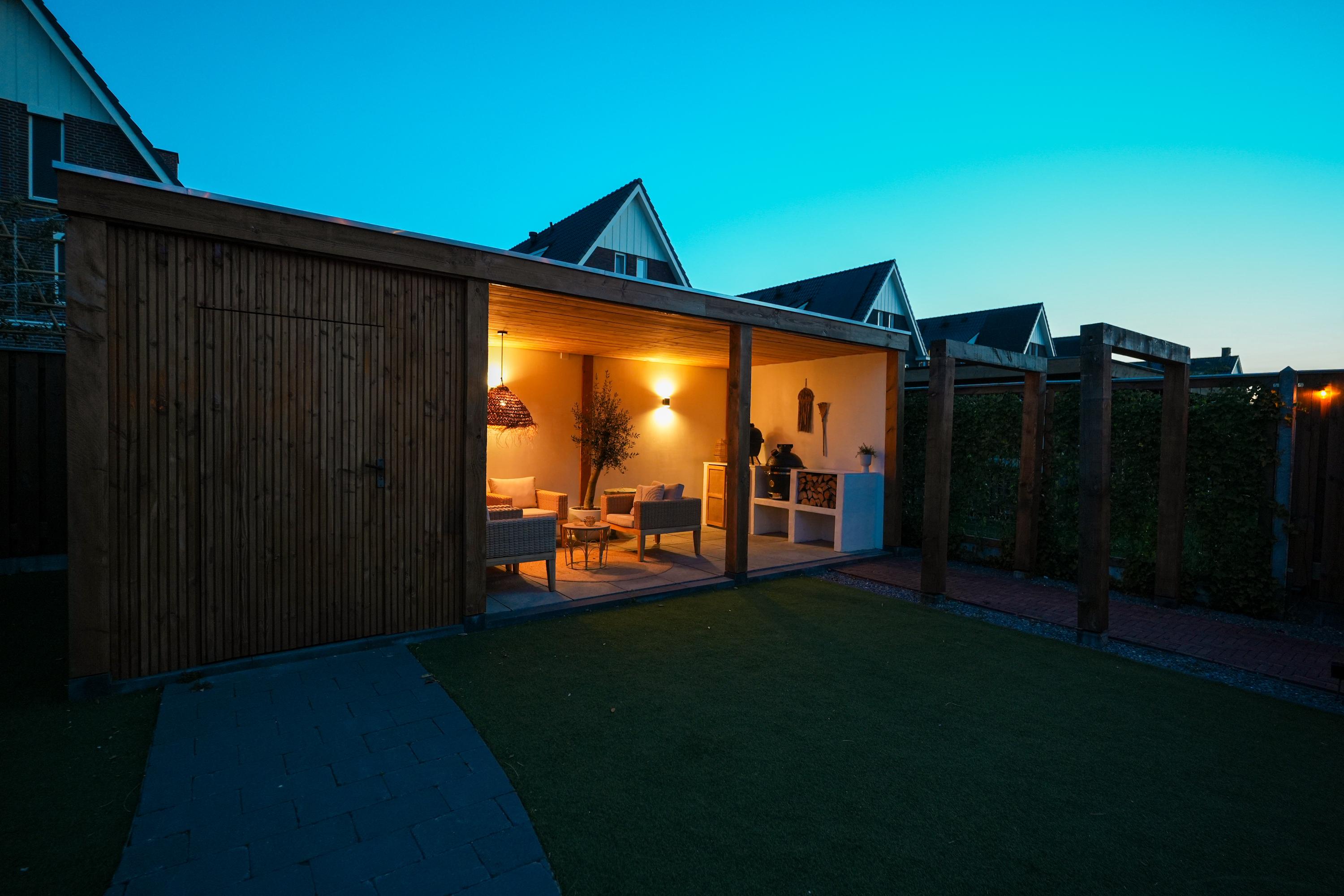 At the back is a charming covered area with storage: the perfect place to spend long evenings outdoors and enjoy the real outdoor life all year round.