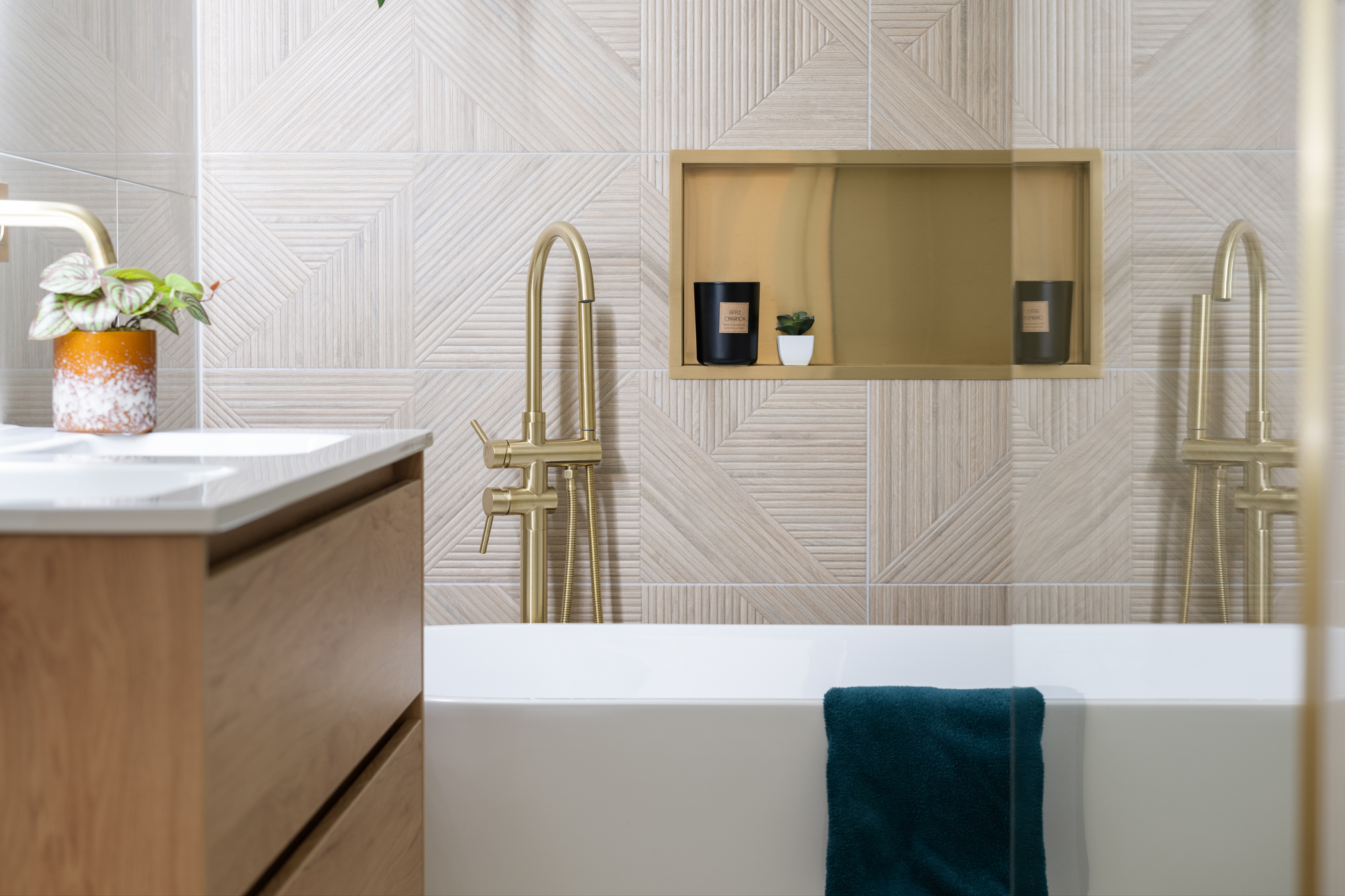 The modern bathroom is a relaxing retreat, featuring a luxurious bathtub, a spacious walk-in shower, and a double sink. Every detail has been carefully finished, allowing you to start or end your day in complete comfort.
