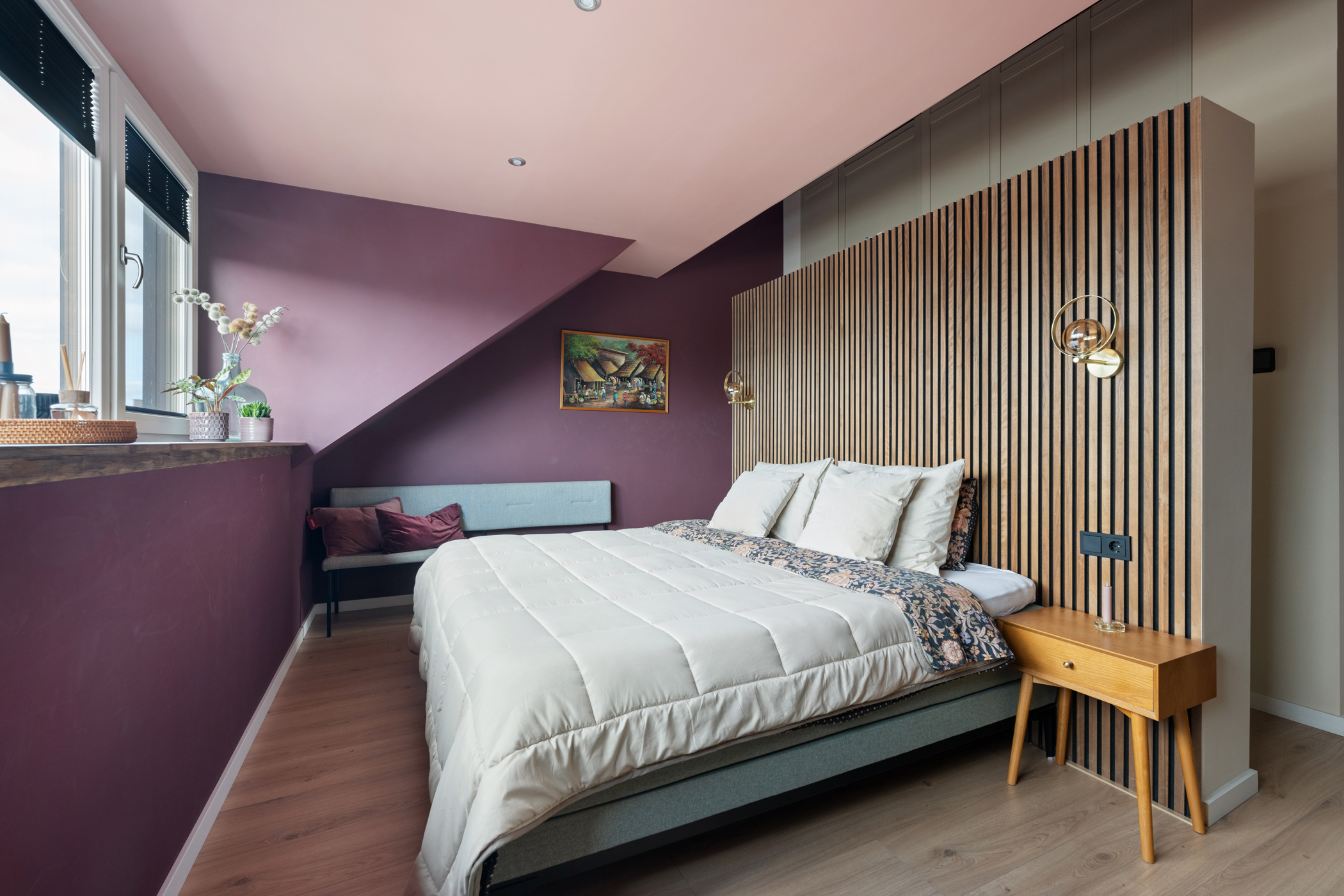 This room is particularly remarkable for the extensive built-in storage that reaches up to the high ceiling. This custom solution provides ample storage space, beautifully integrated yet always within reach. Additionally, extra storage is cleverly incorporated in a raised niche—perfect for suitcases and seasonal items.