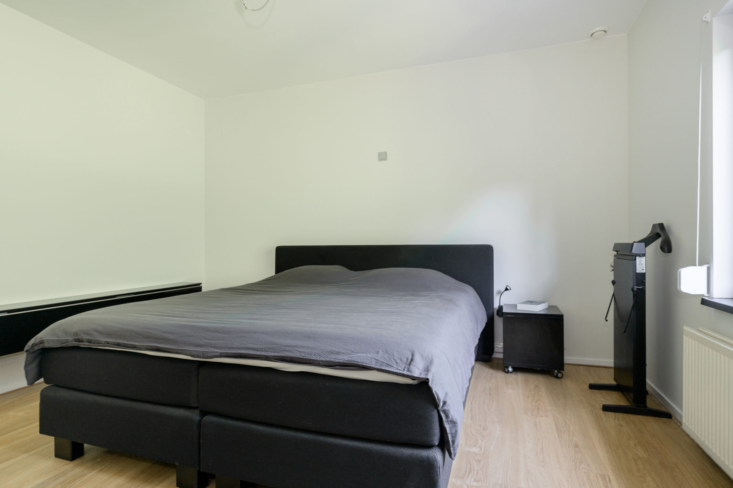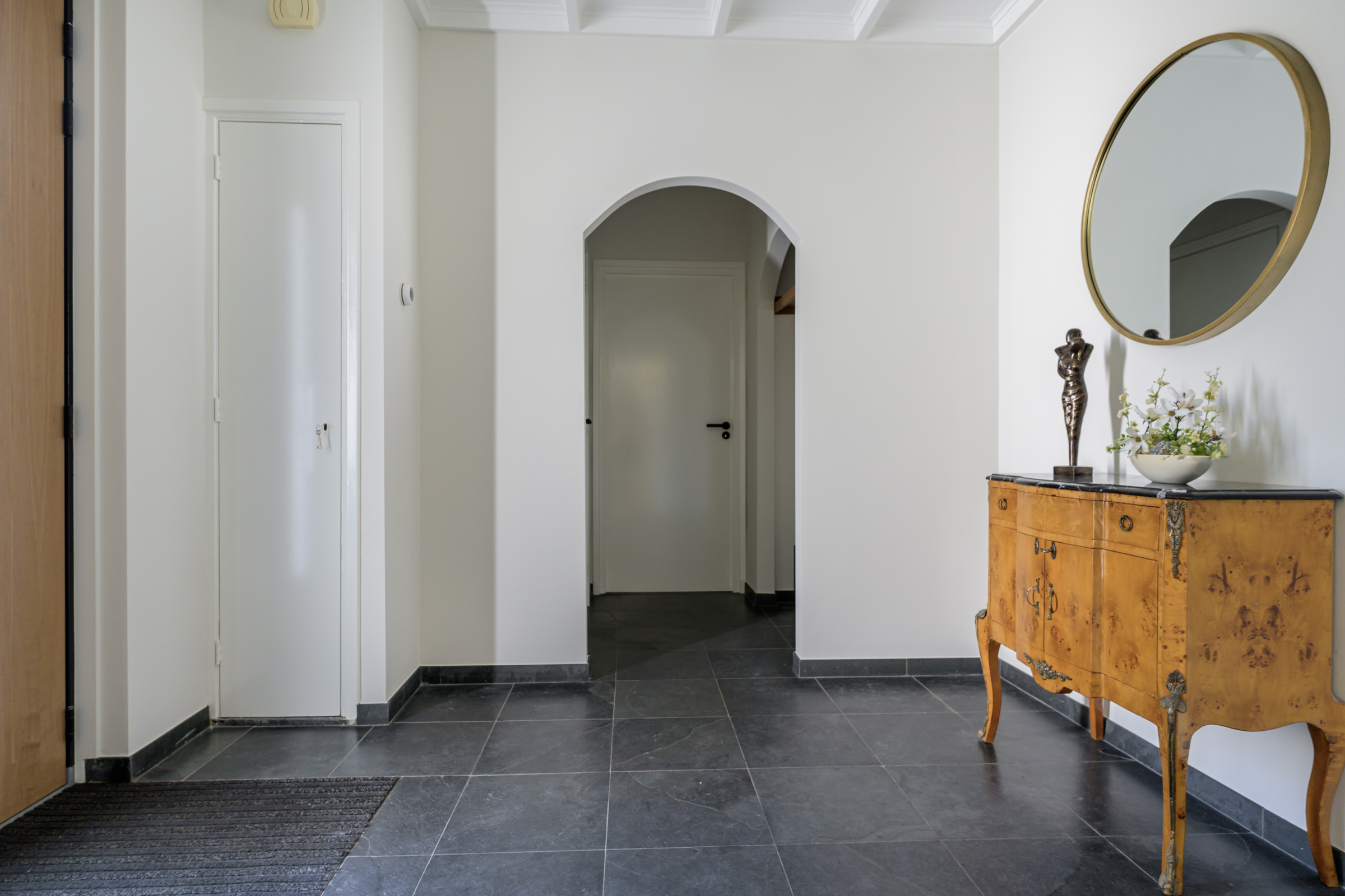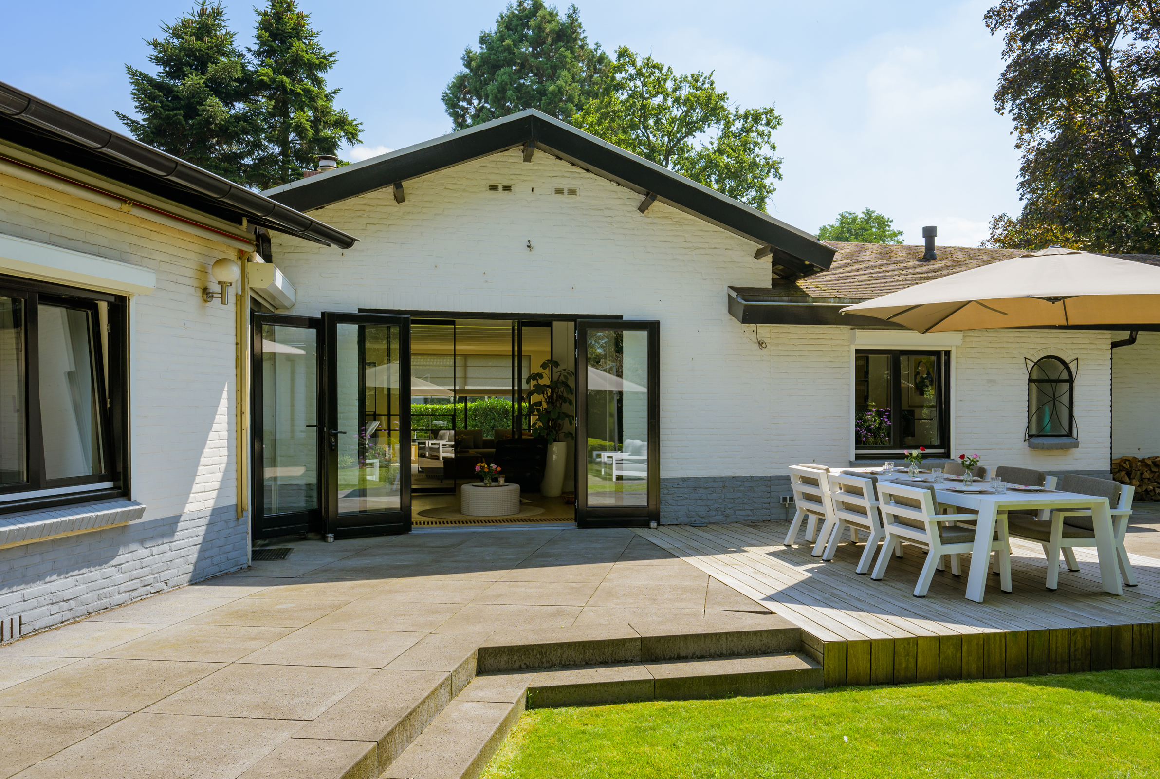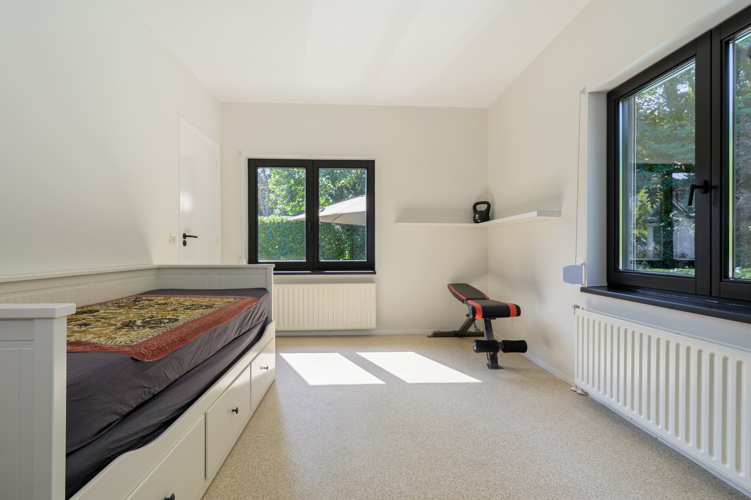 La maison conjugue durabilité et pragmatisme grâce à l’isolation des sols et plafonds, au vitrage HR++, à 18 panneaux solaires et à un chauffage moderne, offrant ainsi un environnement efficace et serein. De grandes dalles en ardoise, du parquet et des sols en bois massif soulignent le caractère feutré de l’ensemble, tandis que les plafonds à poutres apparentes et l’éclairage intégré instaurent une atmosphère rythmée. Les espaces de vie s’ouvrent depuis un salon avec cheminée, traversant des portes vitrées vers le jardin, et communiquent harmonieusement avec une salle à manger séparée et une cuisine entièrement équipée avec buanderie.