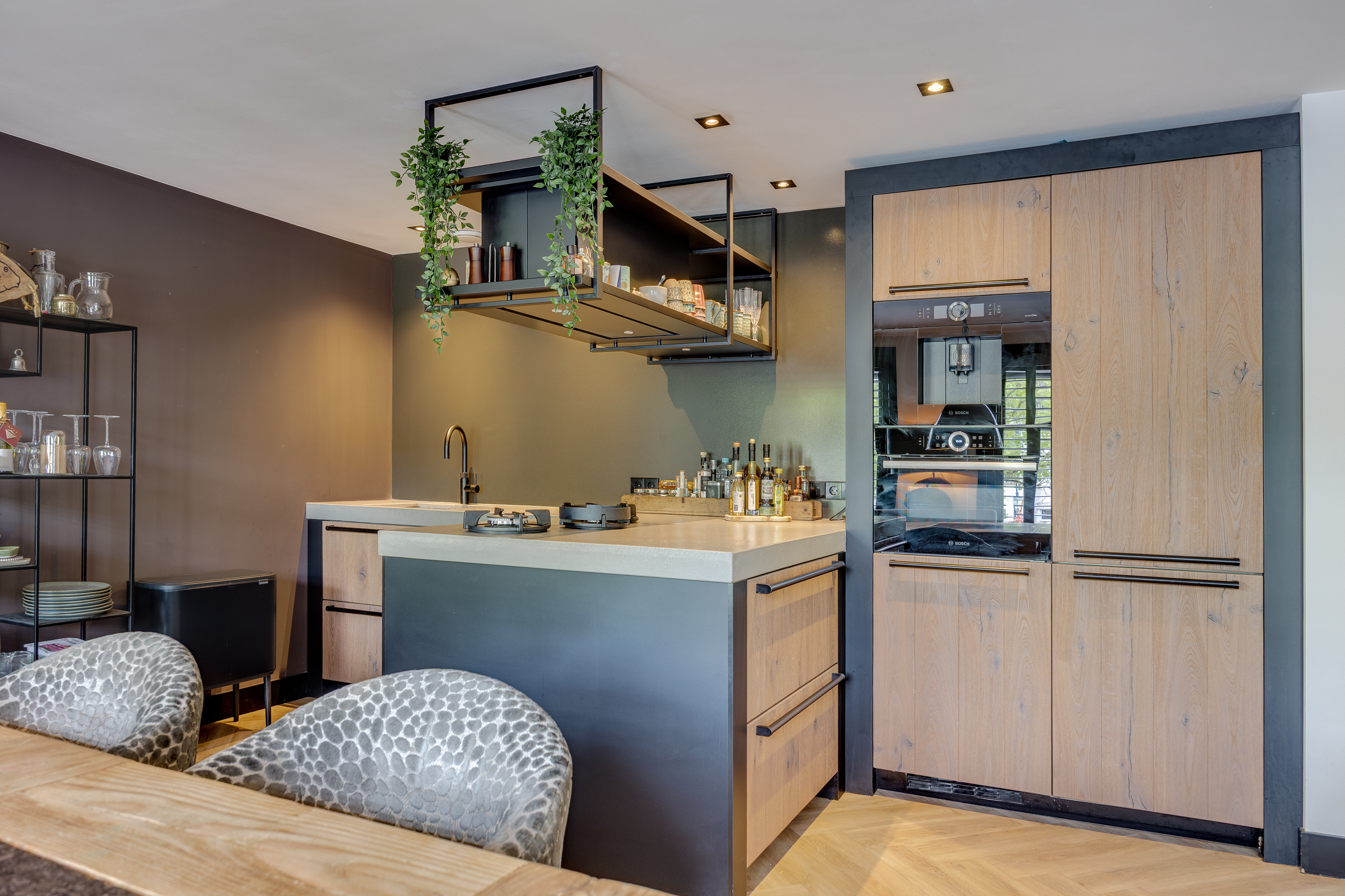 The open-plan kitchen (KBK Kerker, 2020) is a dream for every cooking enthusiast: equipped with high-quality built-in appliances, including Pitt Cooking, a combi oven, combi microwave, built-in coffee machine, Quooker Combi Flex (7 liters), double refrigerator, and a luxurious self-cleaning plasma extractor hood from Wave. The spacious dining table is perfect for enjoying long dinners in style.