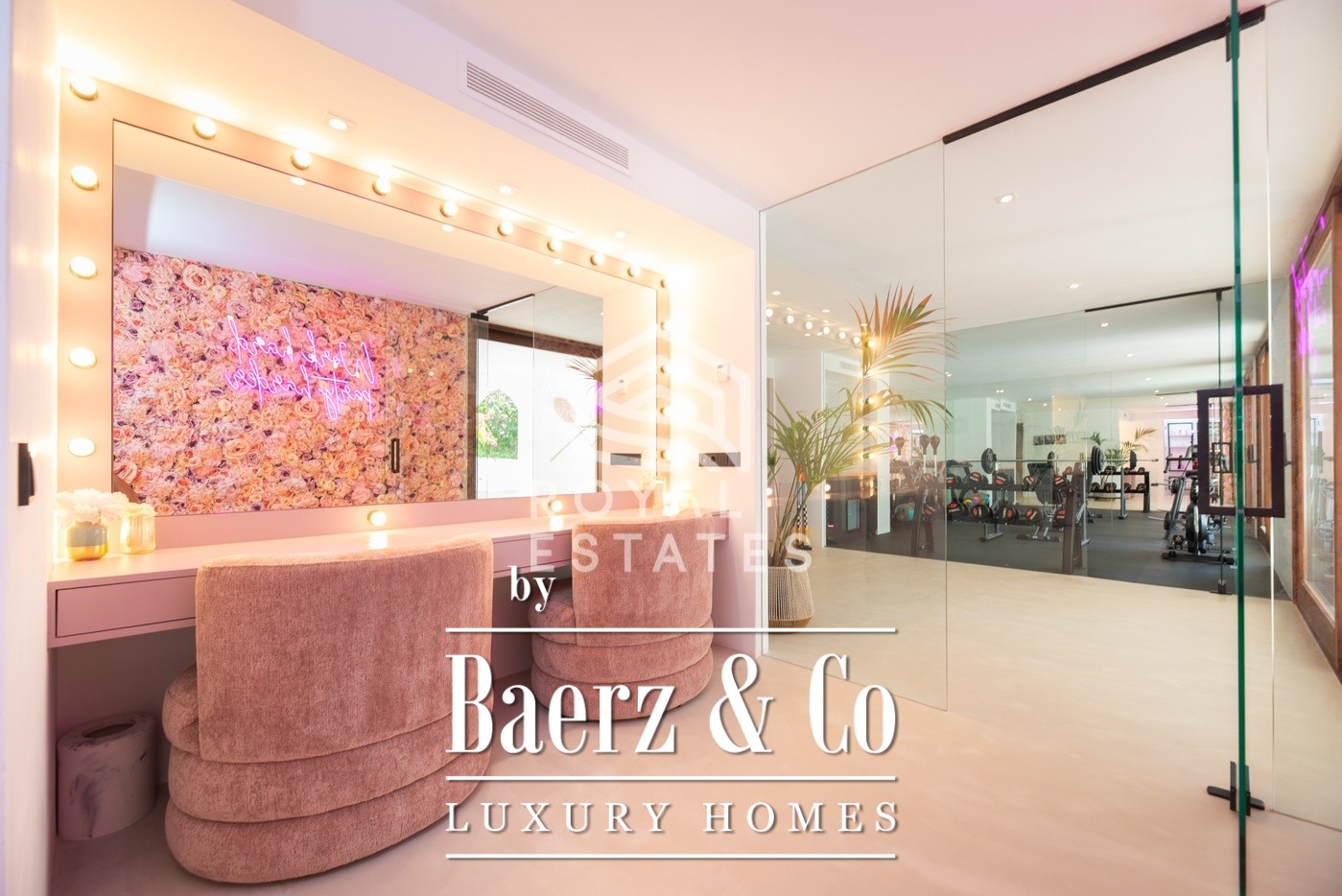 Les vastes terrasses prolongent l’espace de vie vers des jardins paysagers, des palmiers matures et une piscine de style lagon, invitant à la détente comme aux réceptions. Jeux extérieurs, coin brasero et espaces solarium viennent compléter ces lieux dédiés à la convivialité ou à la quiétude. Le bien-être se retrouve au cœur du rez-de-chaussée avec salle de sport dédiée, home cinéma et glam room. Matières naturelles nobles—bois, pierre, textiles raffinés—structurent une esthétique minimaliste et intemporelle, sublimée par un chauffage au sol, une climatisation intégrée et un éclairage modulable.