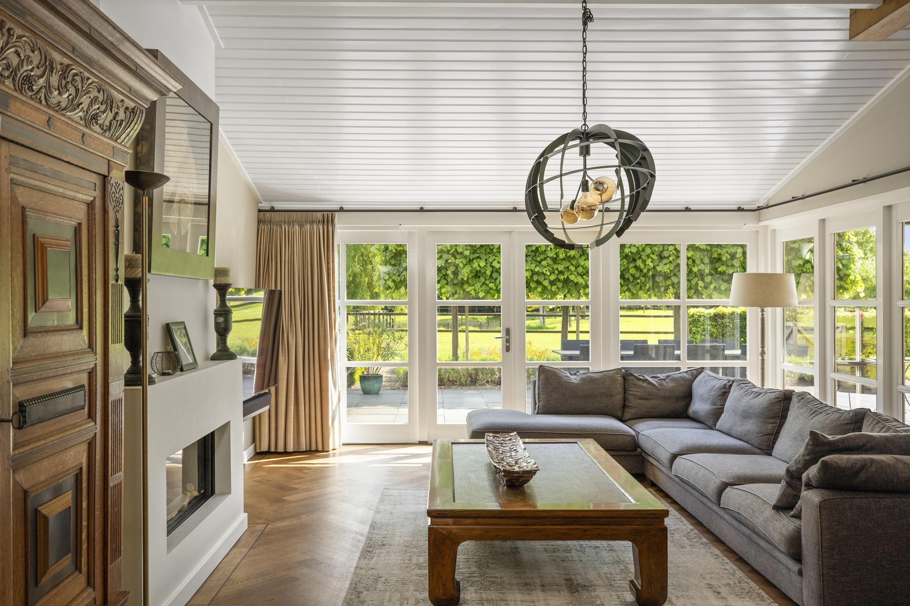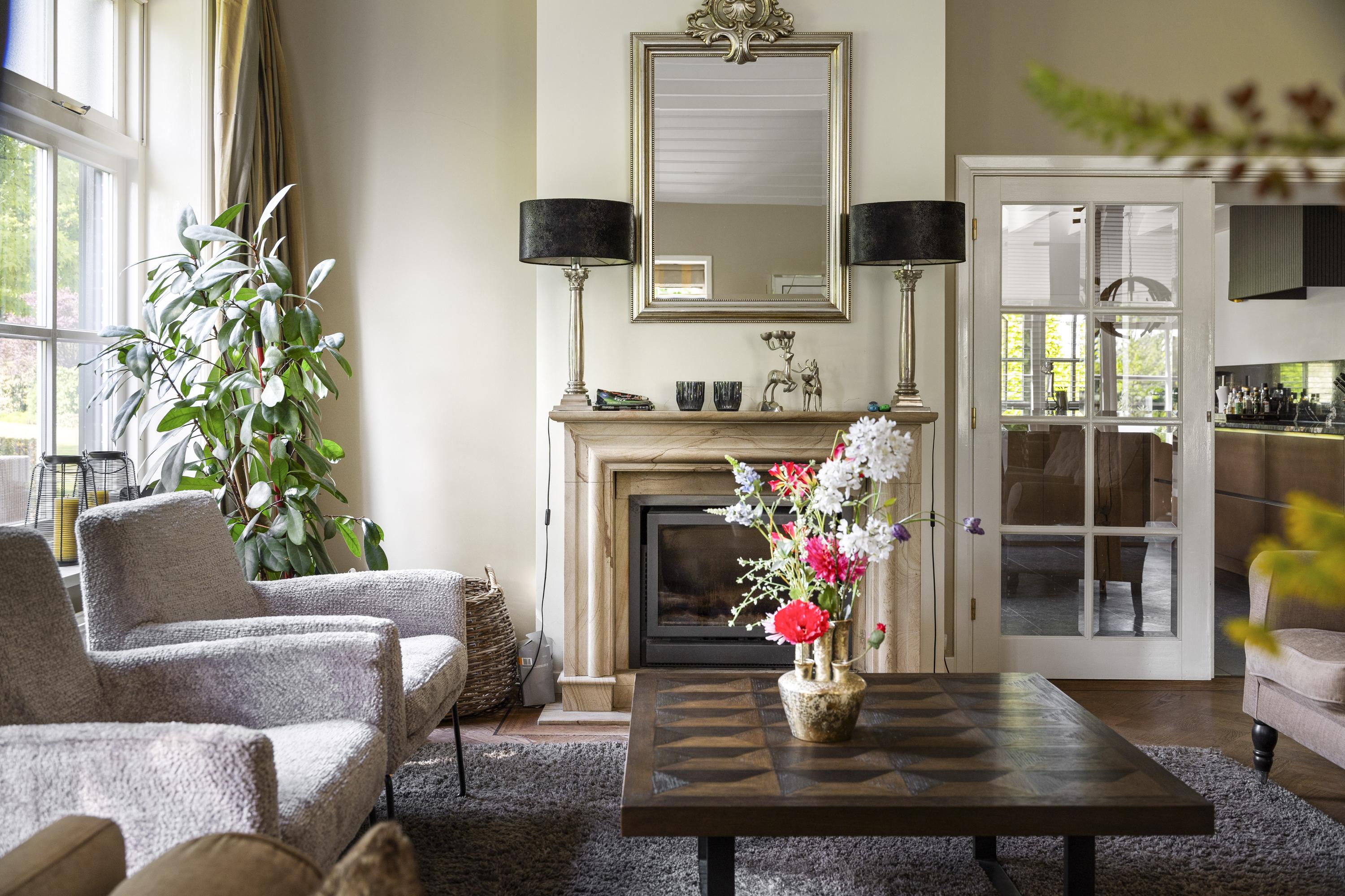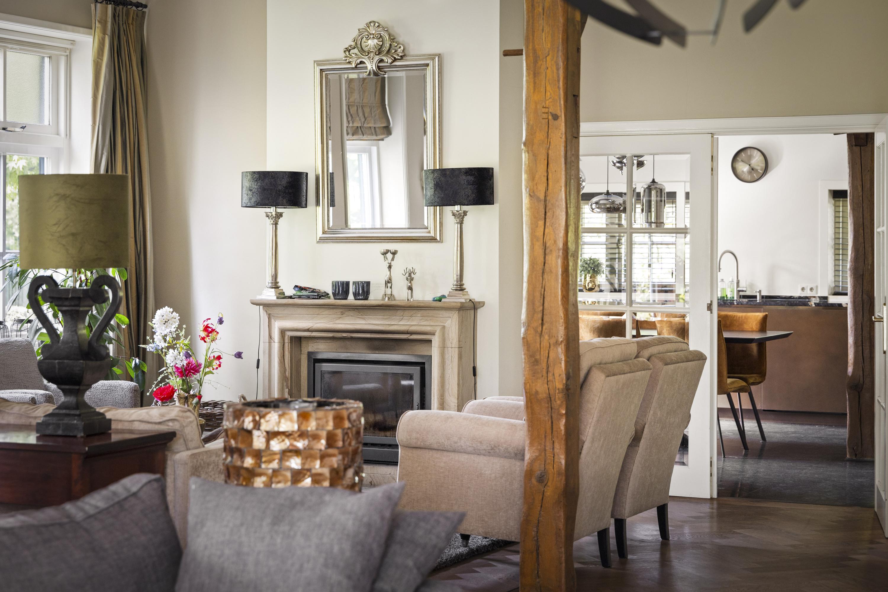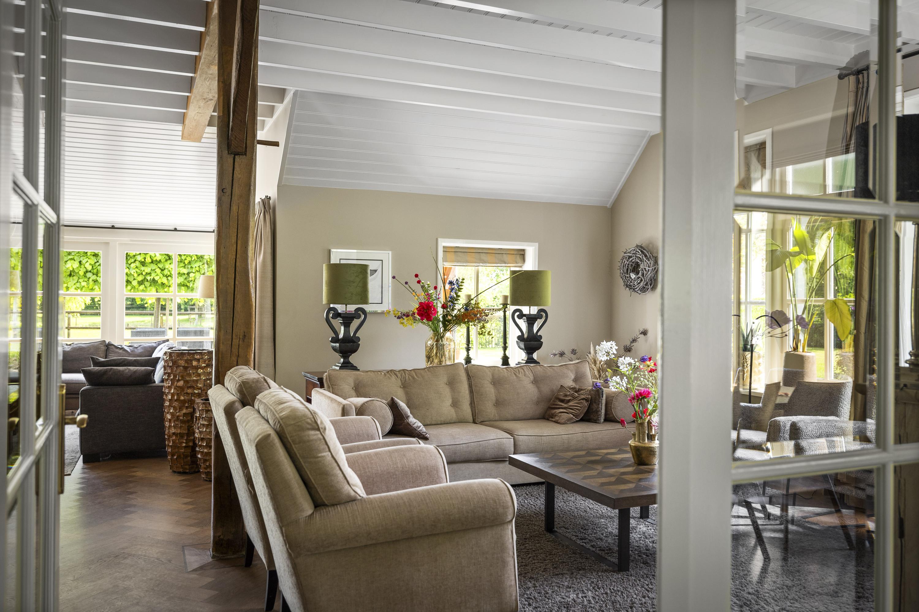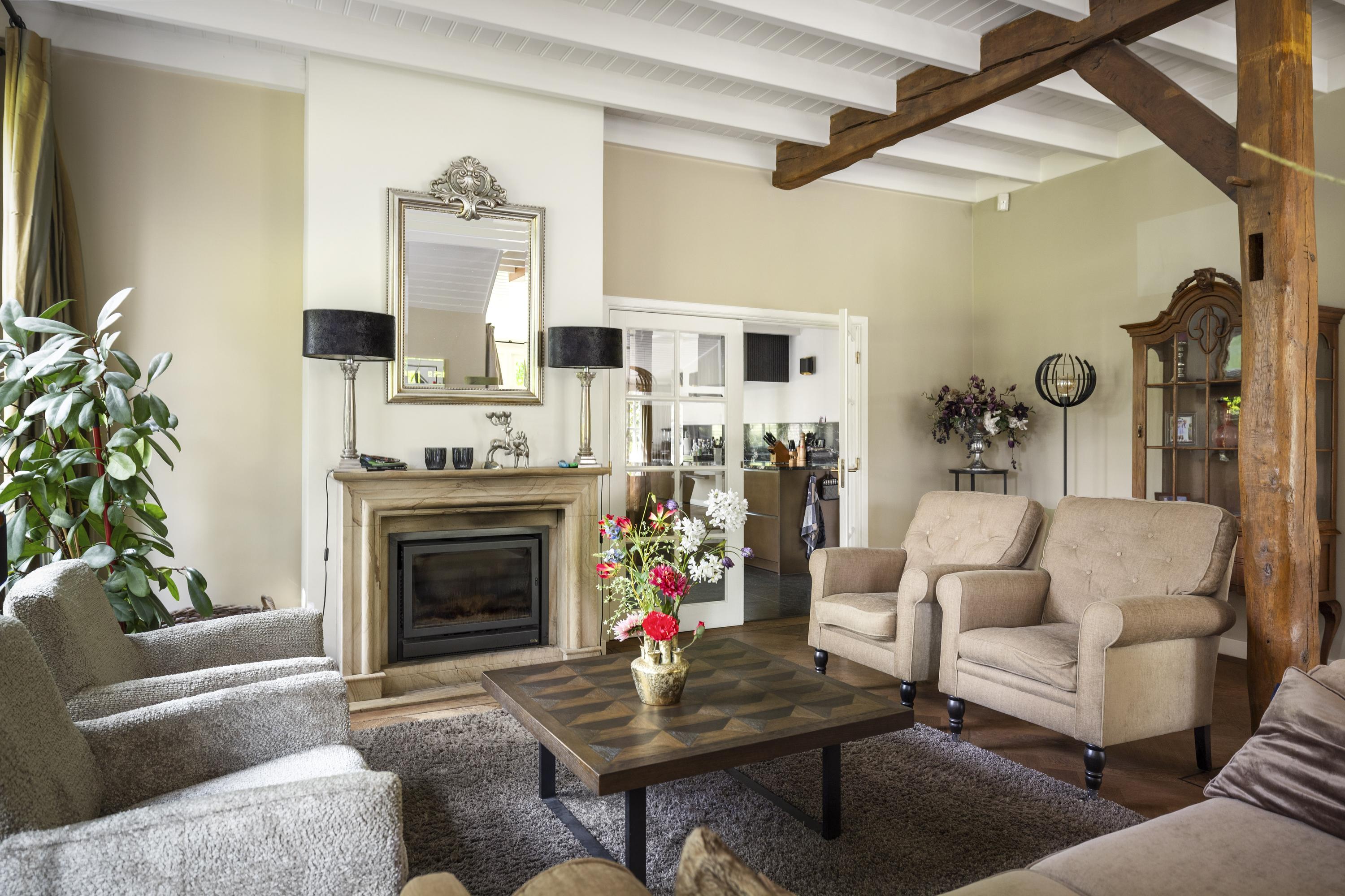 La résidence principale, érigée initialement en 1935 puis repensée avec rigueur ces dernières années, offre désormais 258 m² d’espaces de vie. La pierre naturelle et le parquet en chêne à bâtons rompus confèrent un rythme doux et accueillant. Quatre chambres, deux salles de bains et un vaste hall central baigné de lumière s’articulent dans des intérieurs d’une élégance artisanale discrète. La cuisine Lodder Keukens, adaptée aux rituels quotidiens comme aux réceptions conviviales, séduit par ses façades cuivrées et ses plans de travail en marbre. Les espaces à vivre proposent deux cheminées et des vues sur jardins soignés, écuries et vergers.