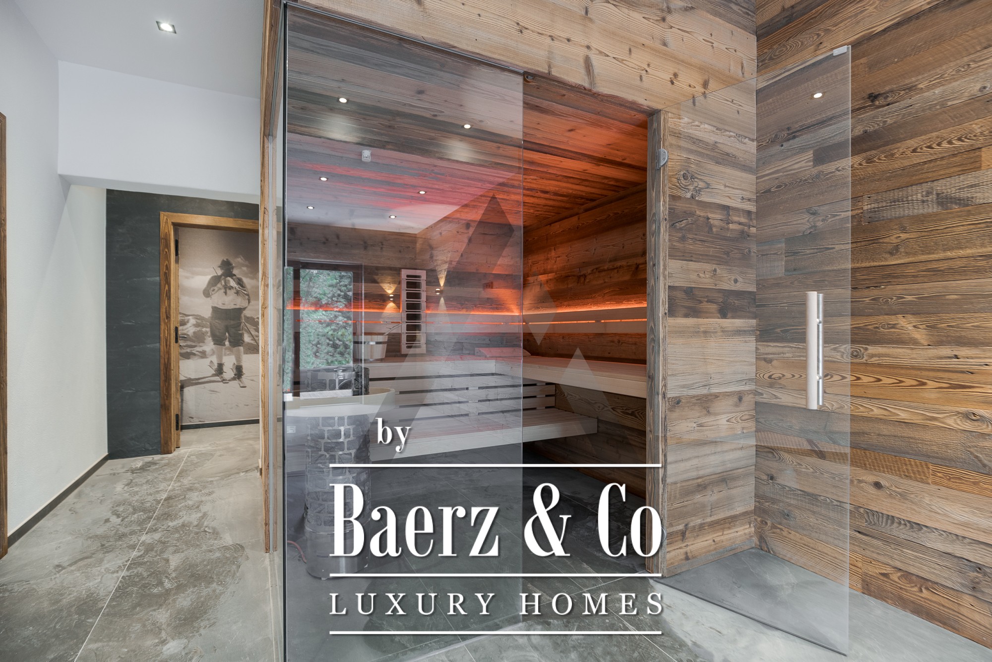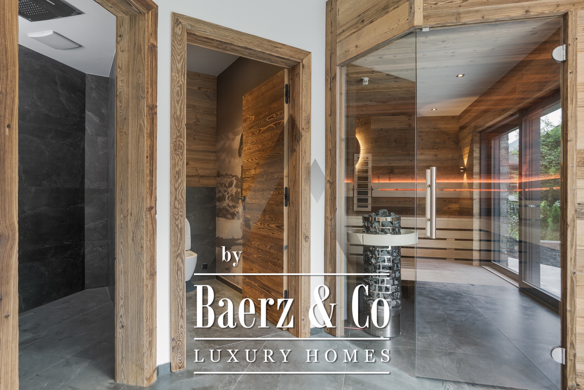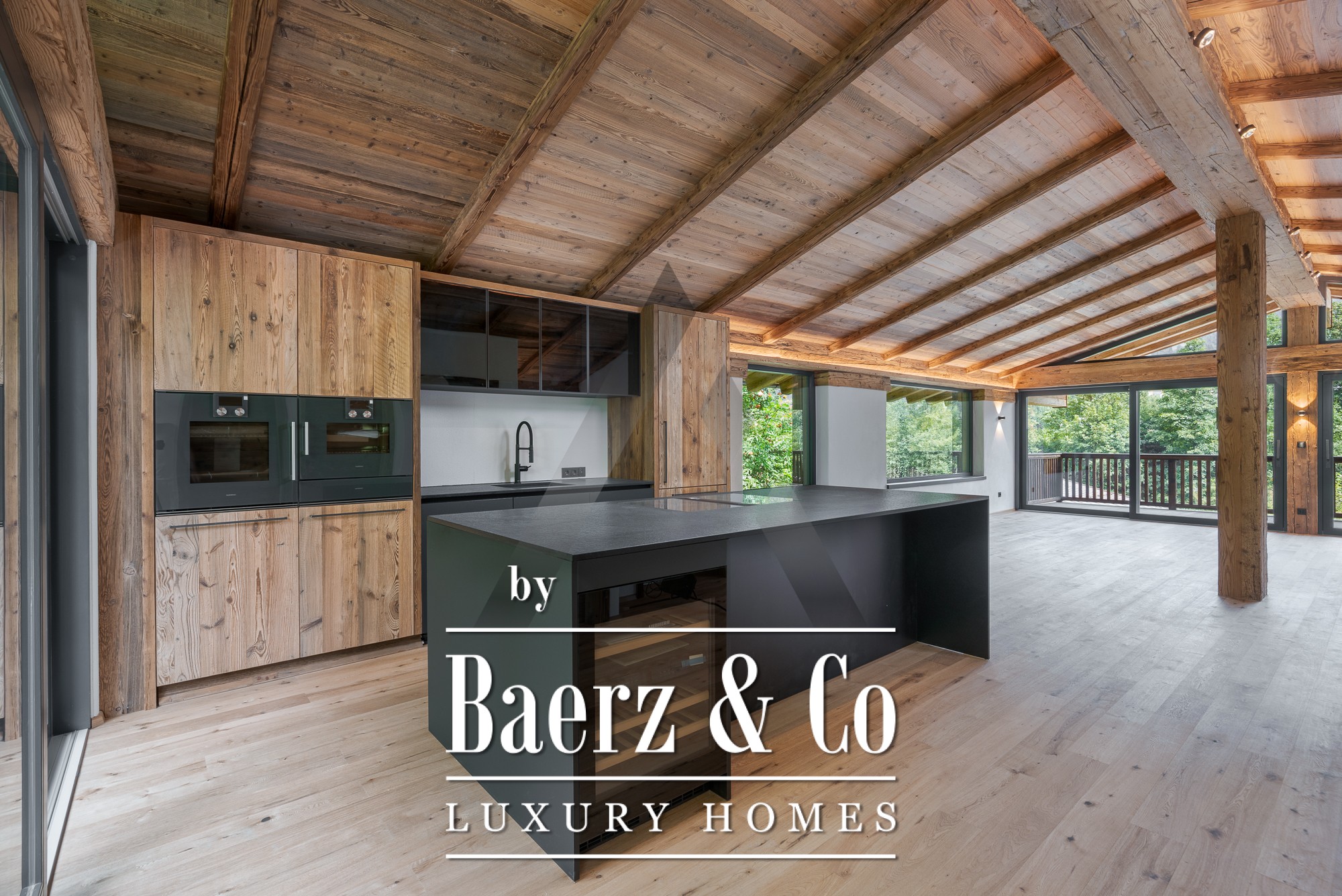 De grandes baies vitrées du sol au plafond dans l’espace salon-salle à manger de 70 m² s’ouvrent sur la nature environnante, tandis que la pierre naturelle et le coffrage en vieux bois accentuent l’élégance intemporelle de la façade. La cuisine professionnelle équipée d’appareils Gaggenau et Bora Professional est idéale pour les passionnés de gastronomie. Un espace bien-être privatif avec sauna et zone de relaxation invite à la détente, enrichi d’équipements soigneusement intégrés tels qu’un ascenseur, une cheminée, un système BUS et des parkings en sous-sol et extérieurs.