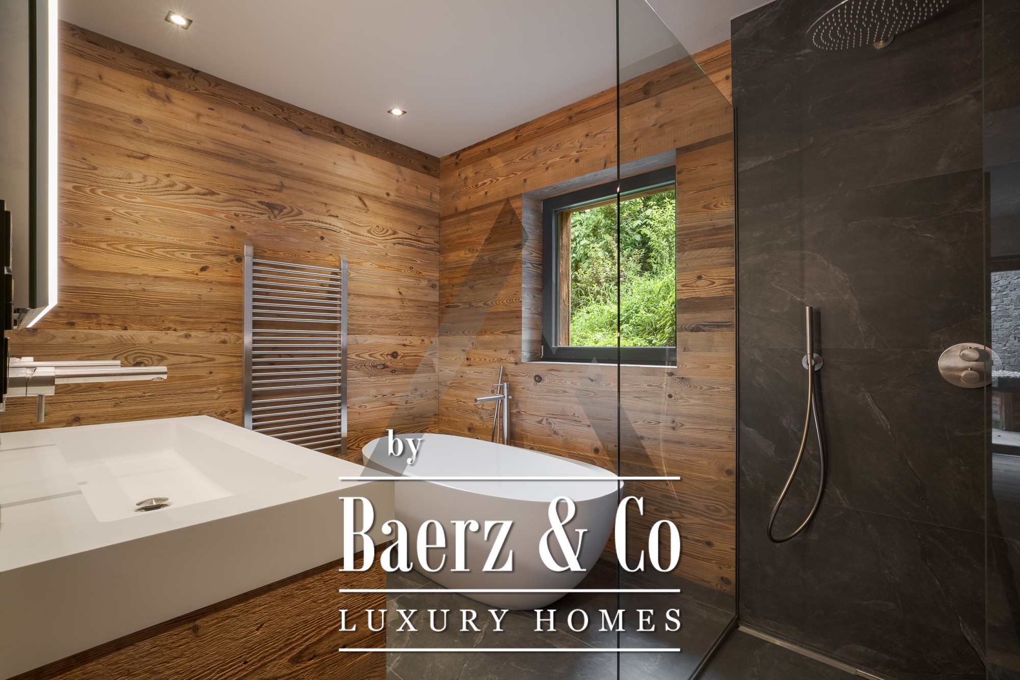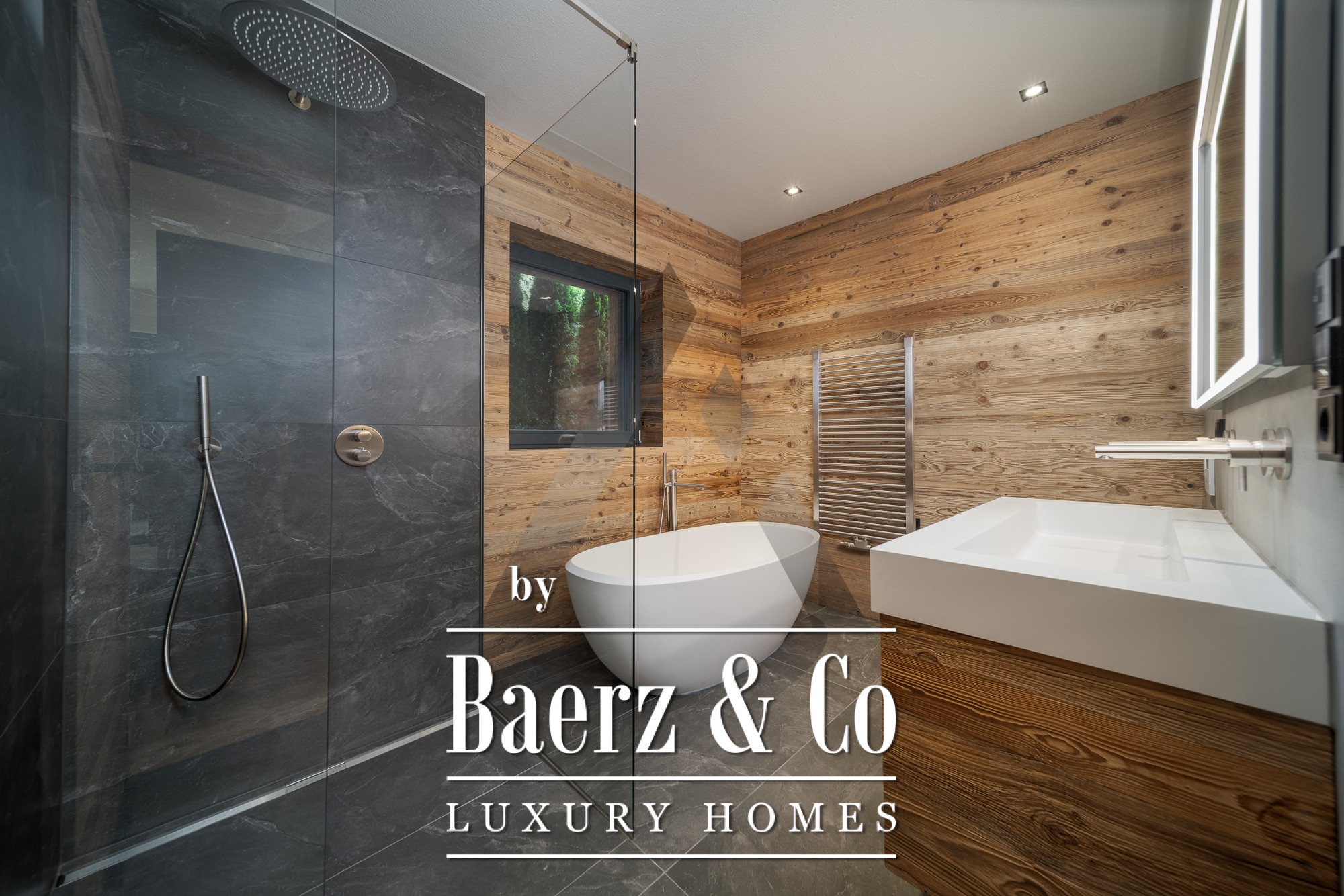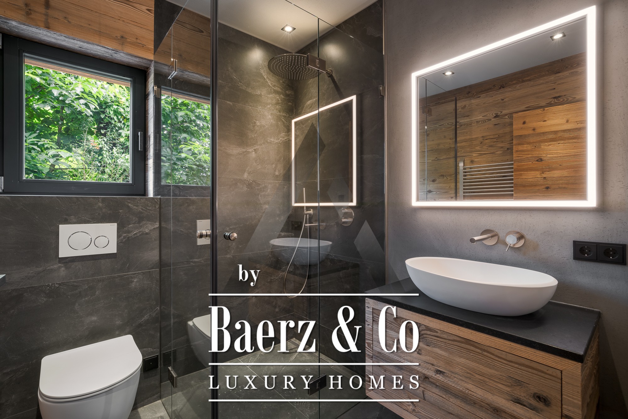De grandes baies vitrées du sol au plafond dans l’espace salon-salle à manger de 70 m² s’ouvrent sur la nature environnante, tandis que la pierre naturelle et le coffrage en vieux bois accentuent l’élégance intemporelle de la façade. La cuisine professionnelle équipée d’appareils Gaggenau et Bora Professional est idéale pour les passionnés de gastronomie. Un espace bien-être privatif avec sauna et zone de relaxation invite à la détente, enrichi d’équipements soigneusement intégrés tels qu’un ascenseur, une cheminée, un système BUS et des parkings en sous-sol et extérieurs.