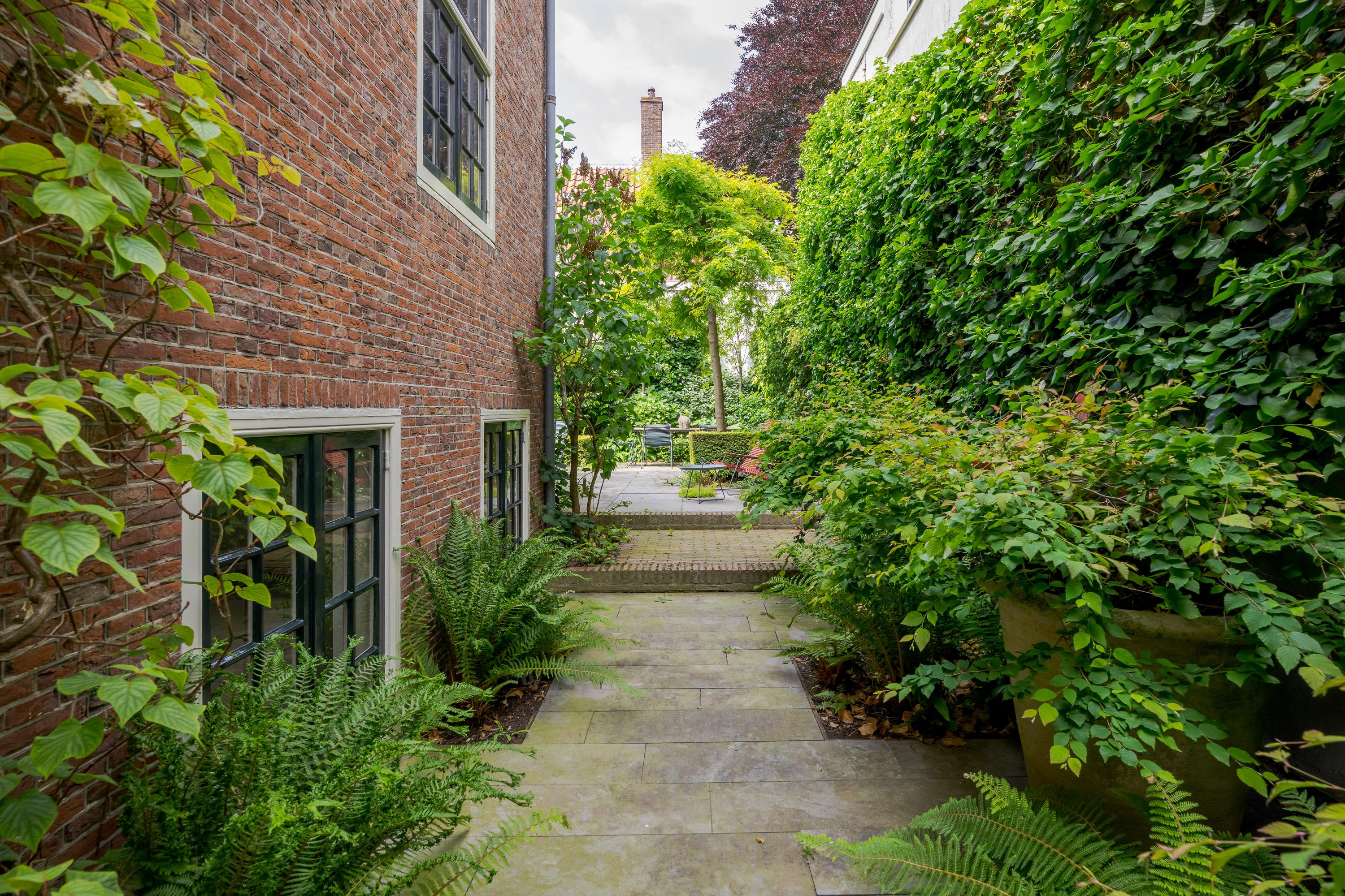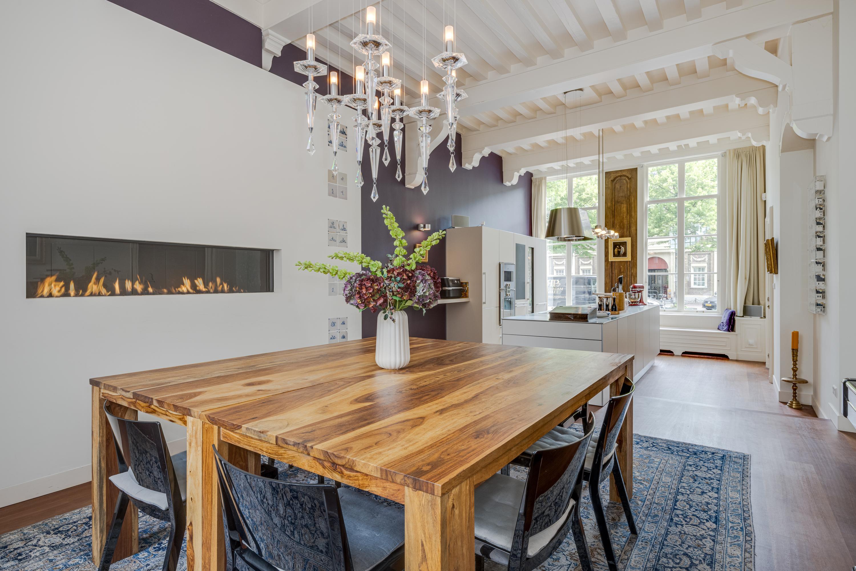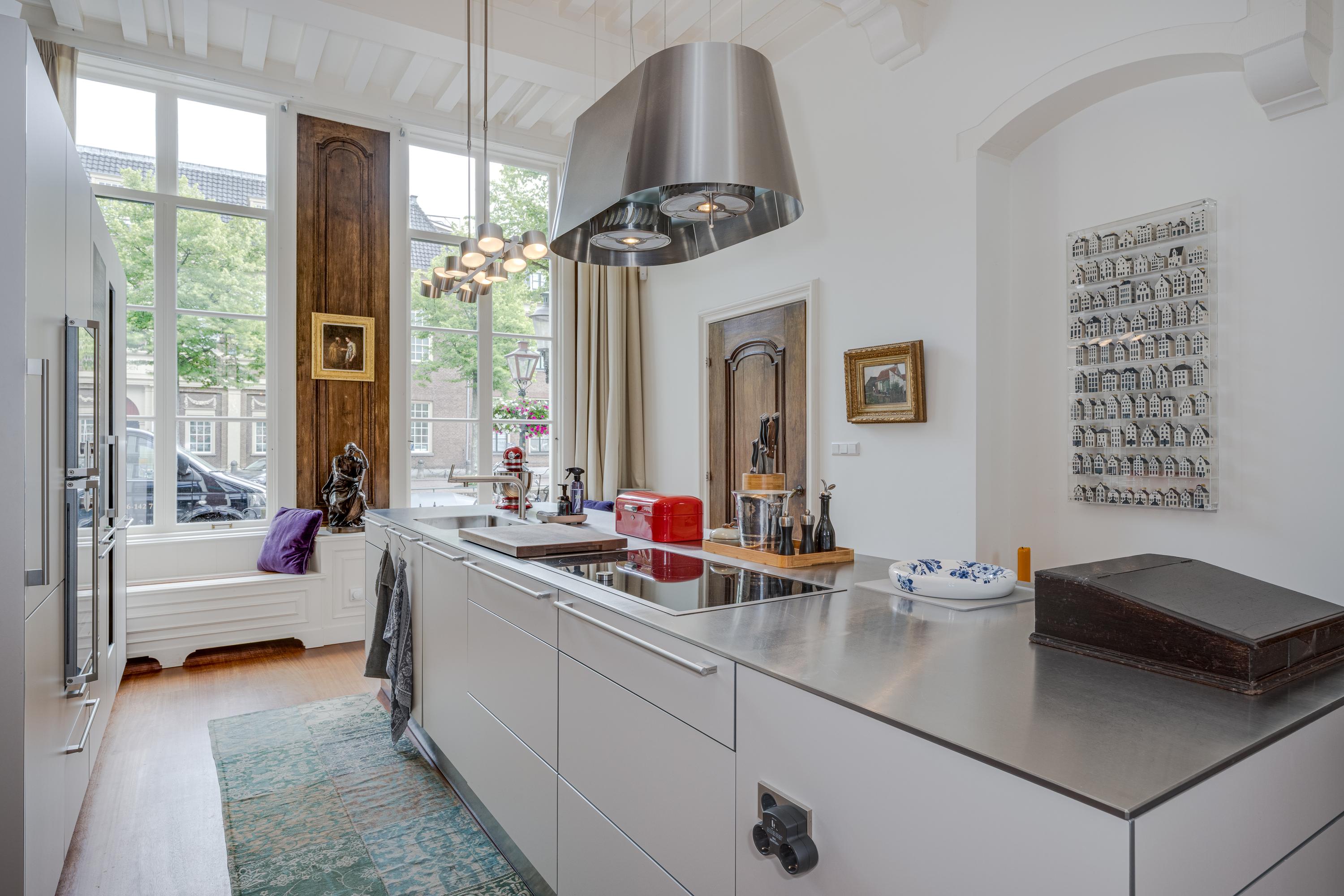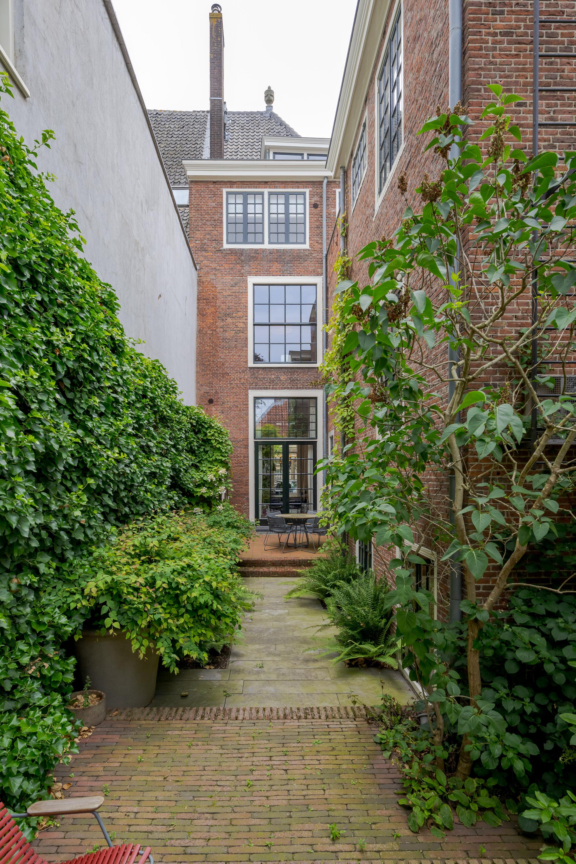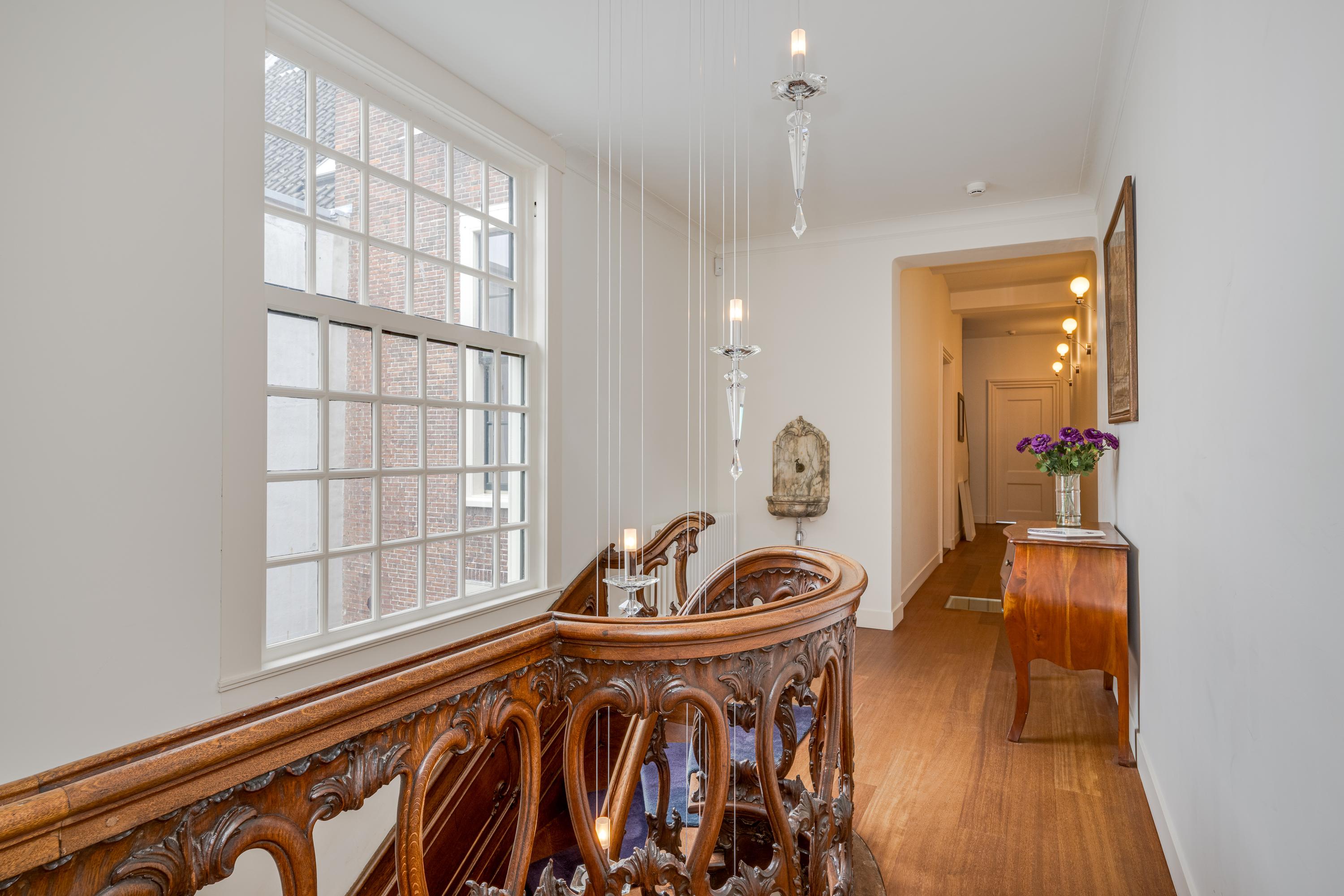Dès l’entrée, les intérieurs spacieux et lumineux inspirent la quiétude ; plafonds à poutres apparentes, faïences Delft Blue et somptueux escalier insufflent une véritable identité architecturale. Une cuisine Bulthaup s’ouvre sur le jardin urbain exposé ouest, mature et protégé du tumulte. Les premier et étages supérieurs révèlent six pièces adaptées à la vie de famille, au travail ou à la détente, avec trois salles de bains réparties sur l’ensemble. À l’arrière, une terrasse privée relie la suite parentale au ciel, tandis que les espaces de vie offrent de belles vues sur le canal et la ville animée.