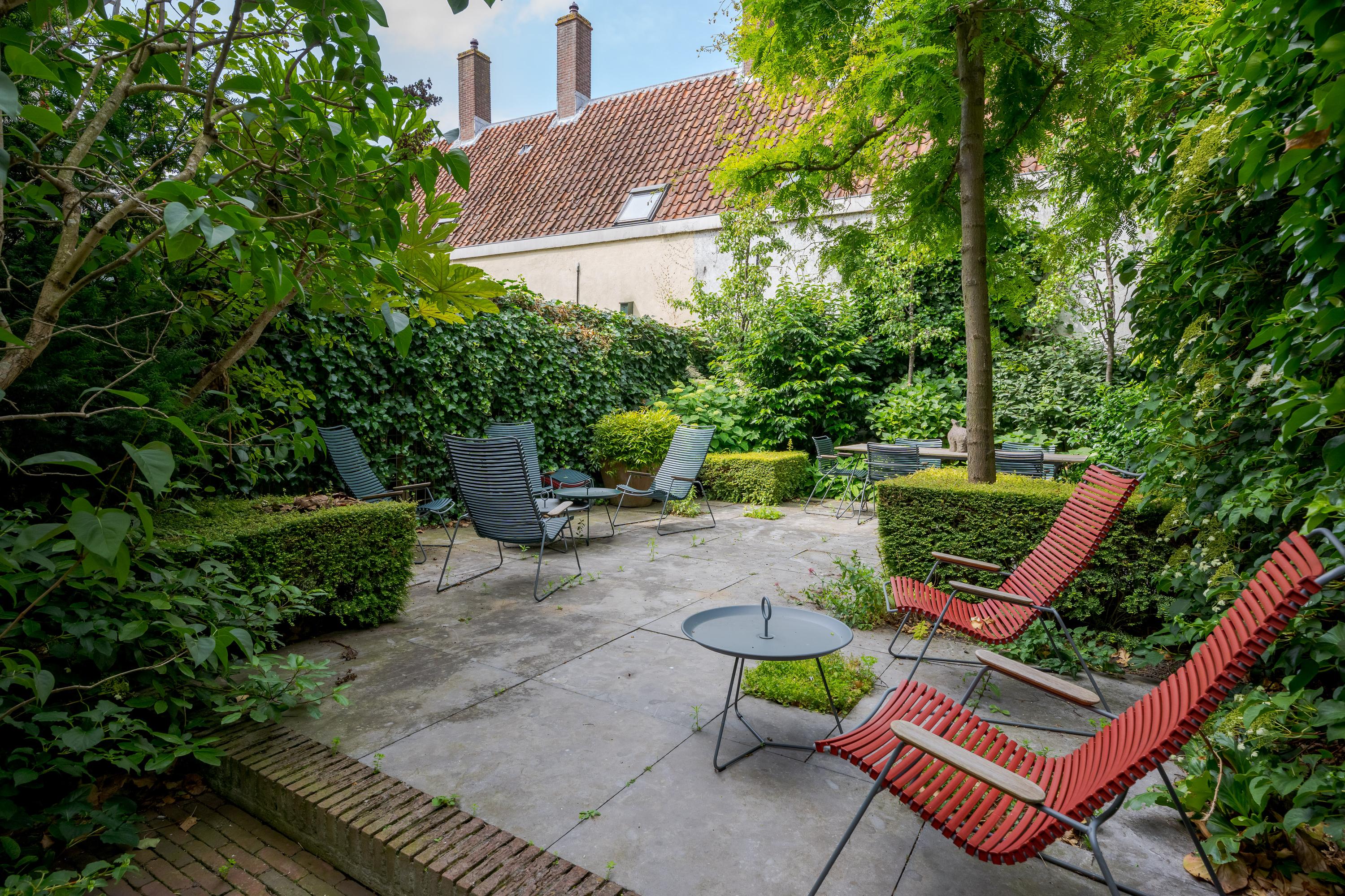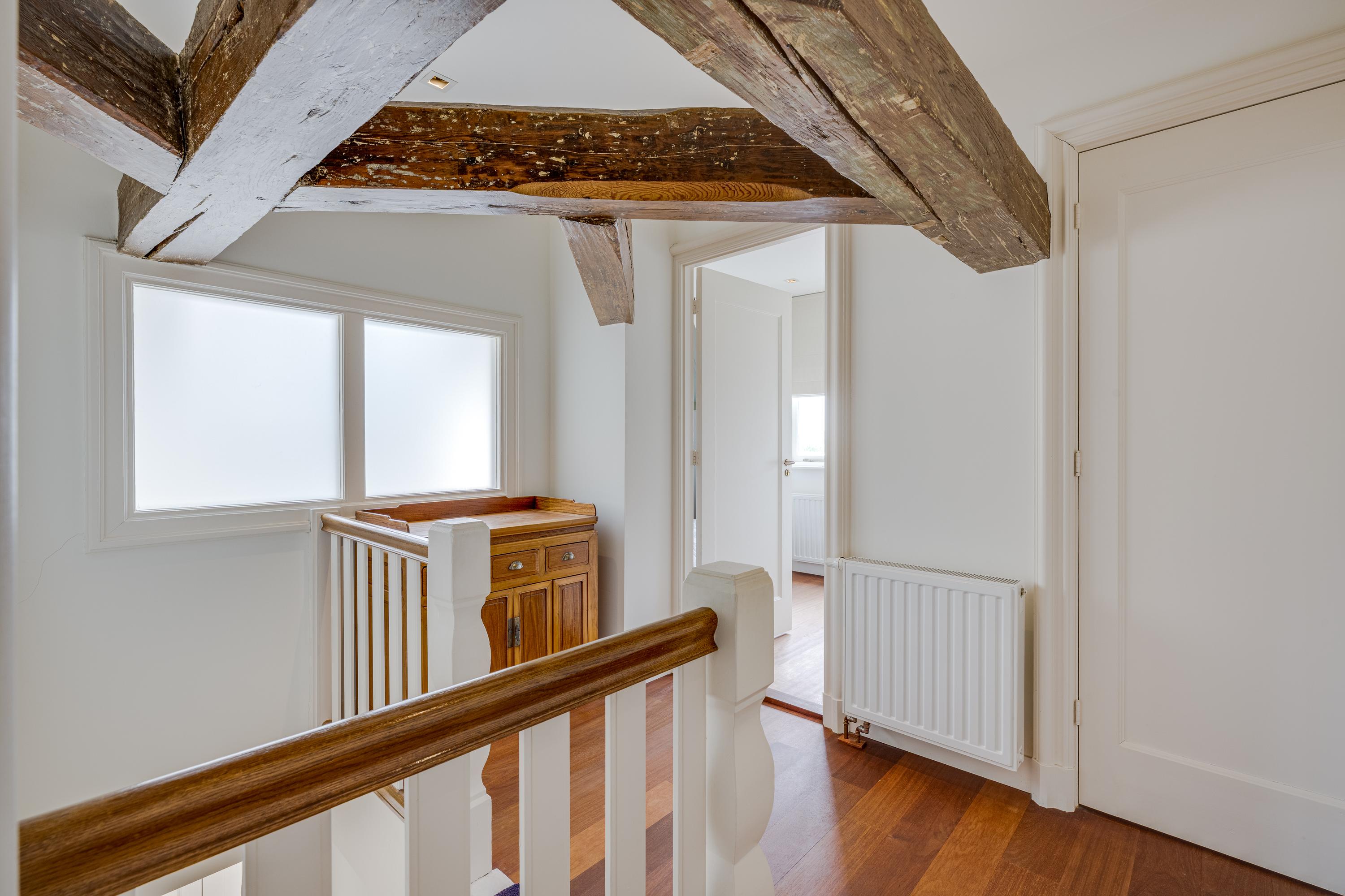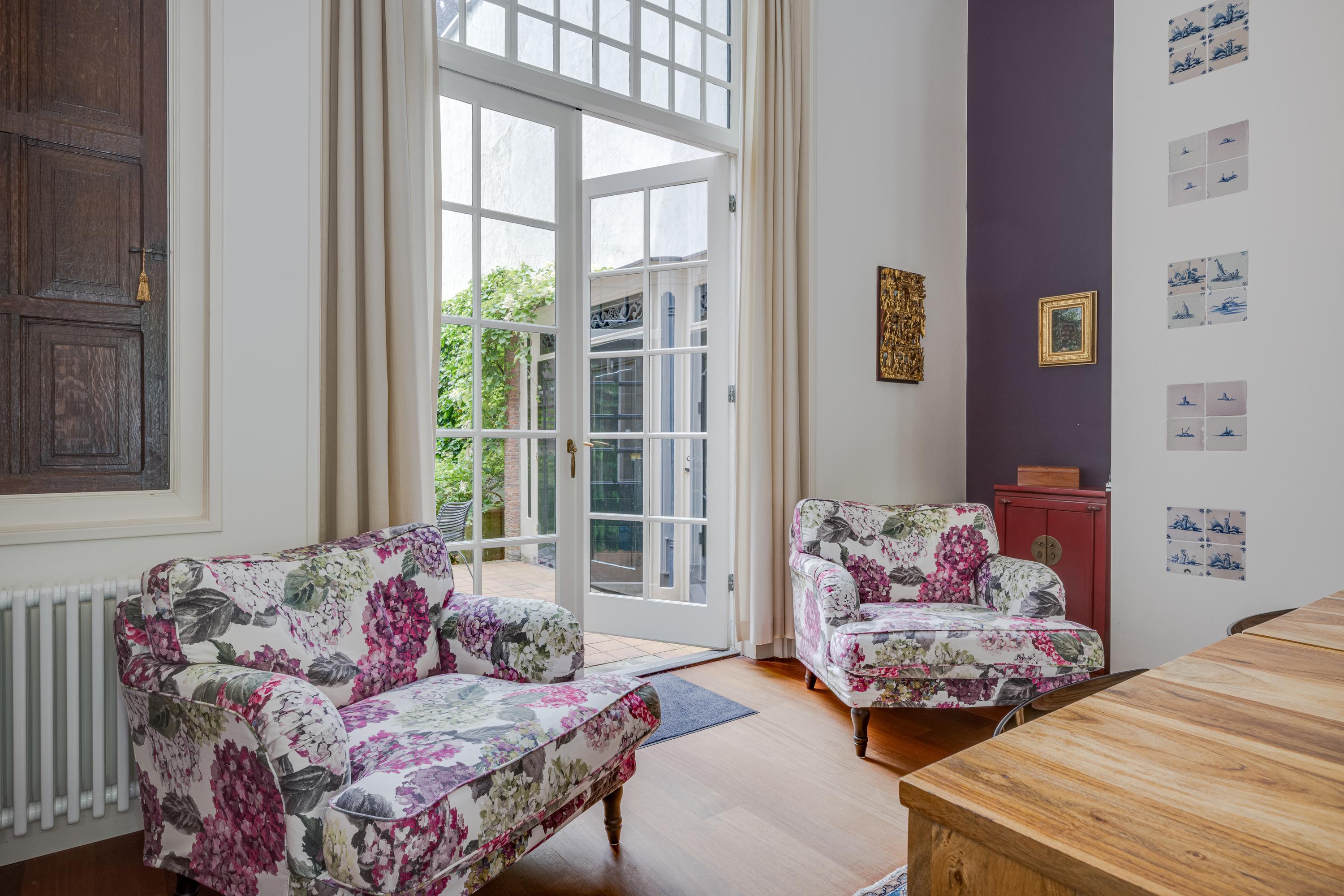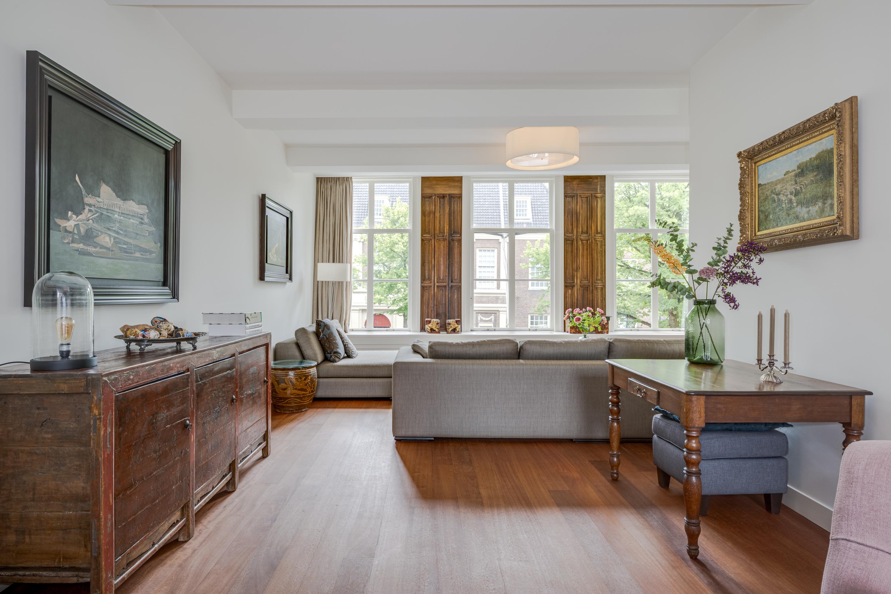 Dès l’entrée, les intérieurs spacieux et lumineux inspirent la quiétude ; plafonds à poutres apparentes, faïences Delft Blue et somptueux escalier insufflent une véritable identité architecturale. Une cuisine Bulthaup s’ouvre sur le jardin urbain exposé ouest, mature et protégé du tumulte. Les premier et étages supérieurs révèlent six pièces adaptées à la vie de famille, au travail ou à la détente, avec trois salles de bains réparties sur l’ensemble. À l’arrière, une terrasse privée relie la suite parentale au ciel, tandis que les espaces de vie offrent de belles vues sur le canal et la ville animée.