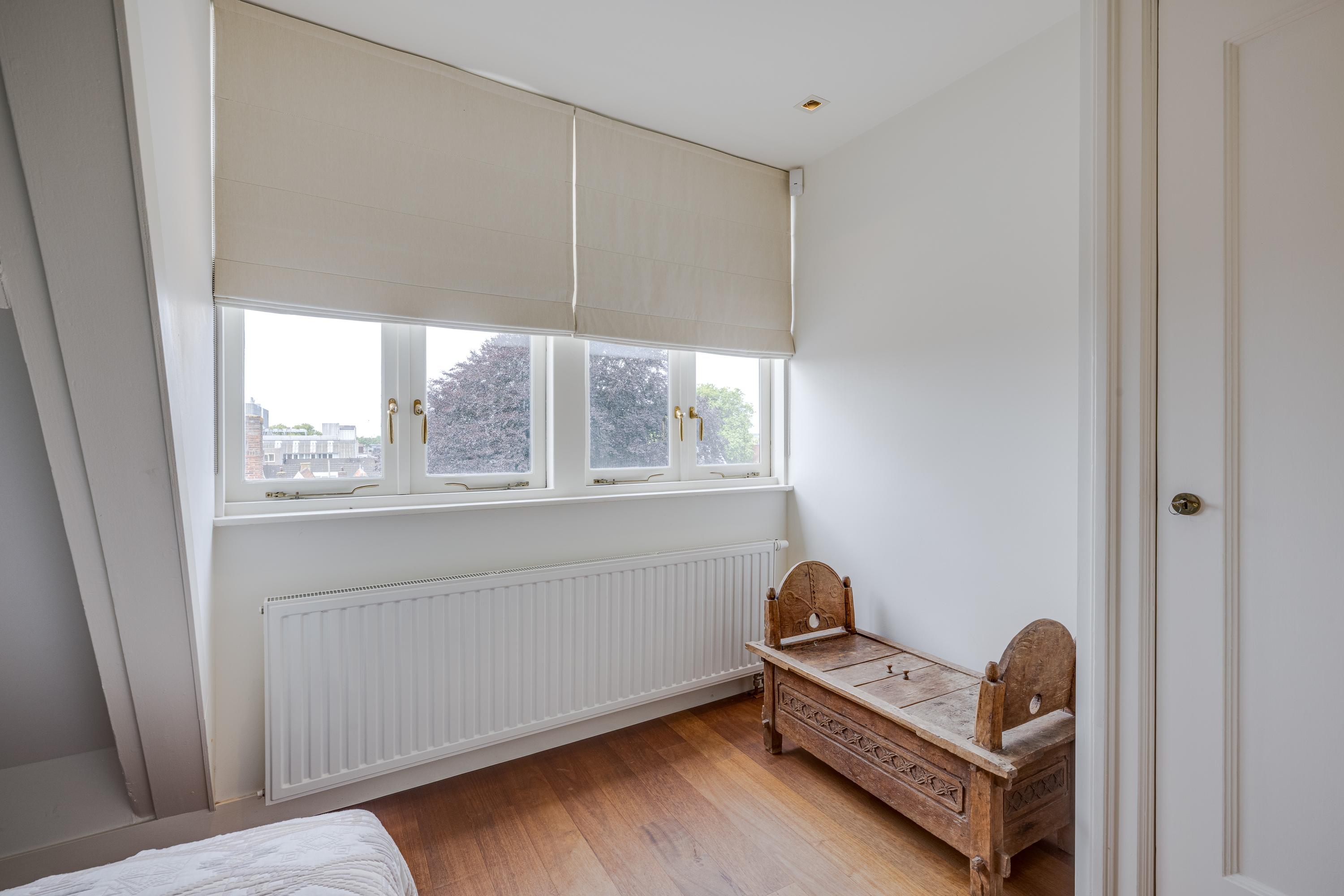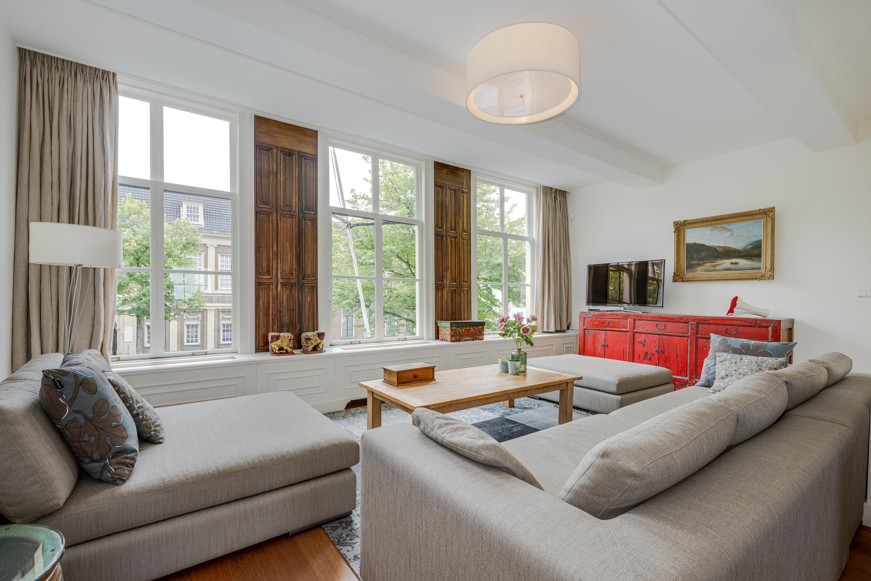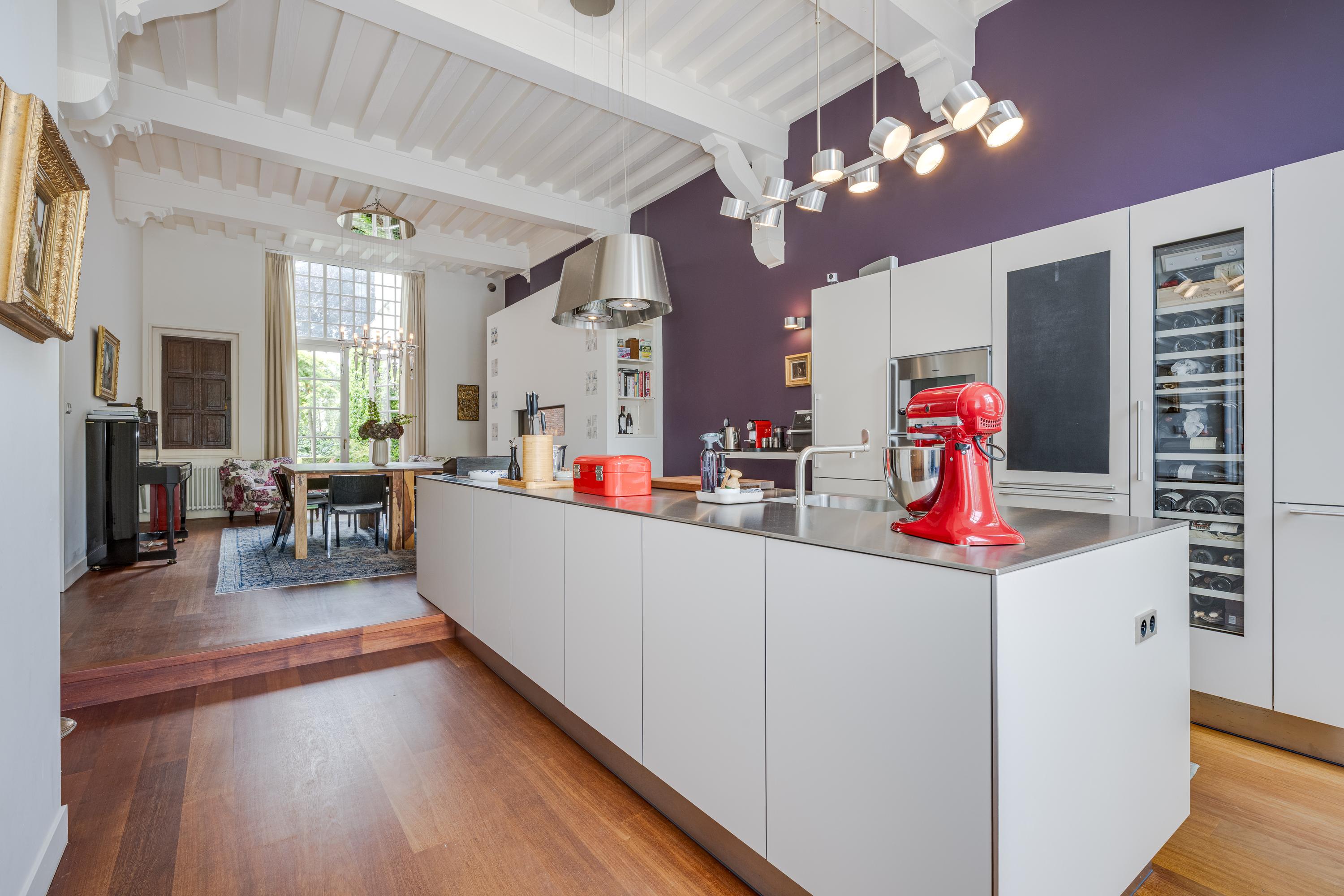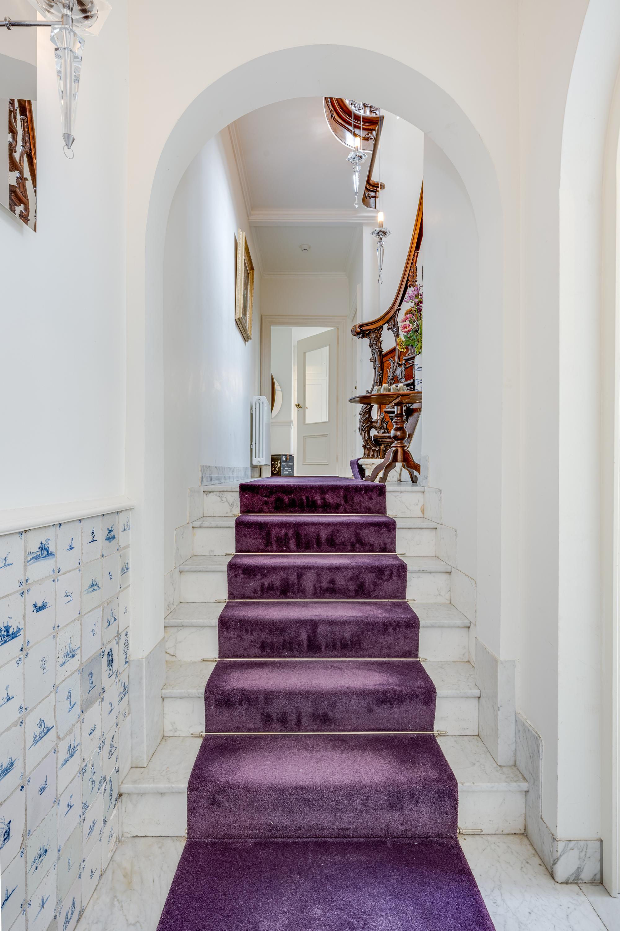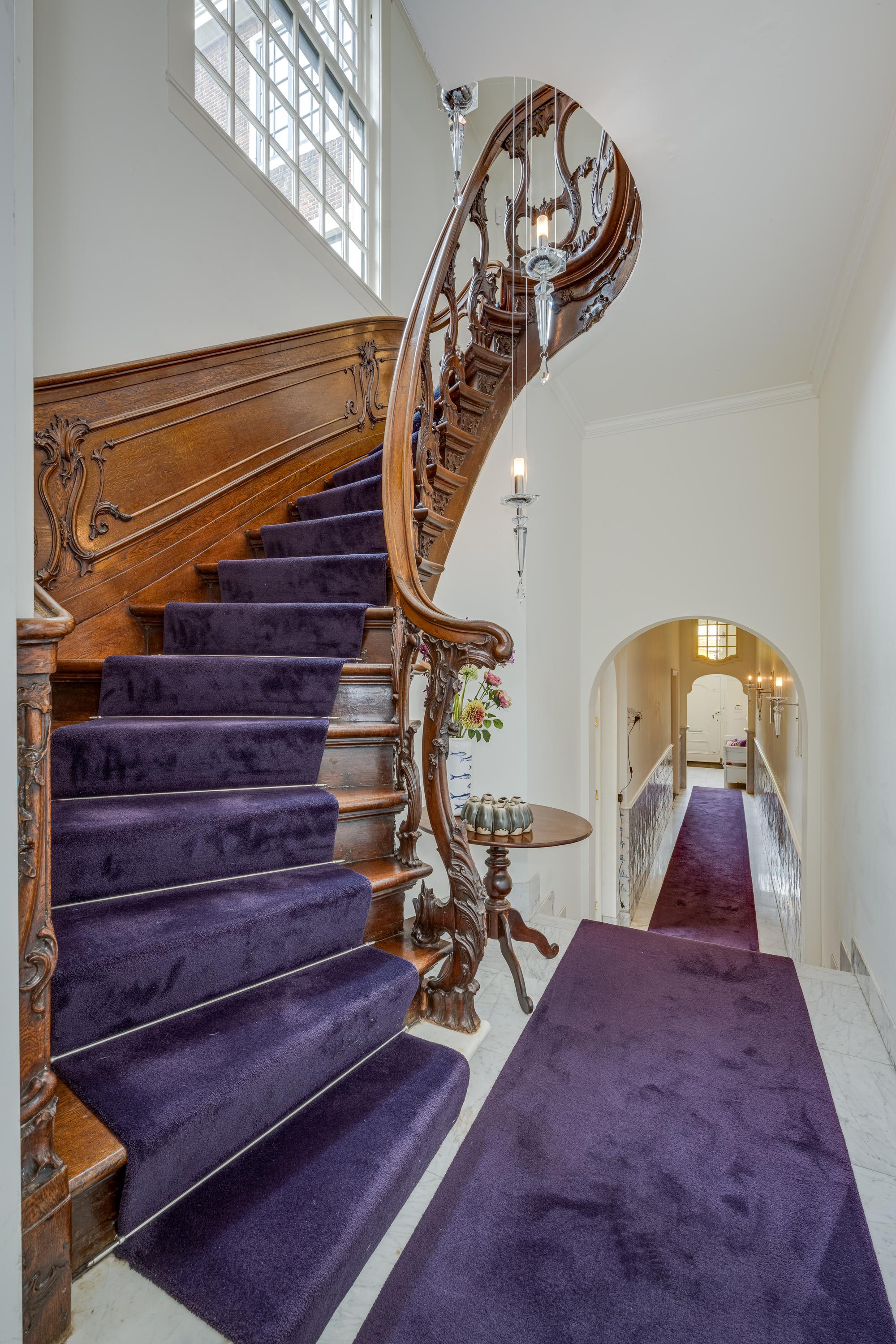Dès l’entrée, les intérieurs spacieux et lumineux inspirent la quiétude ; plafonds à poutres apparentes, faïences Delft Blue et somptueux escalier insufflent une véritable identité architecturale. Une cuisine Bulthaup s’ouvre sur le jardin urbain exposé ouest, mature et protégé du tumulte. Les premier et étages supérieurs révèlent six pièces adaptées à la vie de famille, au travail ou à la détente, avec trois salles de bains réparties sur l’ensemble. À l’arrière, une terrasse privée relie la suite parentale au ciel, tandis que les espaces de vie offrent de belles vues sur le canal et la ville animée.