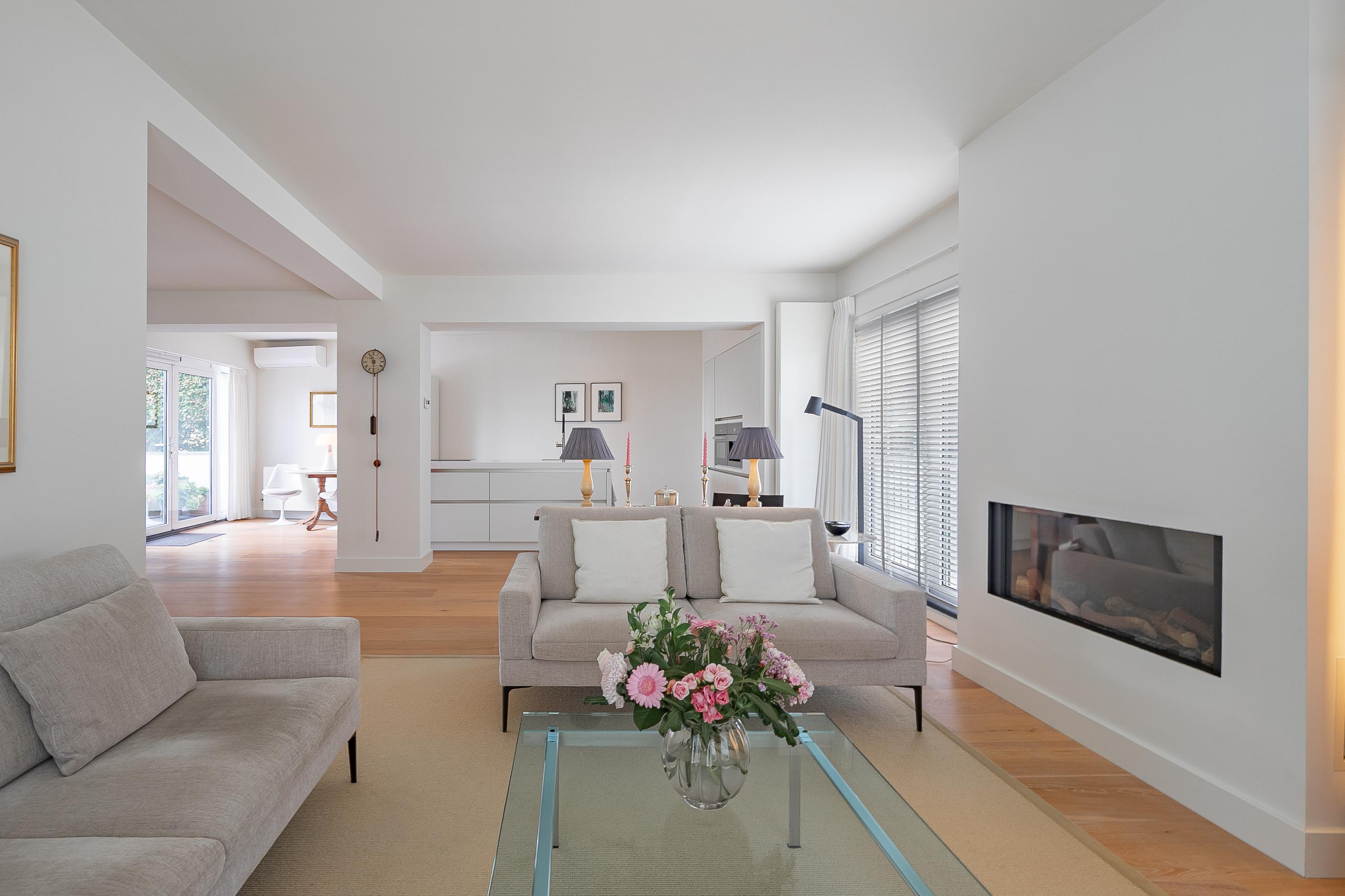 Le rez-de-chaussée décloisonné se structure autour d’un vaste espace de vie d’environ 68 m², mis en valeur par un parquet en chêne, une cheminée à gaz Faber sur mesure et des radiateurs design. La cuisine épurée, sans poignées, dispose d’une plaque à induction cinq zones, d’un four à convection, d’une machine à café encastrée et de portes coulissantes ouvrant sur le jardin, facilitant le rythme du quotidien et la convivialité. L’espace séjour s’ouvre sur un jardin urbain abrité orienté nord-est, ainsi que sur une cour arborée à l’avant bénéficiant de l’ensoleillement du soir.