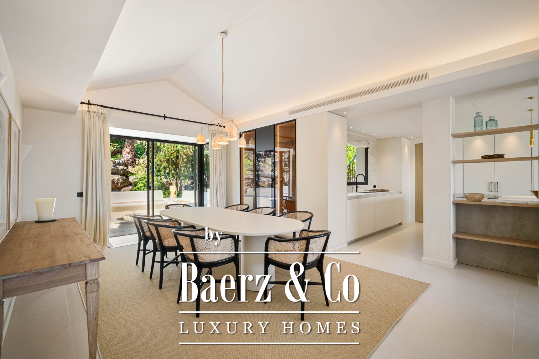 La Villa Marbella avec vues sur la mer et la montagne s’établit en toute tranquillité à Nueva Andalucía, à quelques minutes du parcours de golf Los Naranjos et à proximité des plages prisées et des restaurants renommés de Marbella. Entièrement rénovée de plain-pied, cette villa offre 241 m² de surface habitable sur un terrain surélevé de 855 m² et incarne l’art de vivre méditerranéen. L’espace de vie principal se distingue par sa conception ouverte, ses plafonds voûtés et une palette de tons naturels apaisants. La lumière circule librement à travers des baies vitrées donnant sur une vaste terrasse, où la piscine à débordement semble suspendue au-dessus de la vallée. Depuis l’intérieur comme depuis le rooftop, une vue dégagée s’étend à travers la vallée jusqu’à la mer.