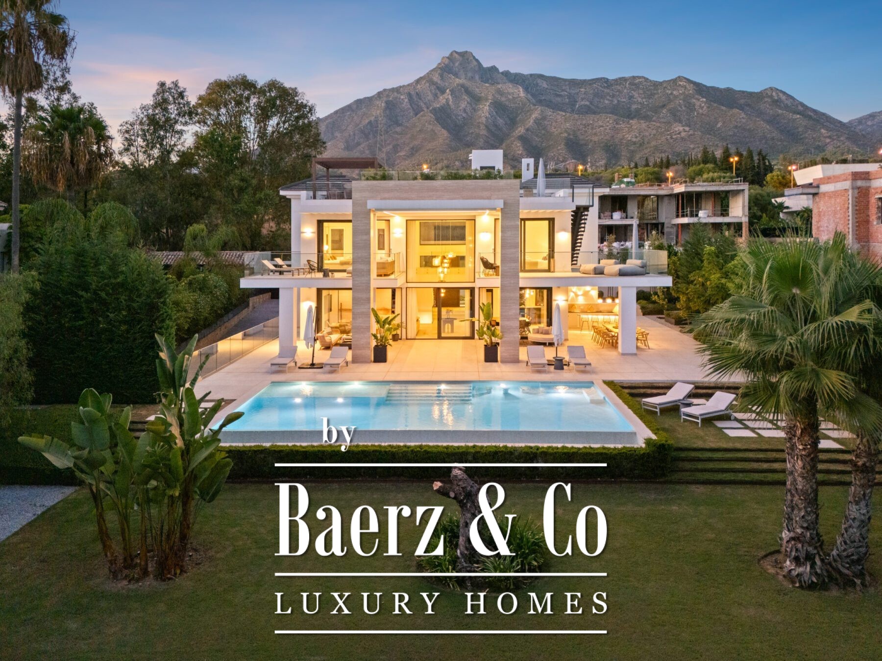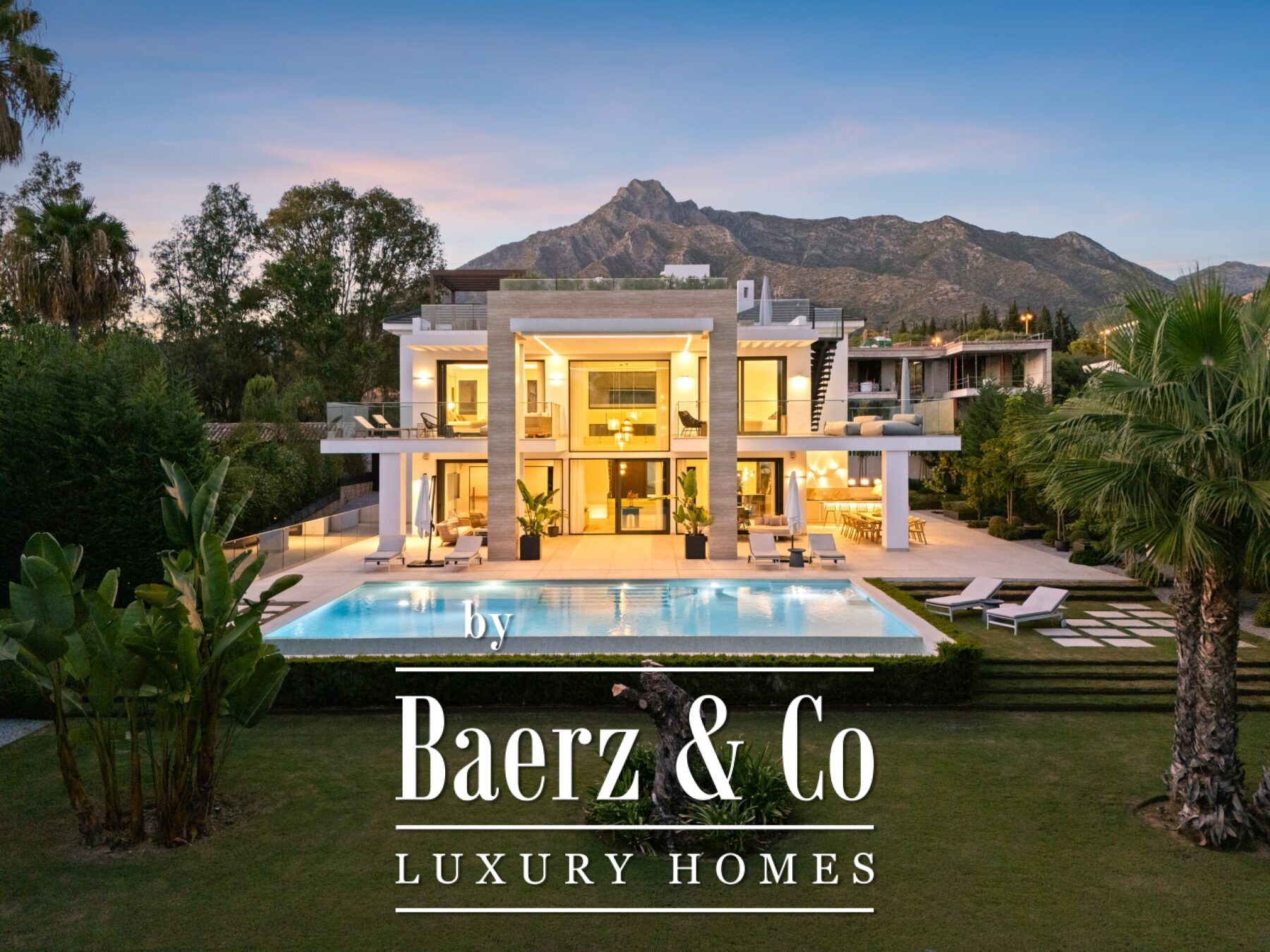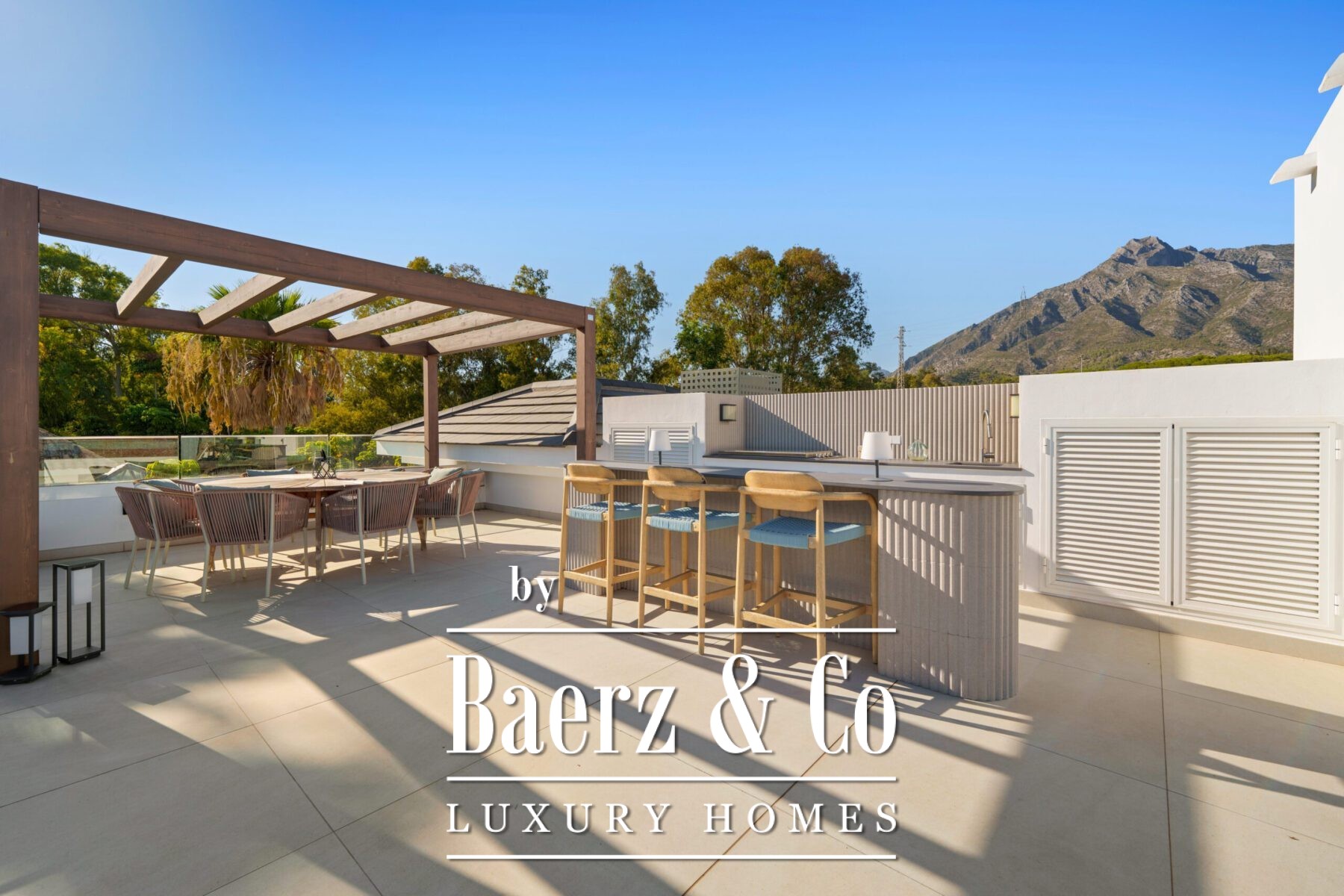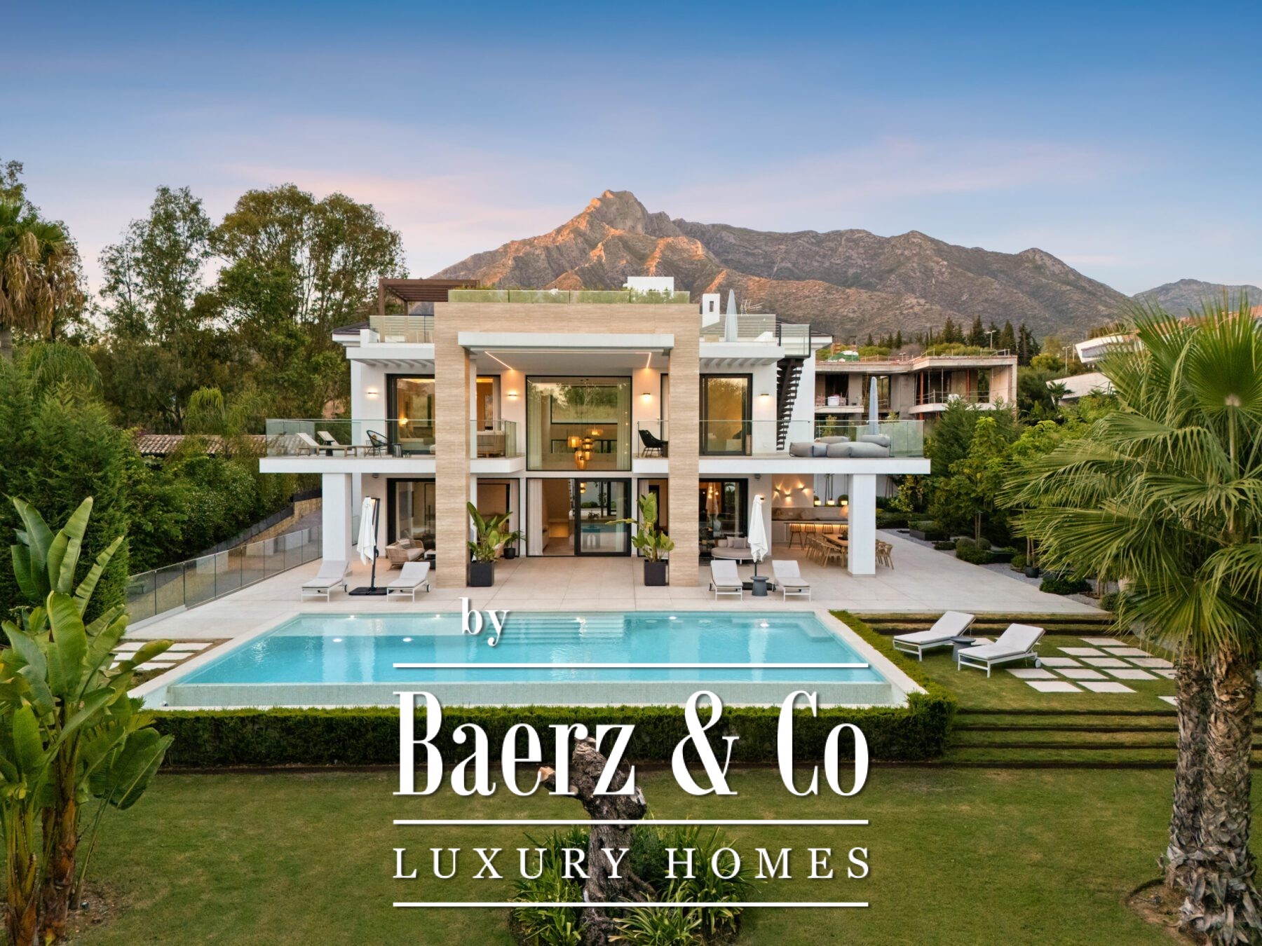 Les volumes généreux comprennent une salle à manger de réception, une cuisine de designer et un salon de divertissement raffiné, tous empreints d’une élégance discrète. Les suites, chacune avec leur propre salle de bain, constituent de véritables havres de paix, tandis que la suite parentale révèle une salle de bain inspirée d’un spa avec baignoire îlot et vues imprenables sur la montagne La Concha. La vie extérieure, à la fois privée et spectaculaire, s’organise autour de multiples terrasses, d’un lounge sur le toit avec jacuzzi et d’une piscine à débordement, le tout entouré de jardins paysagers sur une parcelle de 1 556 m².