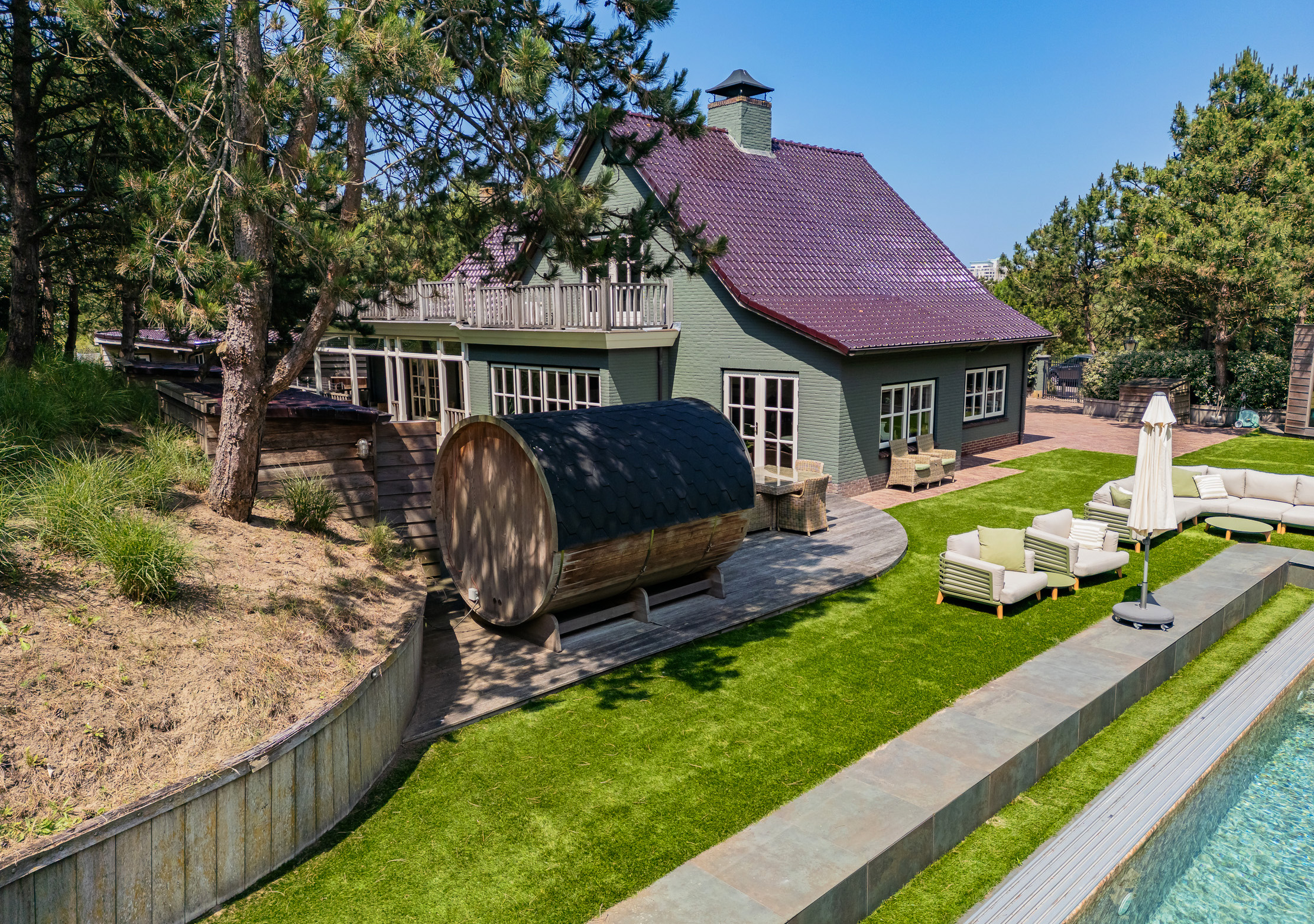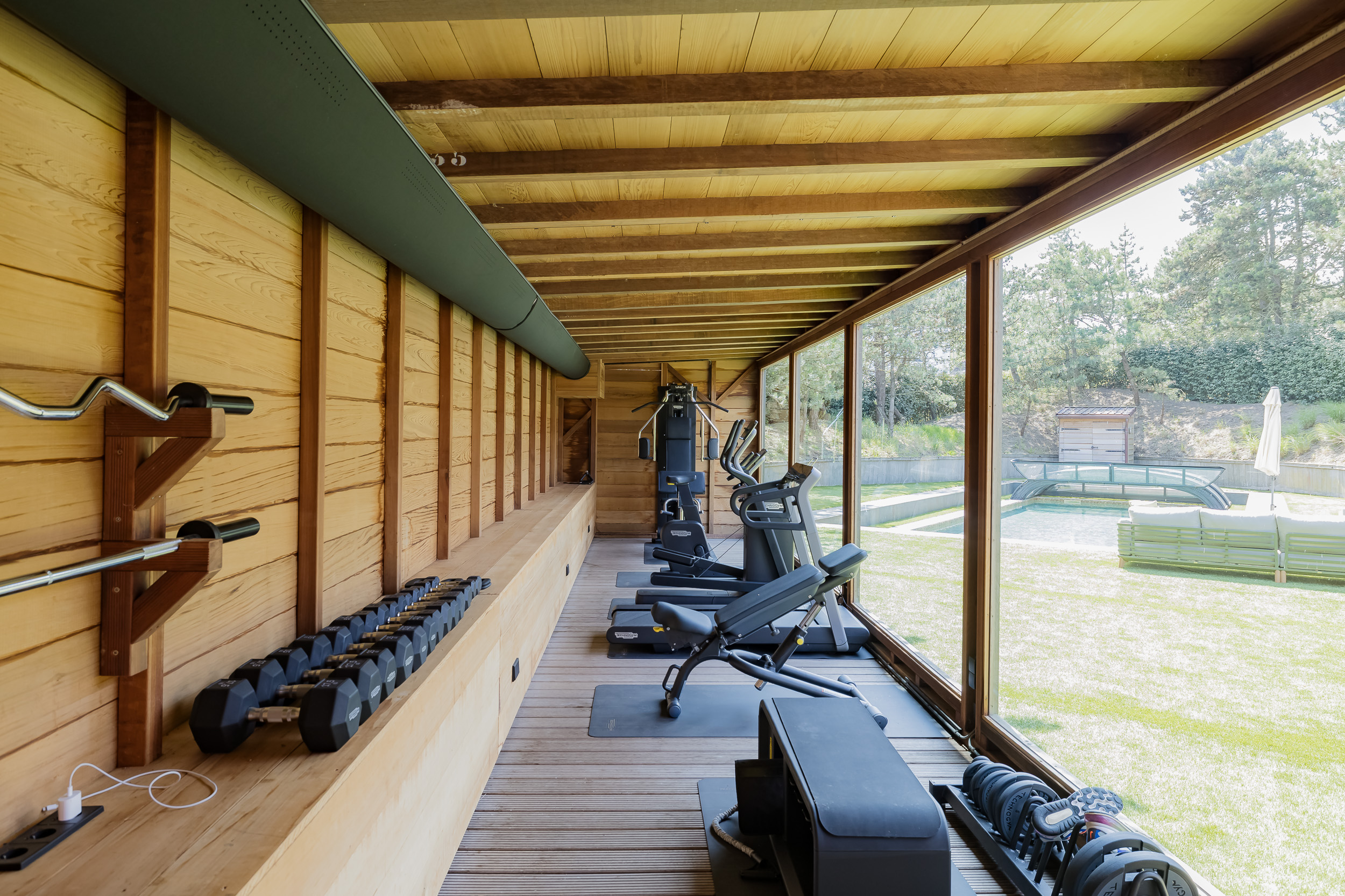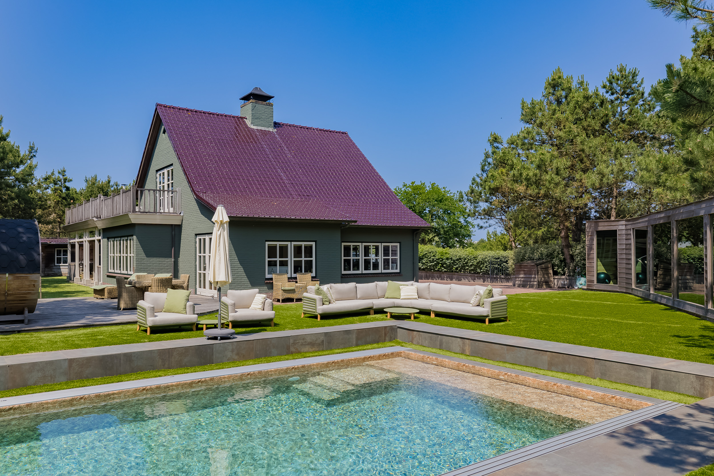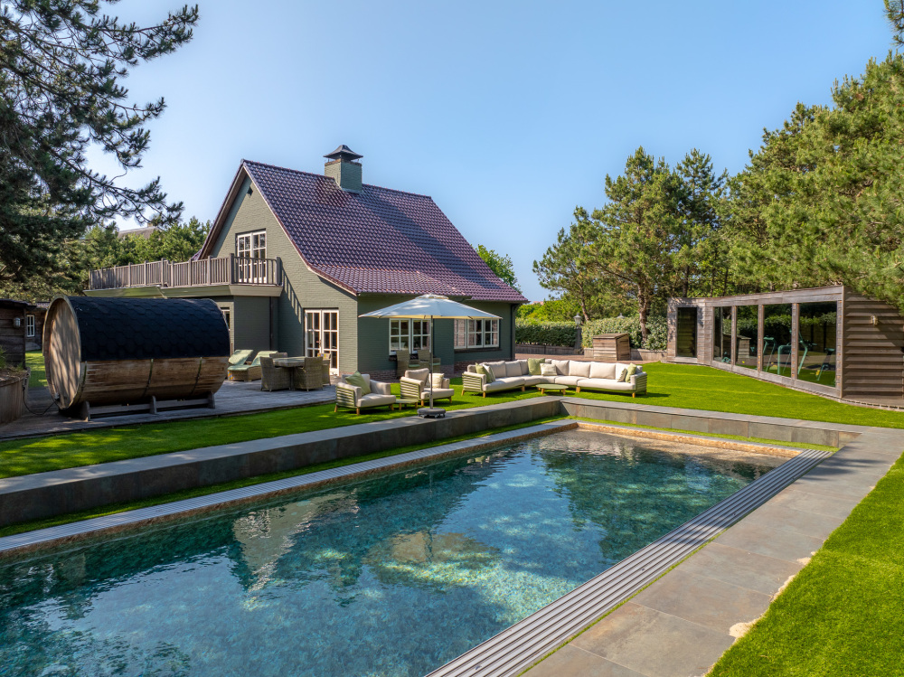 À l’extérieur, l’aménagement paysager fait appel au Cèdre rouge, au bois dur et au cuivre pour façonner des annexes peu exigeantes en entretien, une salle de sport entièrement équipée avec appareils TechnoGym et un sauna. La piscine chauffée de 14 x 5 mètres, la cuisine extérieure, les espaces invités, ainsi que les zones dédiées aux animaux de compagnie et aux vélos complètent cet ensemble rare. Cette villa de luxe à vendre à Noordwijk Zuidduinen offre une alliance unique de sérénité, d’intégrité architecturale et de qualité durable.