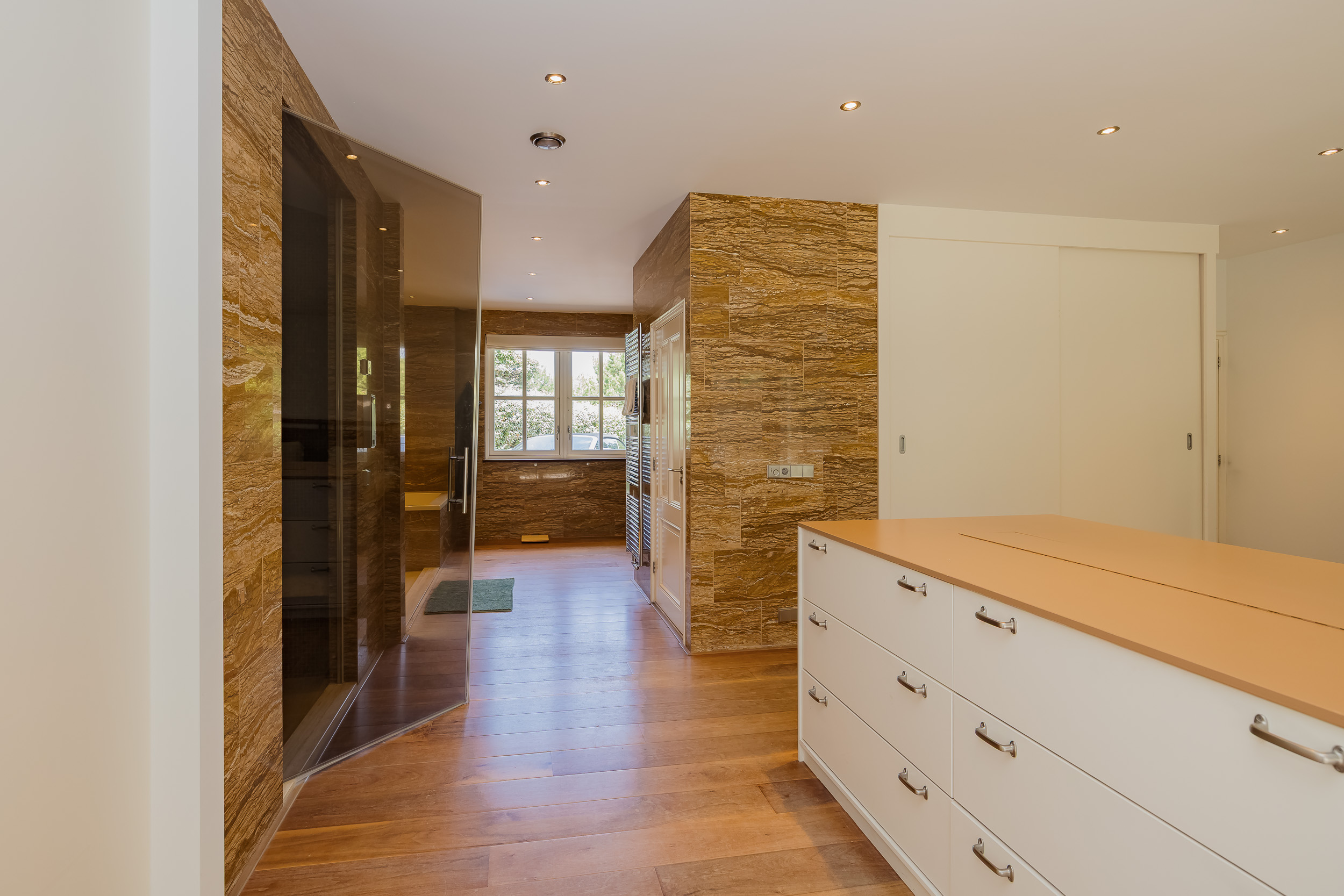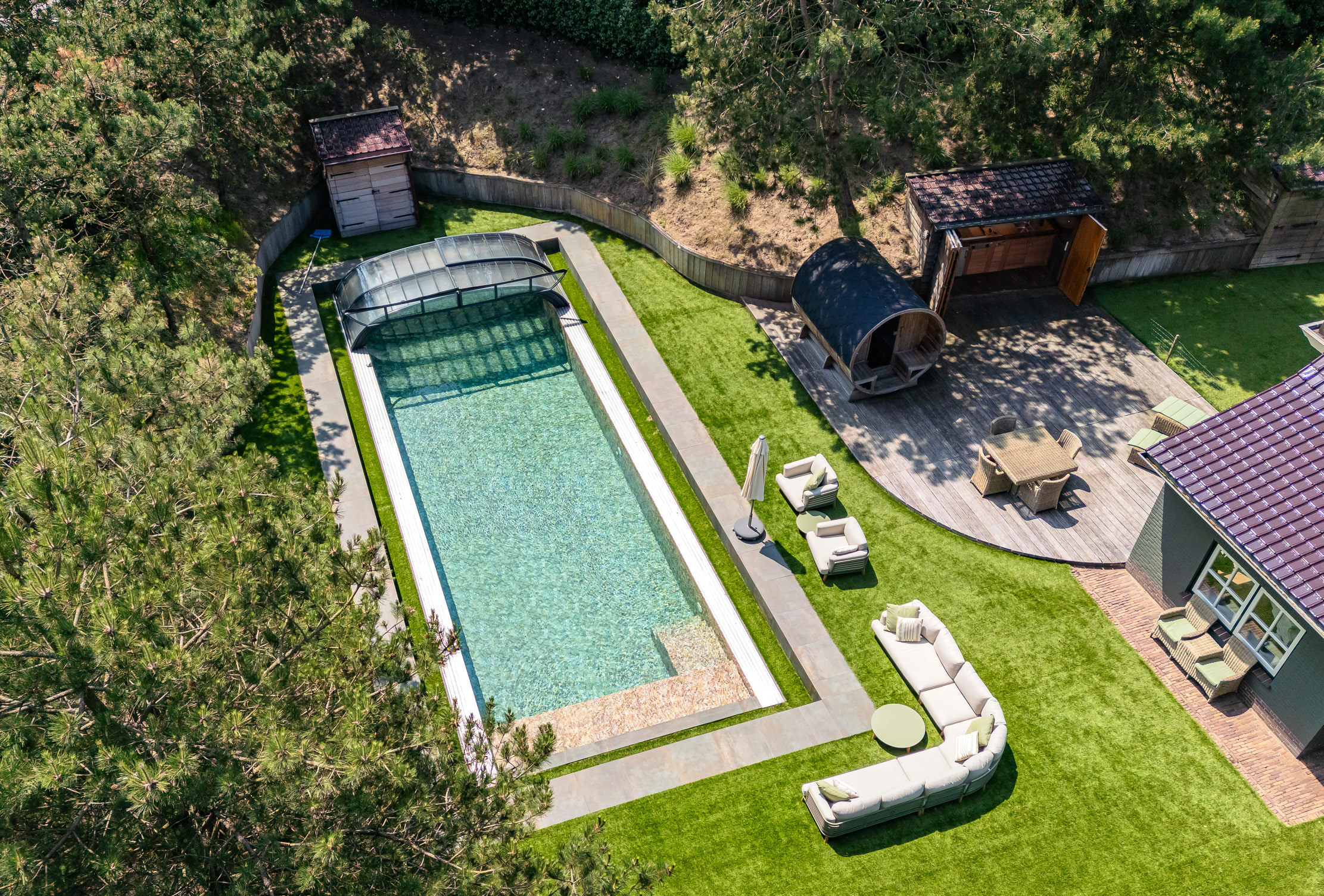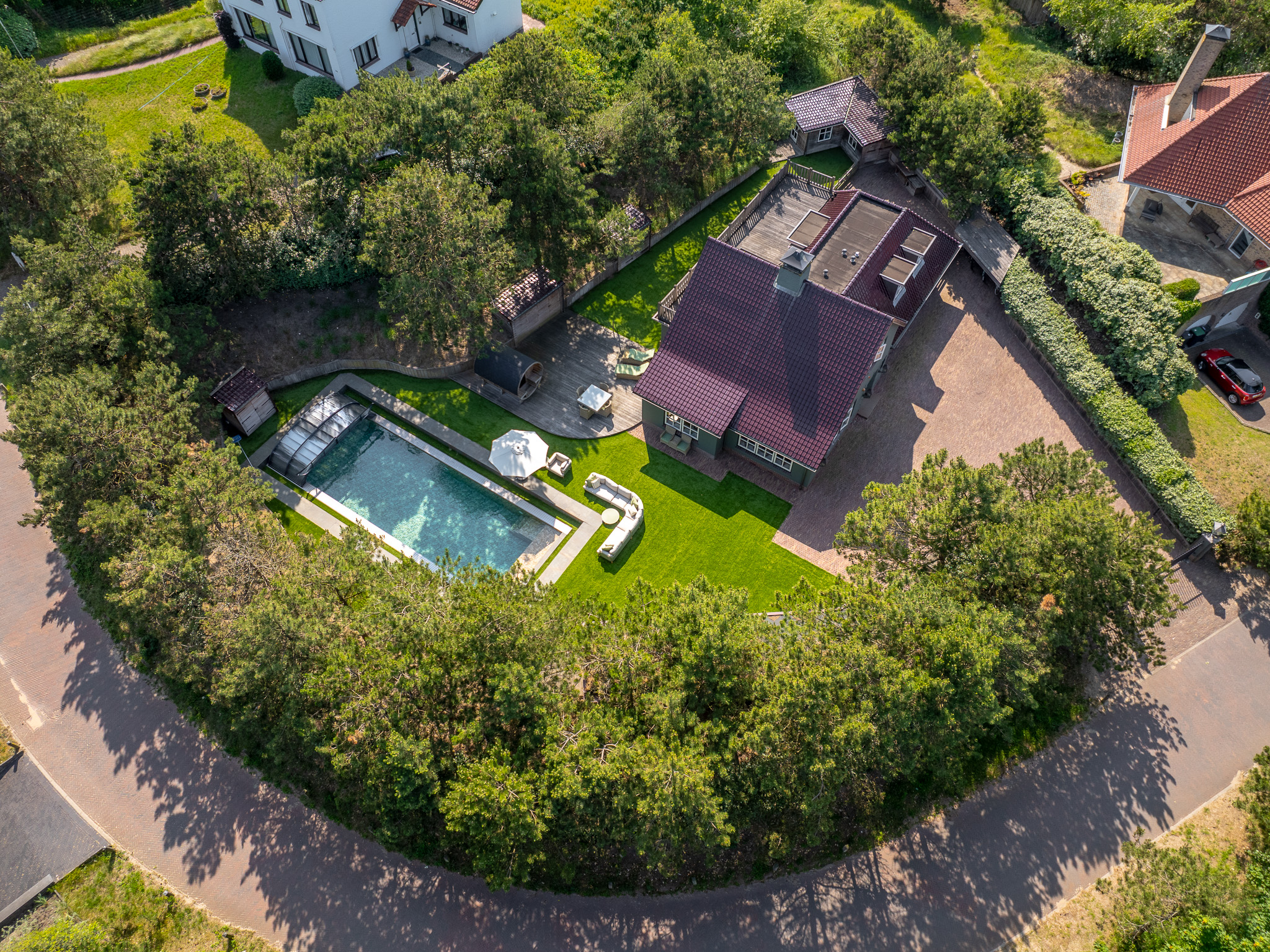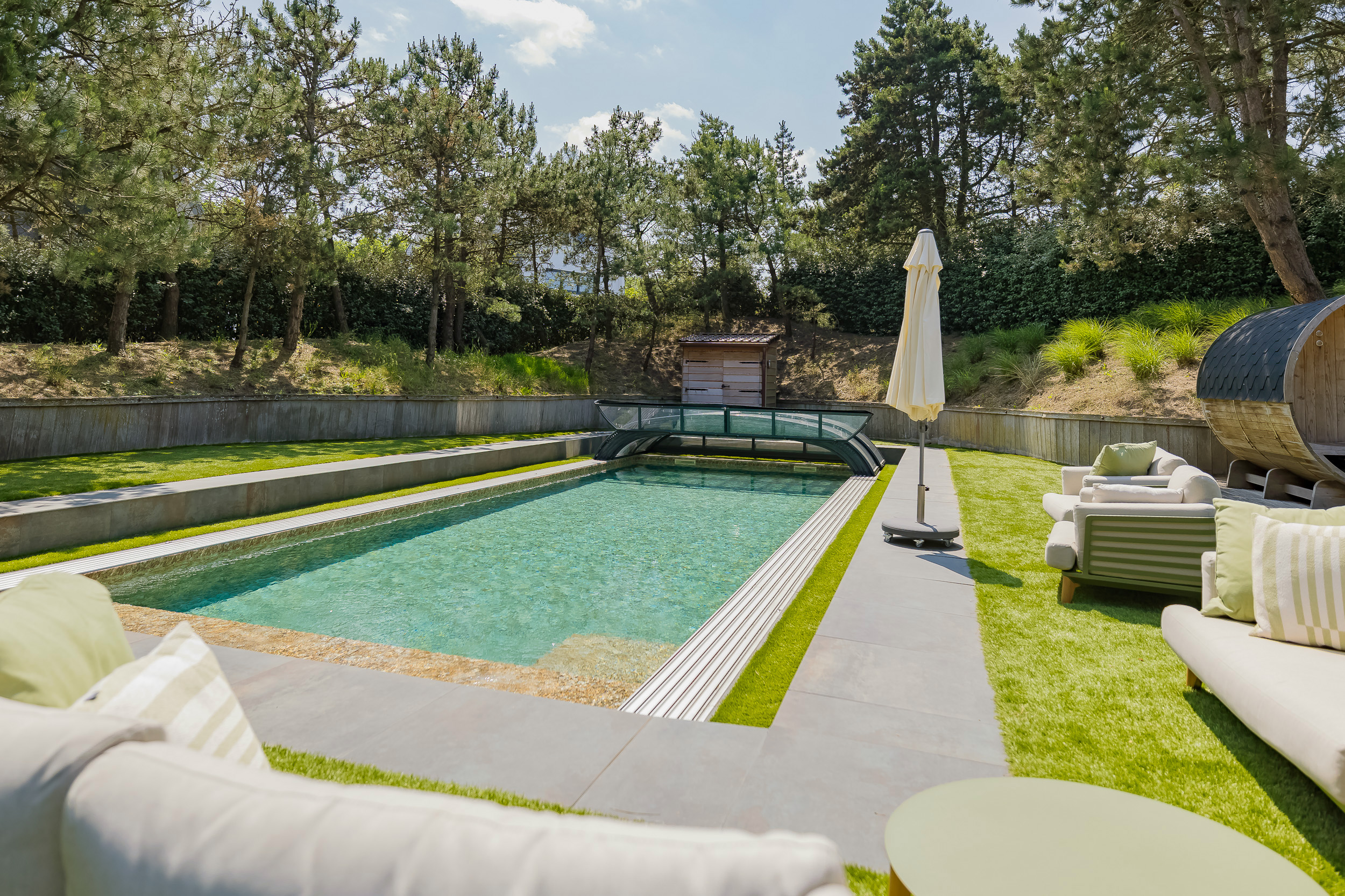 À l’extérieur, l’aménagement paysager fait appel au Cèdre rouge, au bois dur et au cuivre pour façonner des annexes peu exigeantes en entretien, une salle de sport entièrement équipée avec appareils TechnoGym et un sauna. La piscine chauffée de 14 x 5 mètres, la cuisine extérieure, les espaces invités, ainsi que les zones dédiées aux animaux de compagnie et aux vélos complètent cet ensemble rare. Cette villa de luxe à vendre à Noordwijk Zuidduinen offre une alliance unique de sérénité, d’intégrité architecturale et de qualité durable.