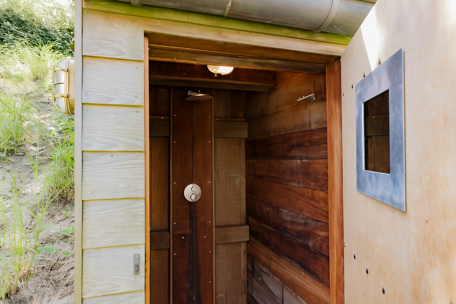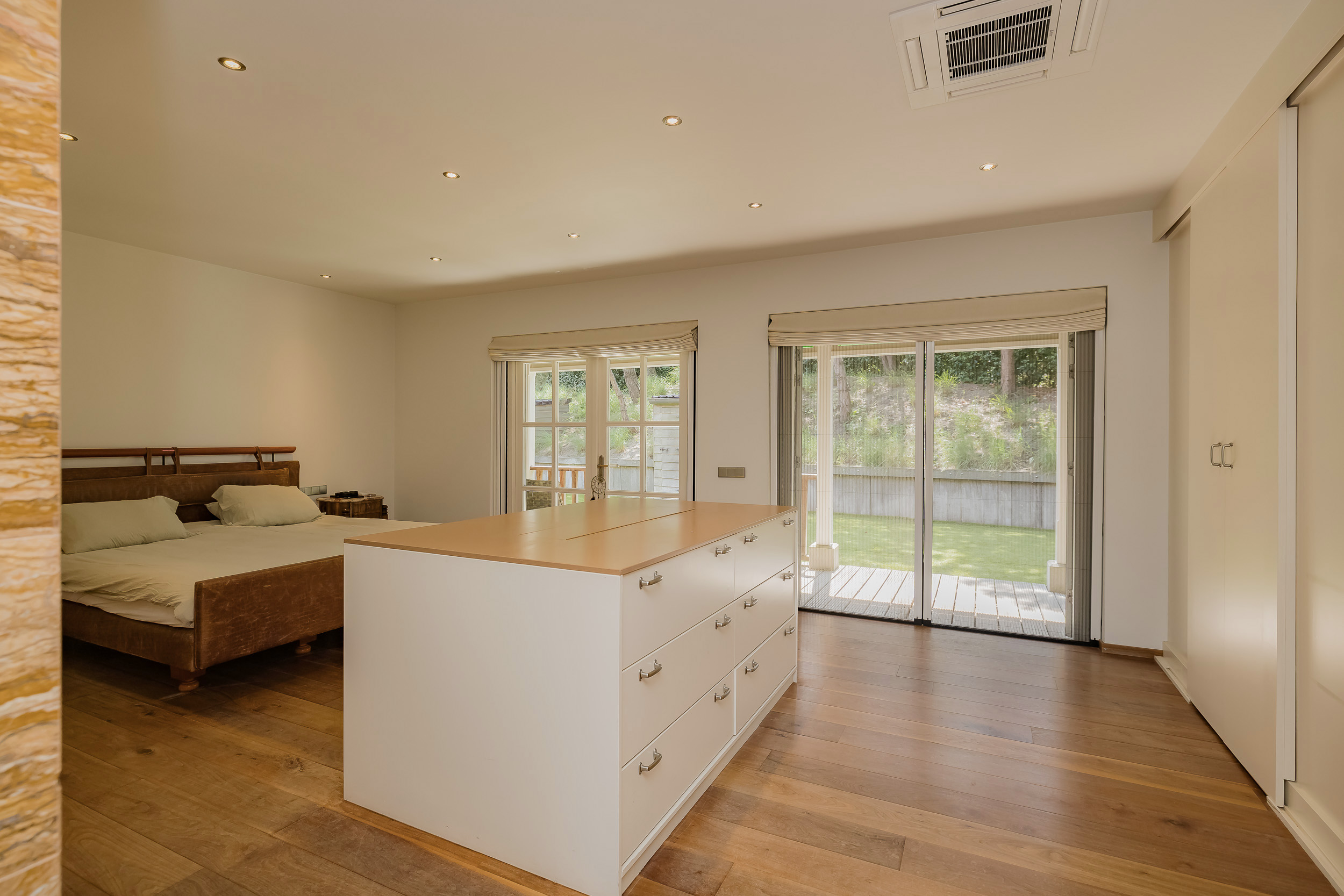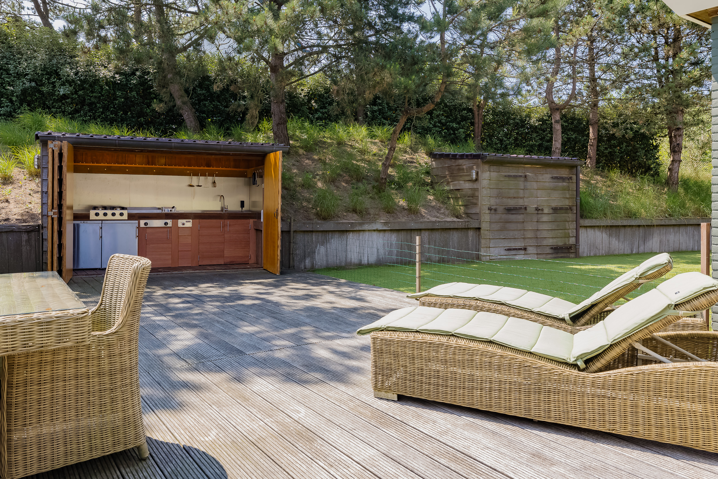 À l’étage, trois chambres climatisées et deux salles de bains sont habillées de matériaux naturels, dont la pierre bleue de Belgique. La suite parentale donne accès à une terrasse en bois exotique de 44 m² avec platelage Bankirai, où le silence et le paysage des dunes rythment le quotidien.