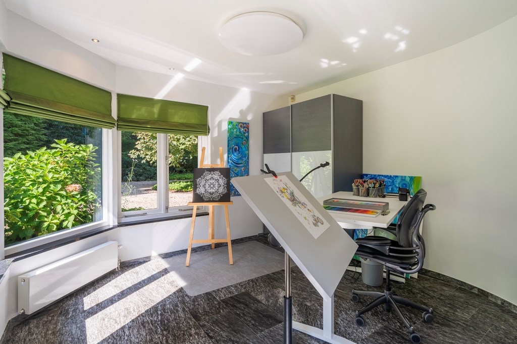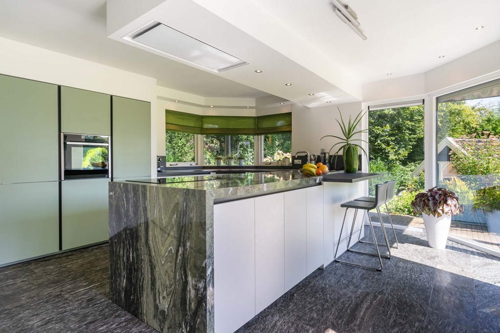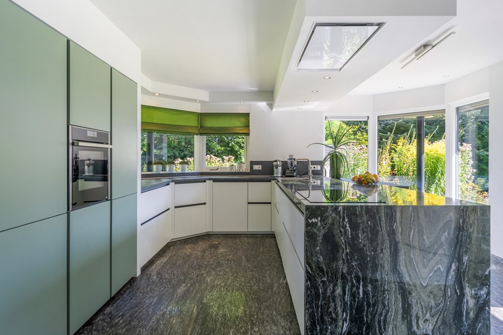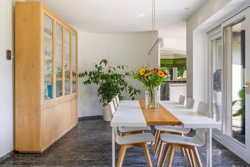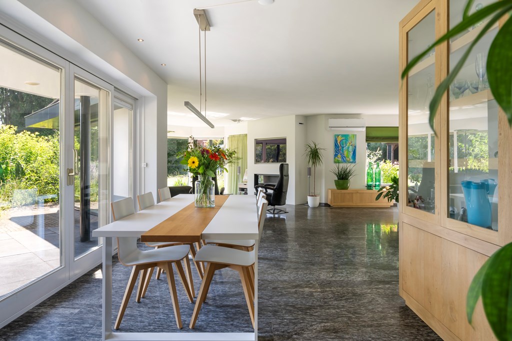 De grandes baies vitrées inondent de lumière les trois chambres et deux salles de bains, encadrant des vues verdoyantes et apaisantes. Le rez-de-chaussée s’ouvre sur un hall d’entrée lumineux, menant à un grand séjour à l’architecture singulière, doté d’une cheminée à gaz et de portes-fenêtres coulissantes ouvrant sur le jardin paysagé exposé sud-est. La cuisine, refaite en 2020, est équipée de plans de travail en pierre, d’appareils haut de gamme et s’ouvre directement sur la terrasse pour des repas en extérieur sans effort. Un bureau à ce niveau permet un usage professionnel ou la création d’une quatrième chambre.