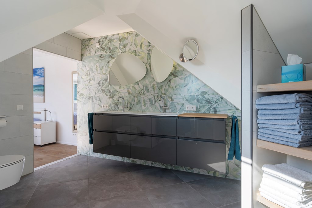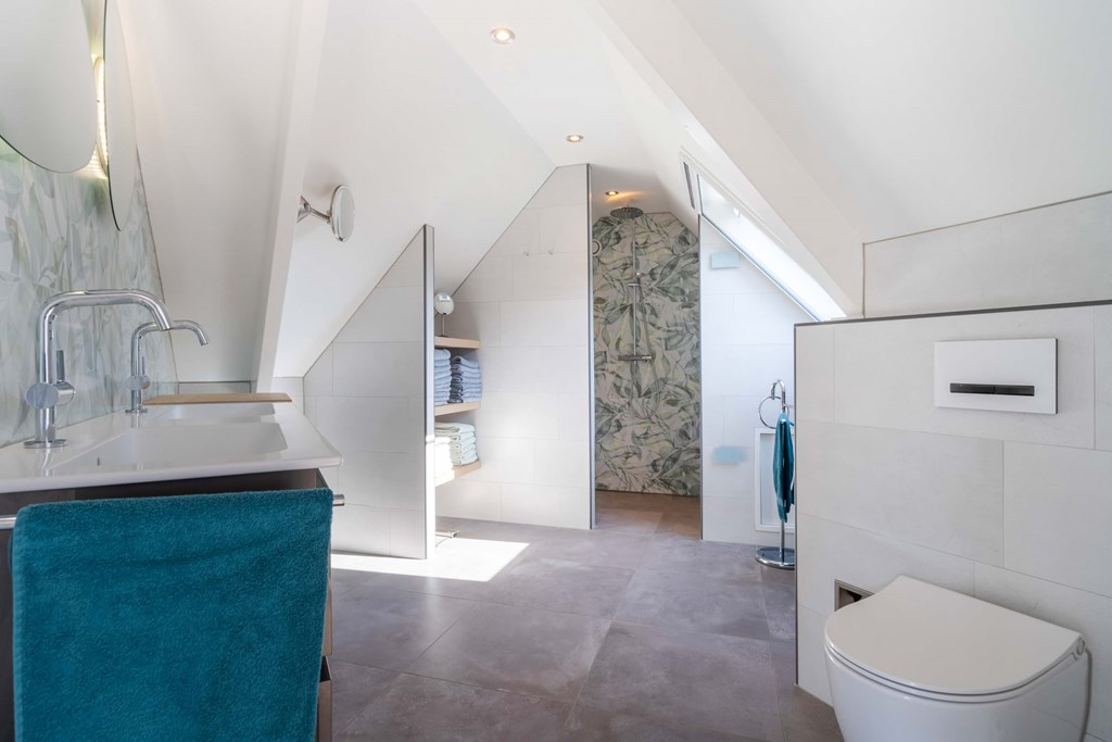 À l’étage, la suite parentale bénéficie d’une climatisation, d’une salle de bains privative aux finitions contemporaines et d’un balcon privé. Deux autres chambres disposent de placards intégrés, d’un accès au balcon et de volumes mansardés avec poutres apparentes offrant une ambiance chaleureuse. Le confort est assuré partout grâce au chauffage au sol, à la climatisation, au double vitrage et à un système d’alarme complet.
