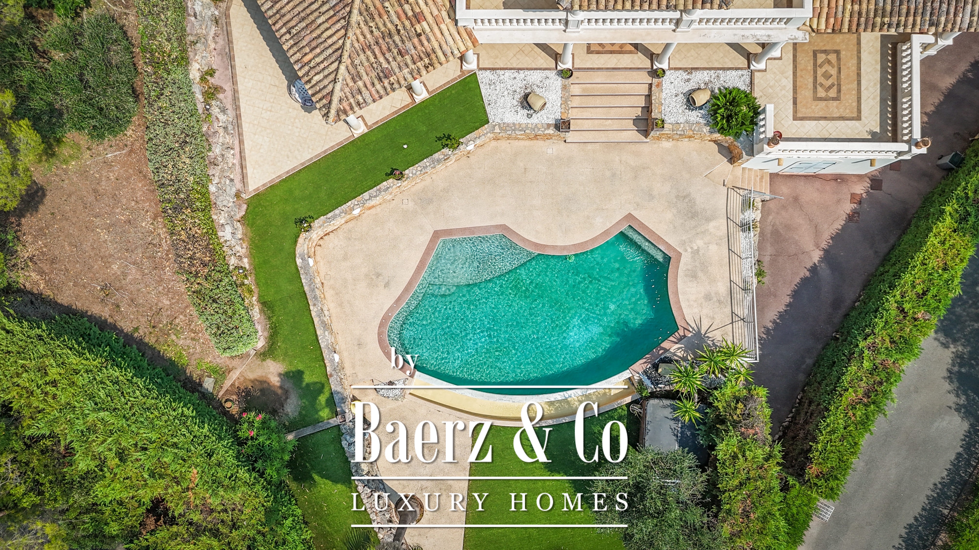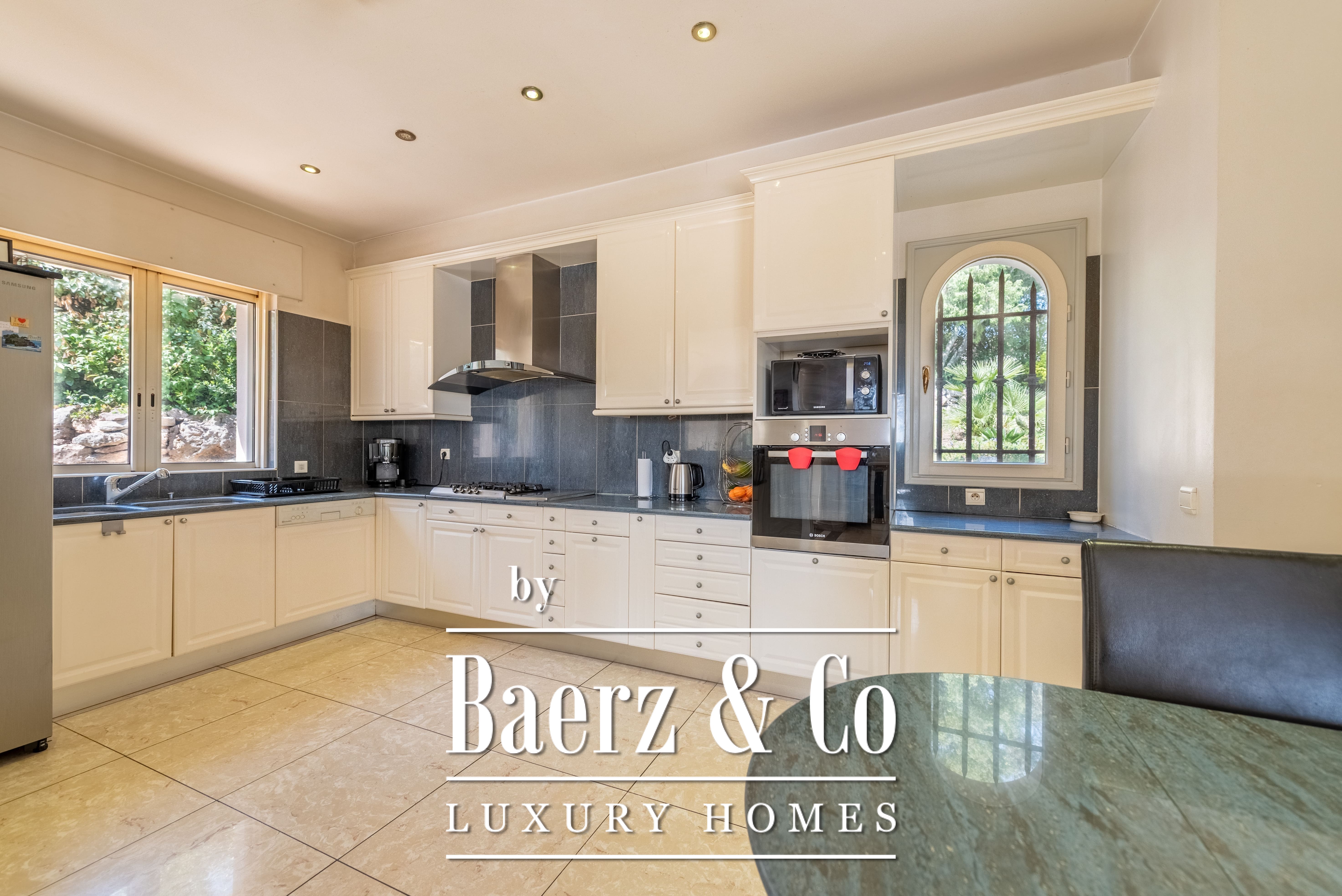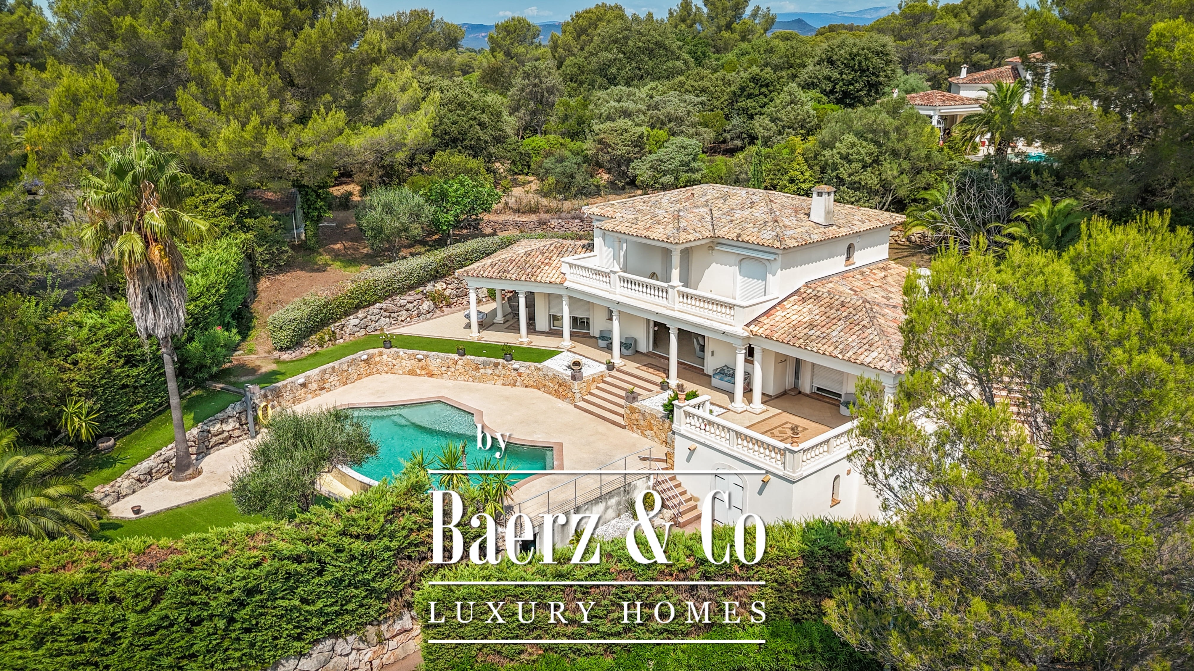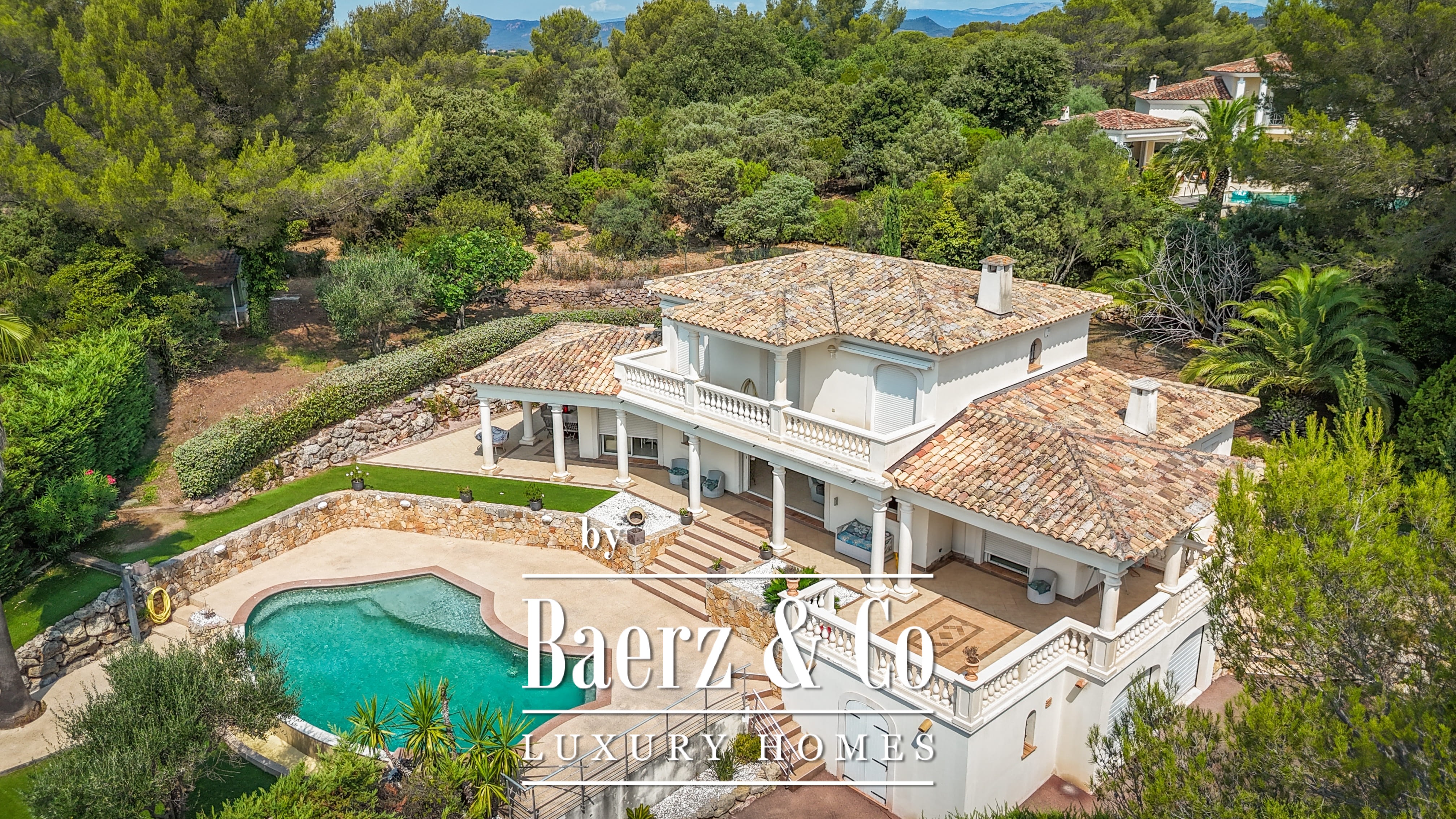 Le terrain paysager de 1 511 m² entoure la propriété de jardins matures, de multiples terrasses et d’une piscine à débordement. Au niveau inférieur, on trouve une salle de jeux, un double garage et des espaces techniques. Les équipements comprennent des huisseries aluminium, volets roulants électriques centraux, alarme, vidéosurveillance et portail électrique, pour une sécurité optimale.