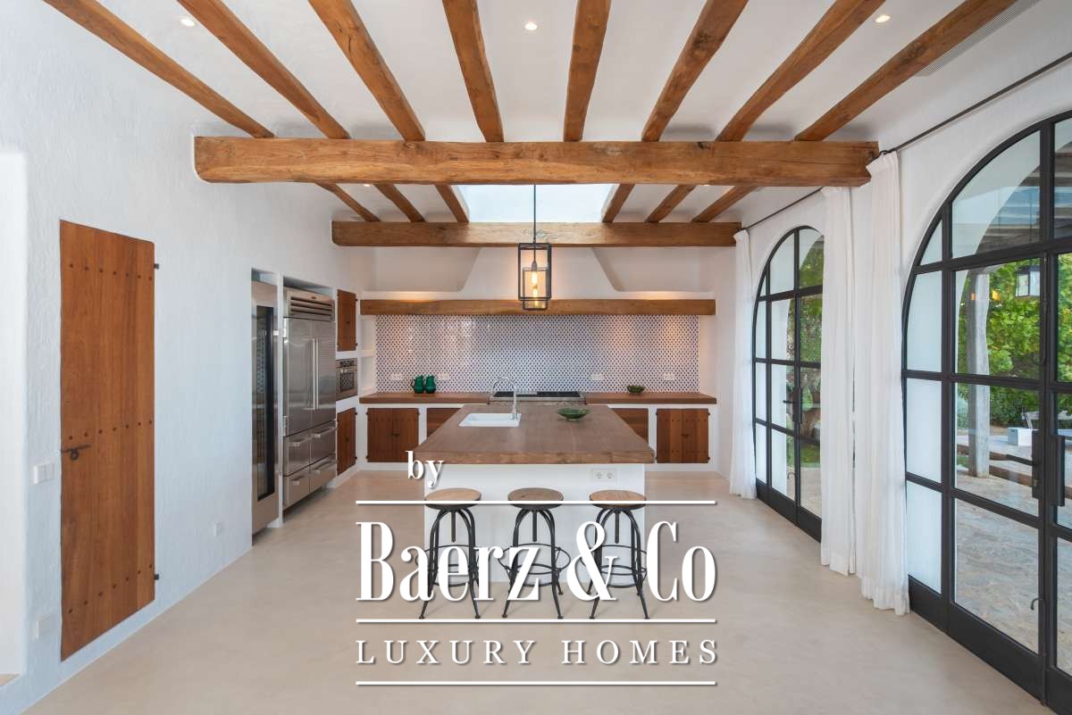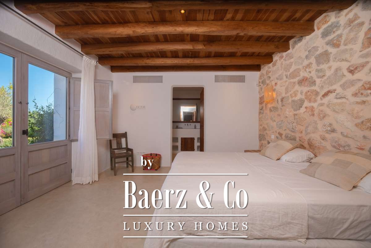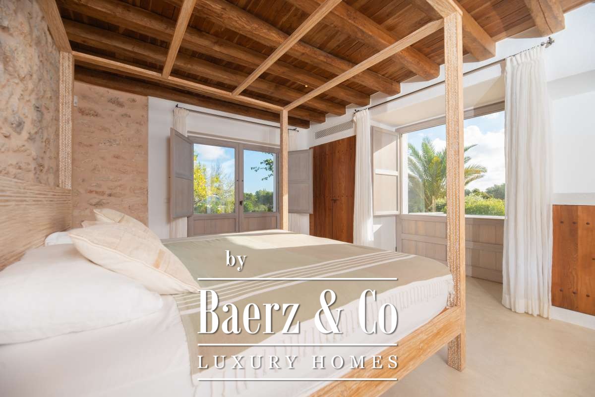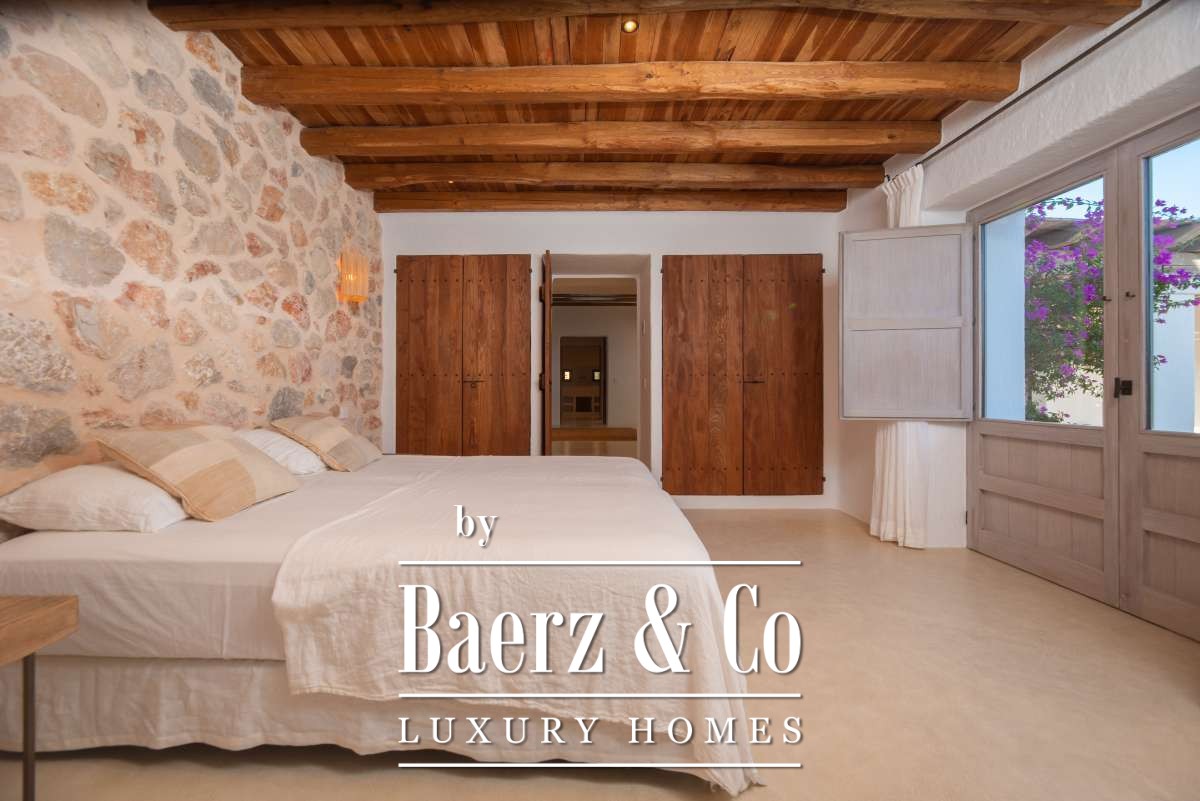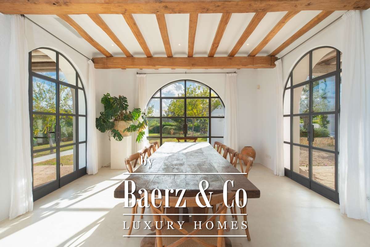 Autrefois une finca authentique agrandie dans les années 1940, la maison propose désormais 506 m² d’espaces de vie répartis entre 361,7 m² au rez-de-chaussée et 144,64 m² à l’étage. Quatre chambres et cinq salles de bains ont été rénovées avec soin, chaque détail respectant l’architecture cubique et la simplicité rustique. Les espaces de vie s’harmonisent avec les terrasses du jardin, invitant à une douceur de vivre méditerranéenne.