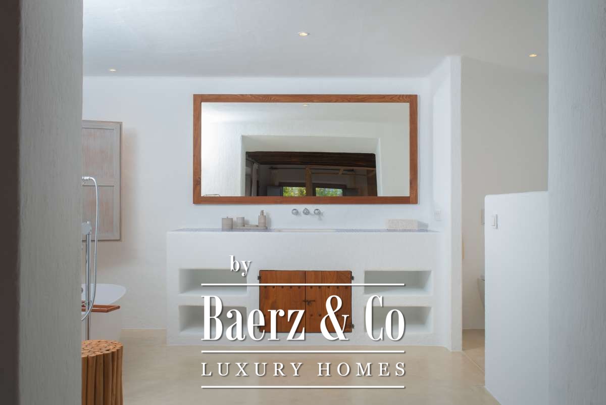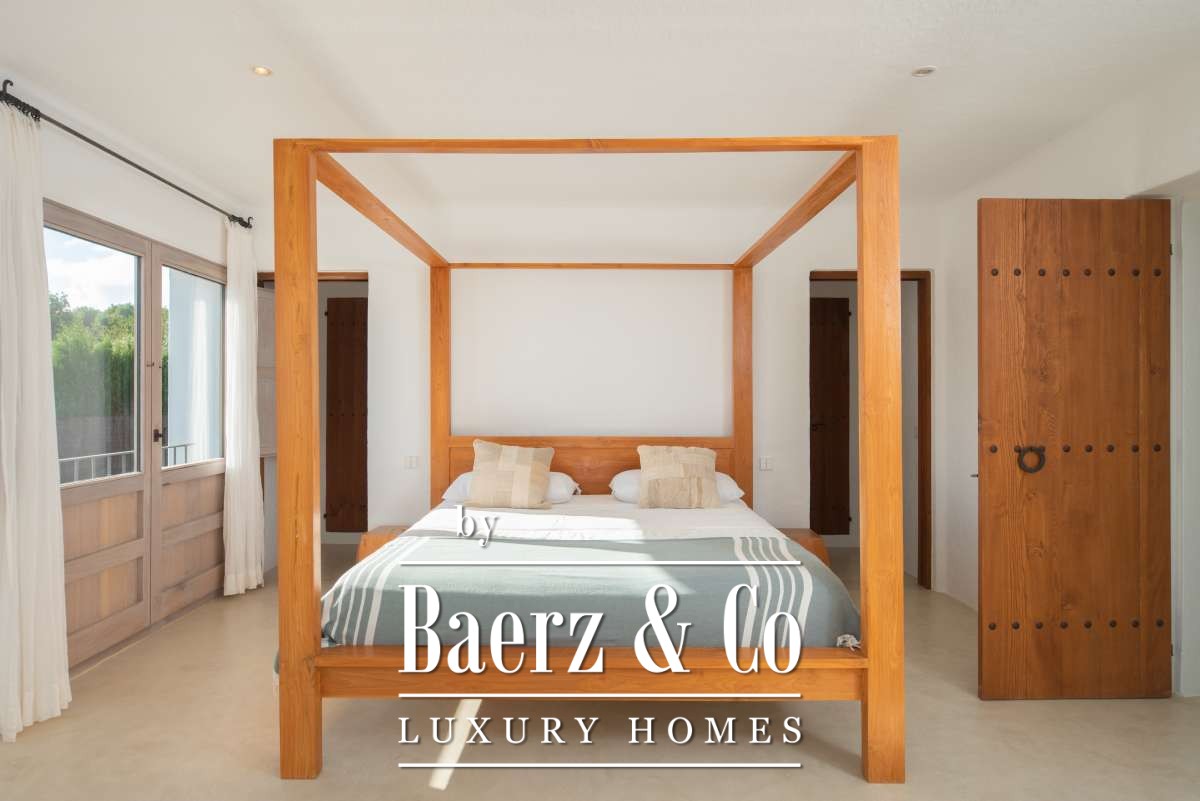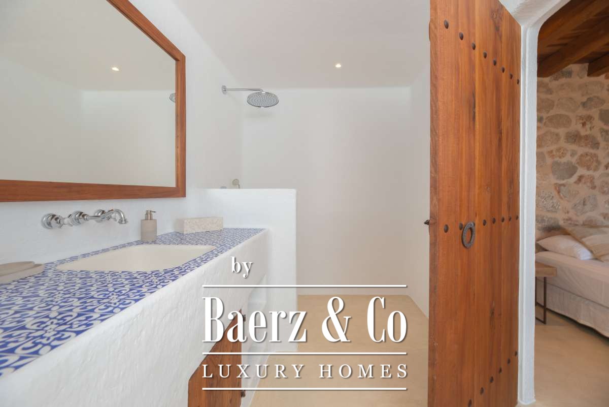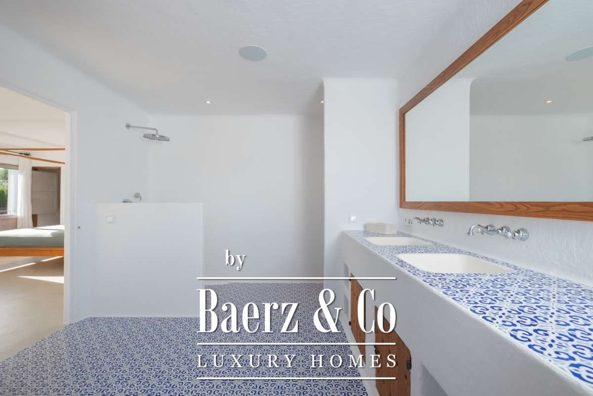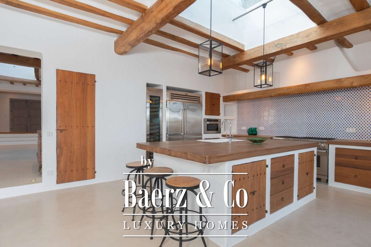 Autrefois une finca authentique agrandie dans les années 1940, la maison propose désormais 506 m² d’espaces de vie répartis entre 361,7 m² au rez-de-chaussée et 144,64 m² à l’étage. Quatre chambres et cinq salles de bains ont été rénovées avec soin, chaque détail respectant l’architecture cubique et la simplicité rustique. Les espaces de vie s’harmonisent avec les terrasses du jardin, invitant à une douceur de vivre méditerranéenne.