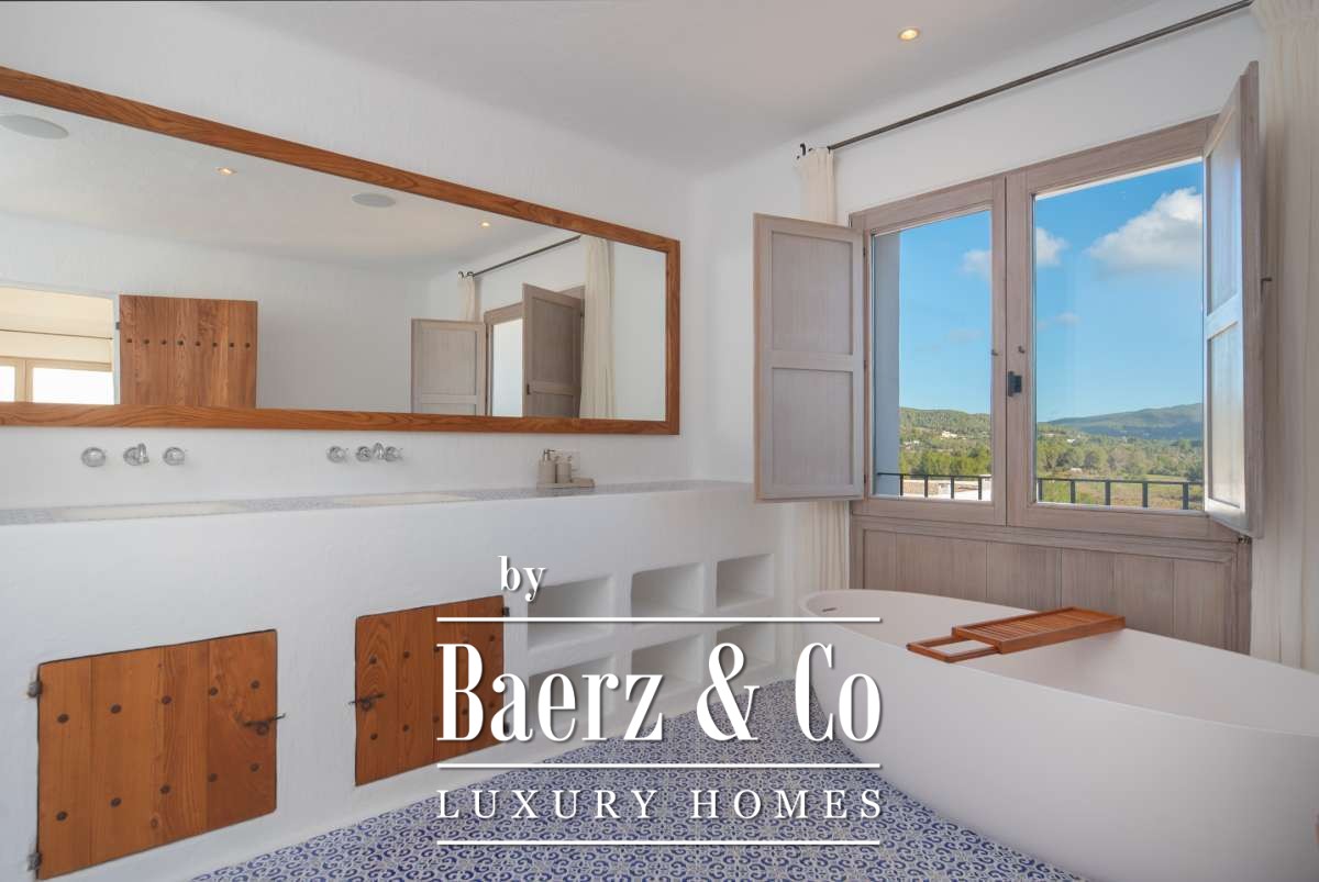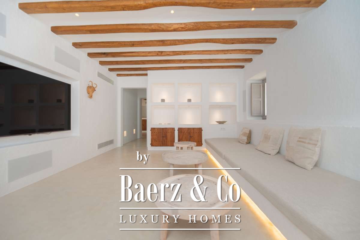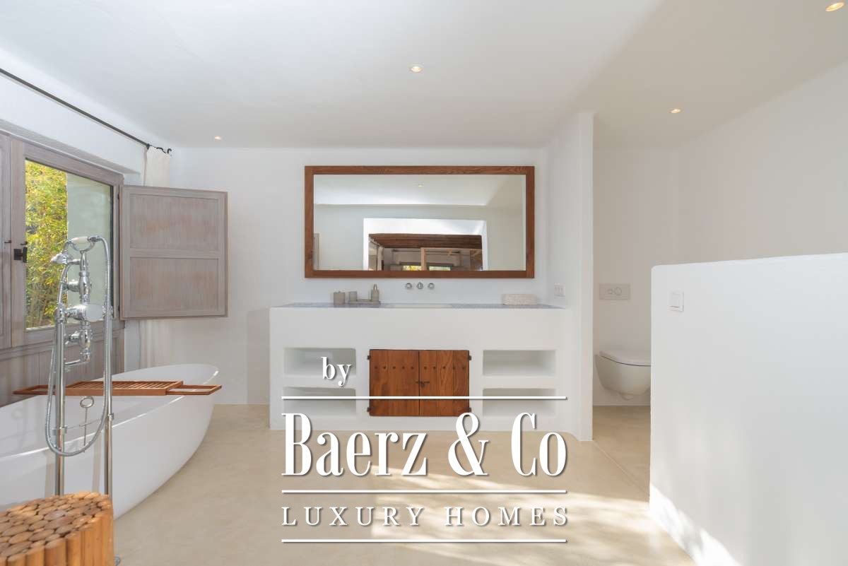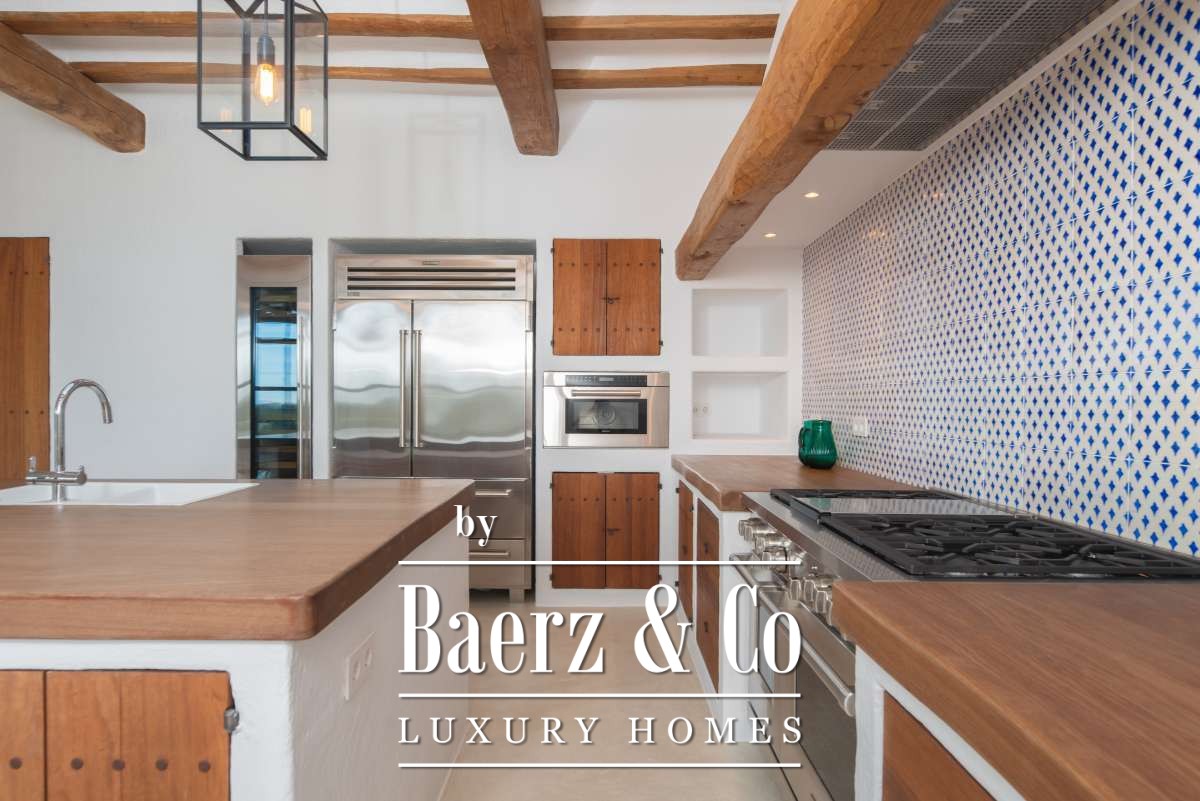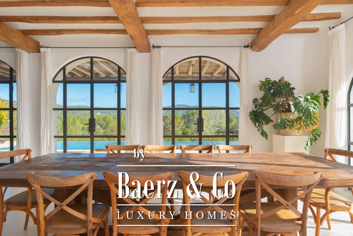 Autrefois une finca authentique agrandie dans les années 1940, la maison propose désormais 506 m² d’espaces de vie répartis entre 361,7 m² au rez-de-chaussée et 144,64 m² à l’étage. Quatre chambres et cinq salles de bains ont été rénovées avec soin, chaque détail respectant l’architecture cubique et la simplicité rustique. Les espaces de vie s’harmonisent avec les terrasses du jardin, invitant à une douceur de vivre méditerranéenne.