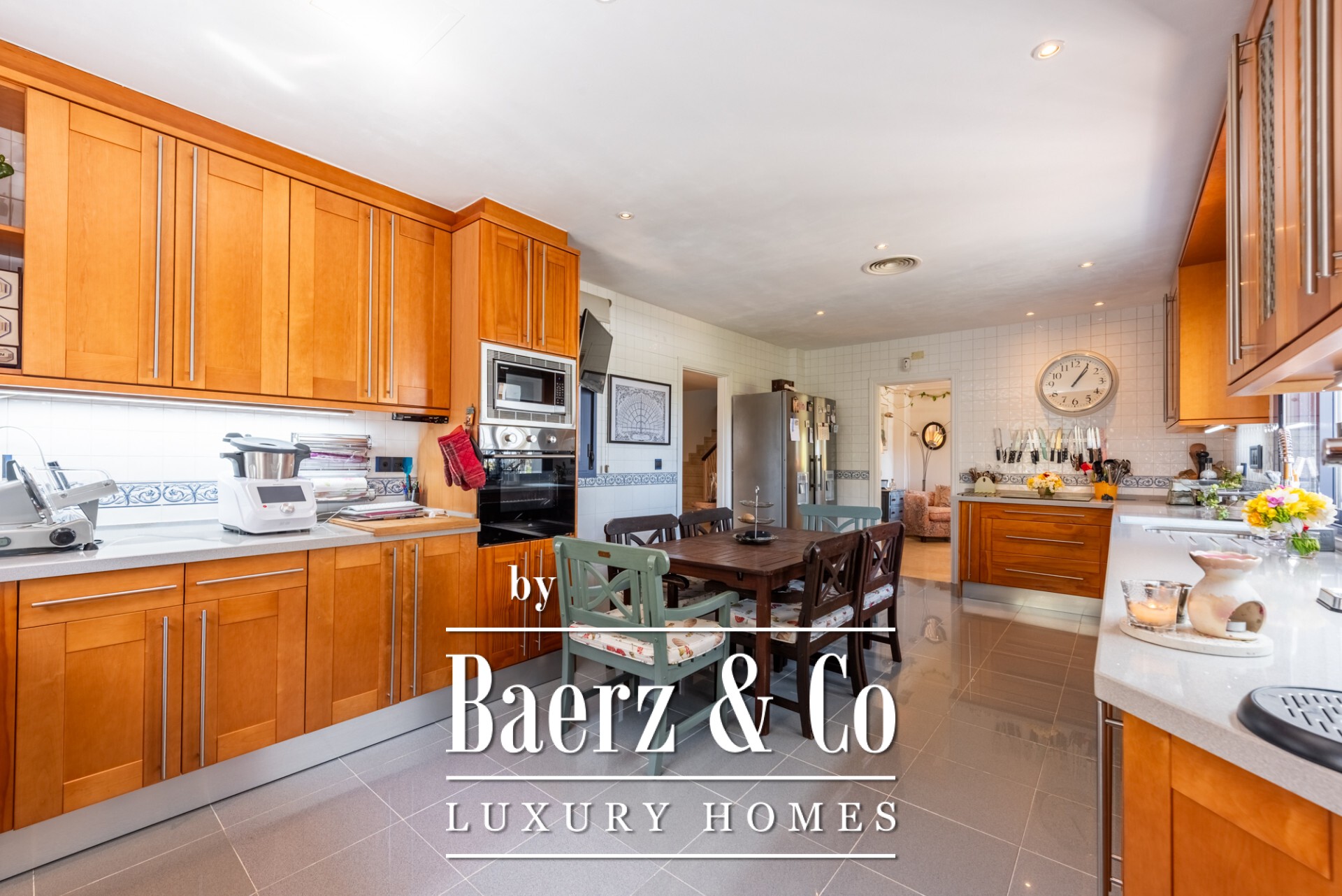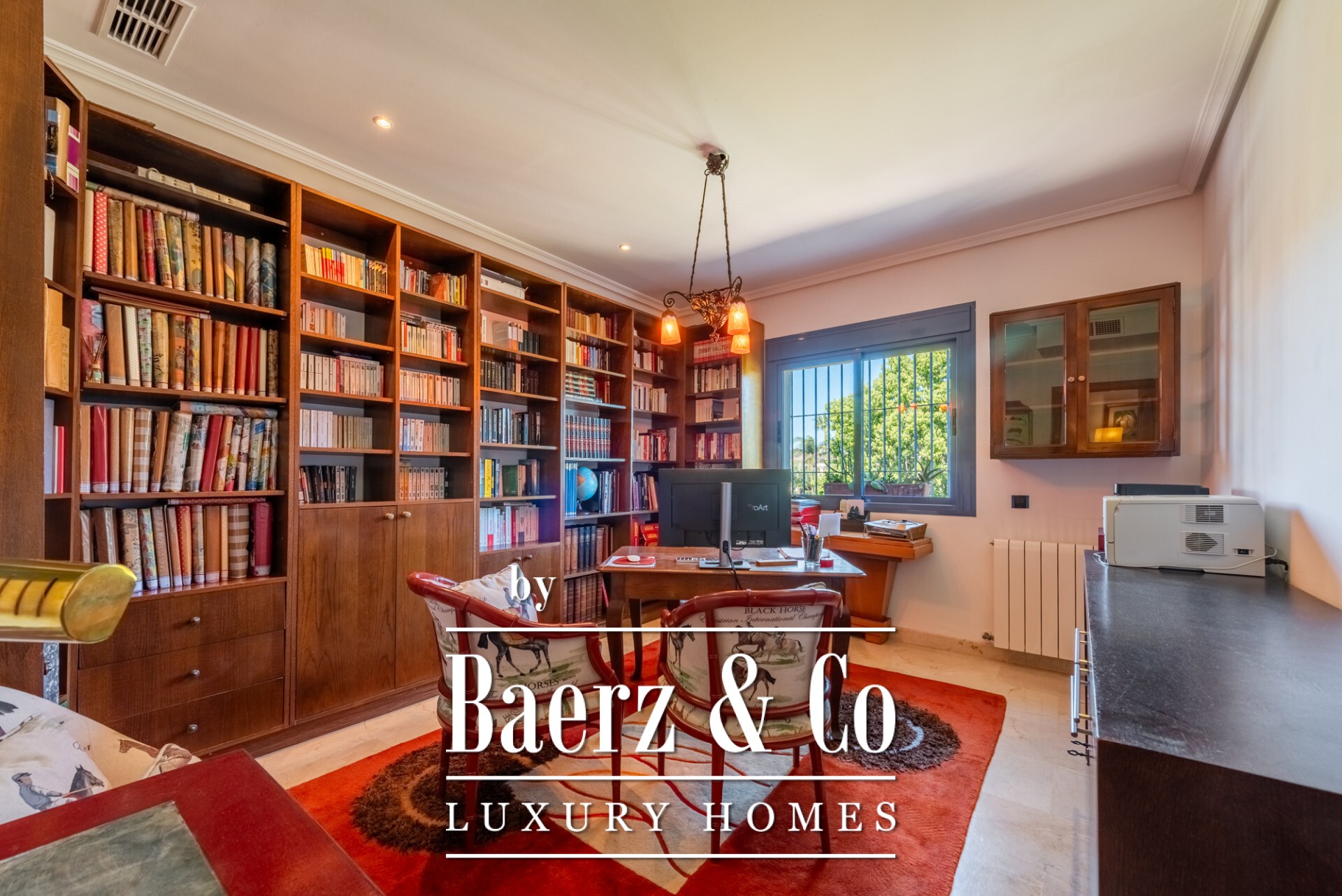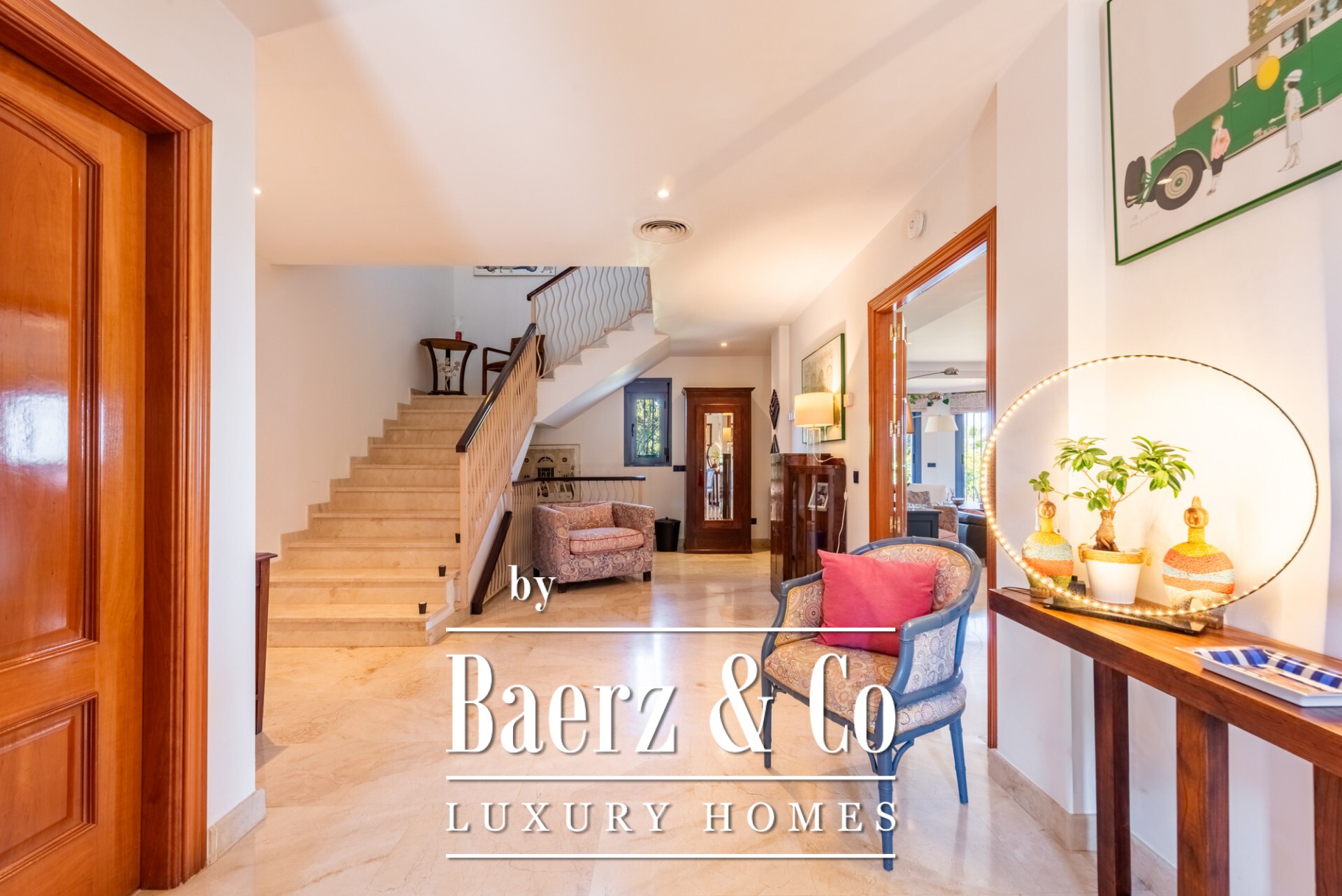 Cette villa propose six chambres et cinq salles de bains réparties sur trois niveaux, dont une suite parentale indépendante avec dressing et salle de bain attenante, ainsi qu’un espace invités distinct. Le rez-de-chaussée relie une cuisine entièrement équipée, une salle à manger conviviale et un salon avec cheminée, chacun s’ouvrant sur des terrasses couvertes et baignées de soleil, pour une expérience de vie fluide entre intérieur et extérieur. Le chauffage central par radiateurs et la climatisation assurent un confort optimal toute l’année.