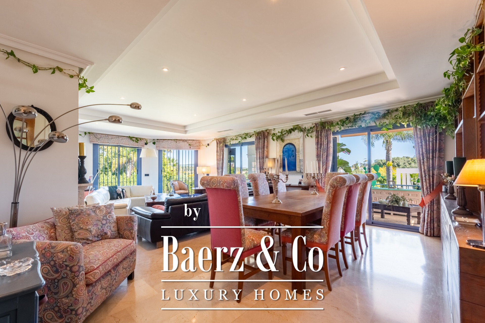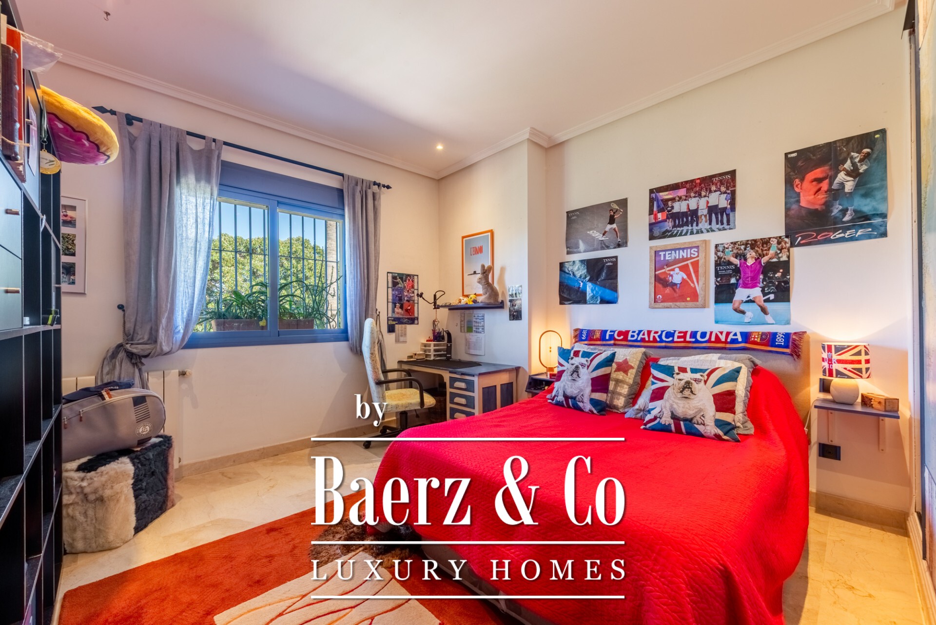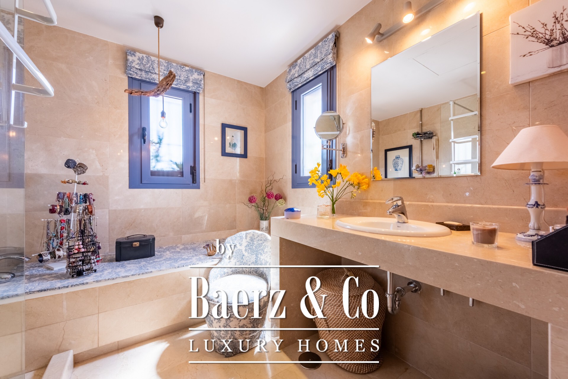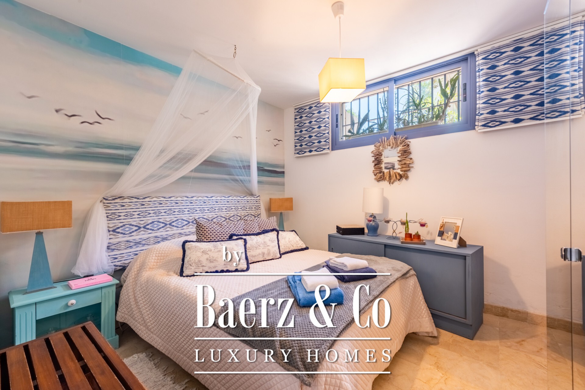 Le niveau inférieur abrite un appartement indépendant avec son propre espace de vie, idéal pour des invités ou le personnel. Plusieurs terrasses, une terrasse privative de 61 m² et une piscine d’eau salée prolongent l’espace de vie à l’extérieur, agrémentés de vues panoramiques sur le jardin et la piscine. La sécurité est assurée par une surveillance 24h/24 et un portail sécurisé. La proximité immédiate des clubs de plage, golfs, écoles et du port de plaisance vient sublimer encore davantage l’attrait de la villa.