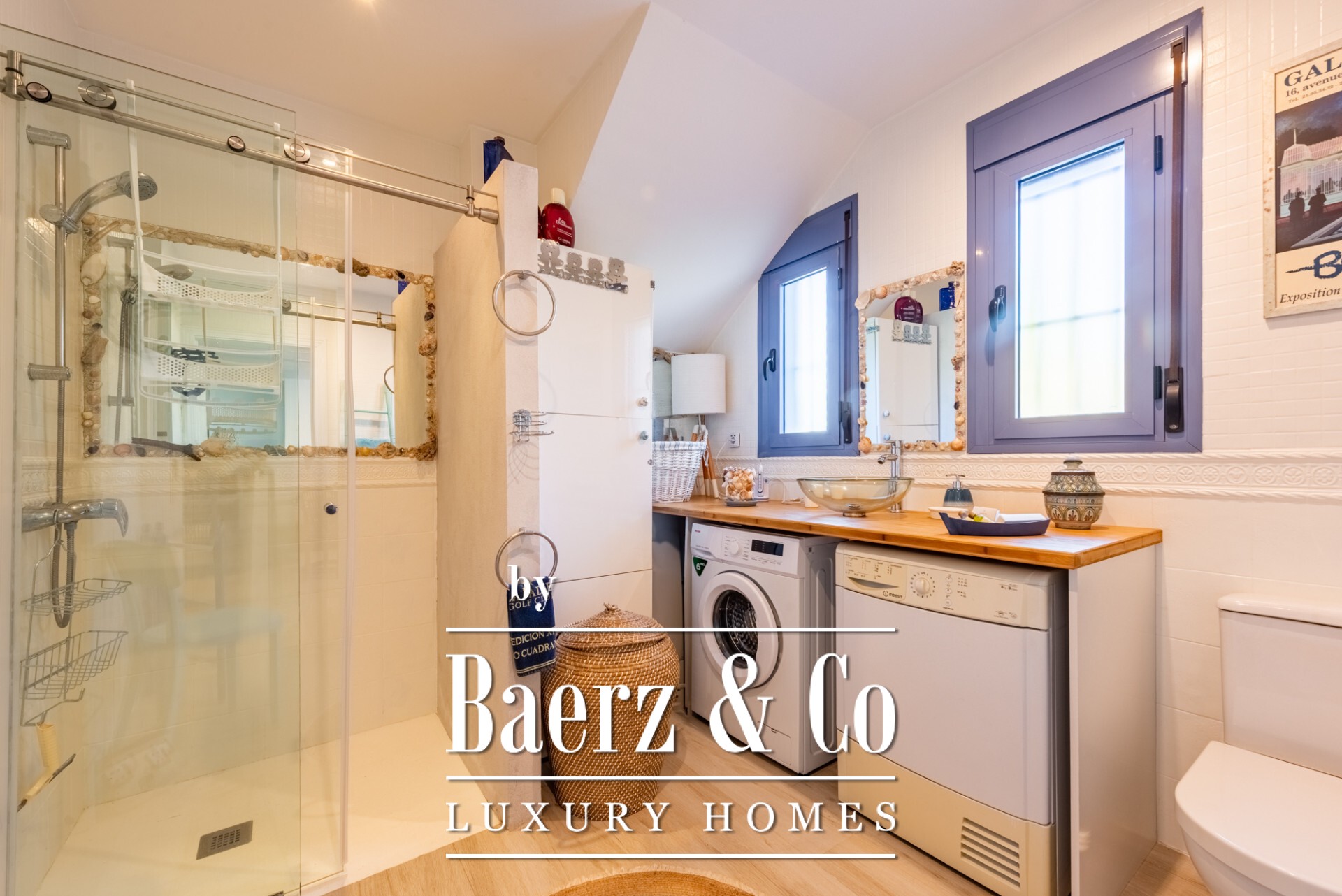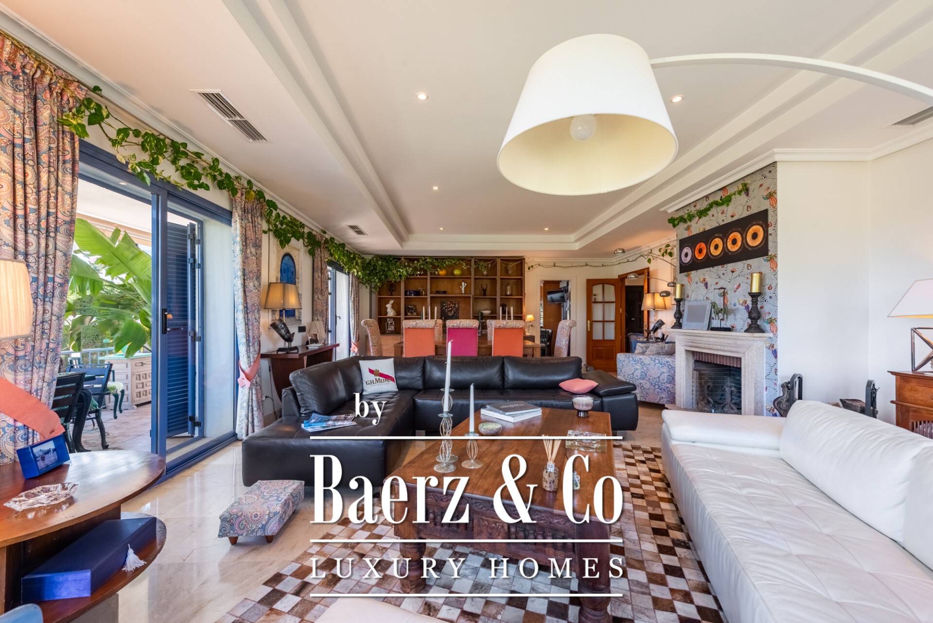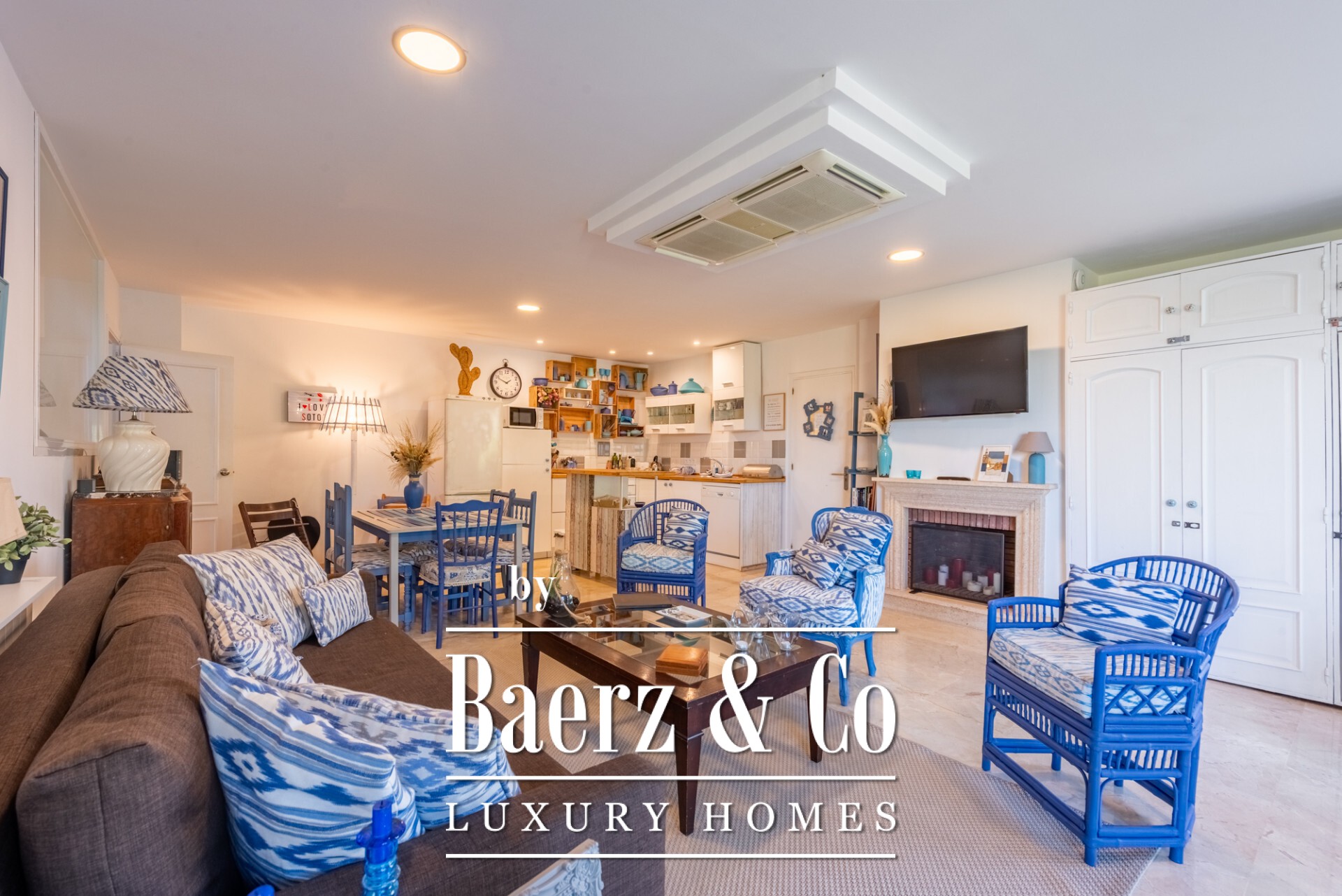 Le niveau inférieur abrite un appartement indépendant avec son propre espace de vie, idéal pour des invités ou le personnel. Plusieurs terrasses, une terrasse privative de 61 m² et une piscine d’eau salée prolongent l’espace de vie à l’extérieur, agrémentés de vues panoramiques sur le jardin et la piscine. La sécurité est assurée par une surveillance 24h/24 et un portail sécurisé. La proximité immédiate des clubs de plage, golfs, écoles et du port de plaisance vient sublimer encore davantage l’attrait de la villa.