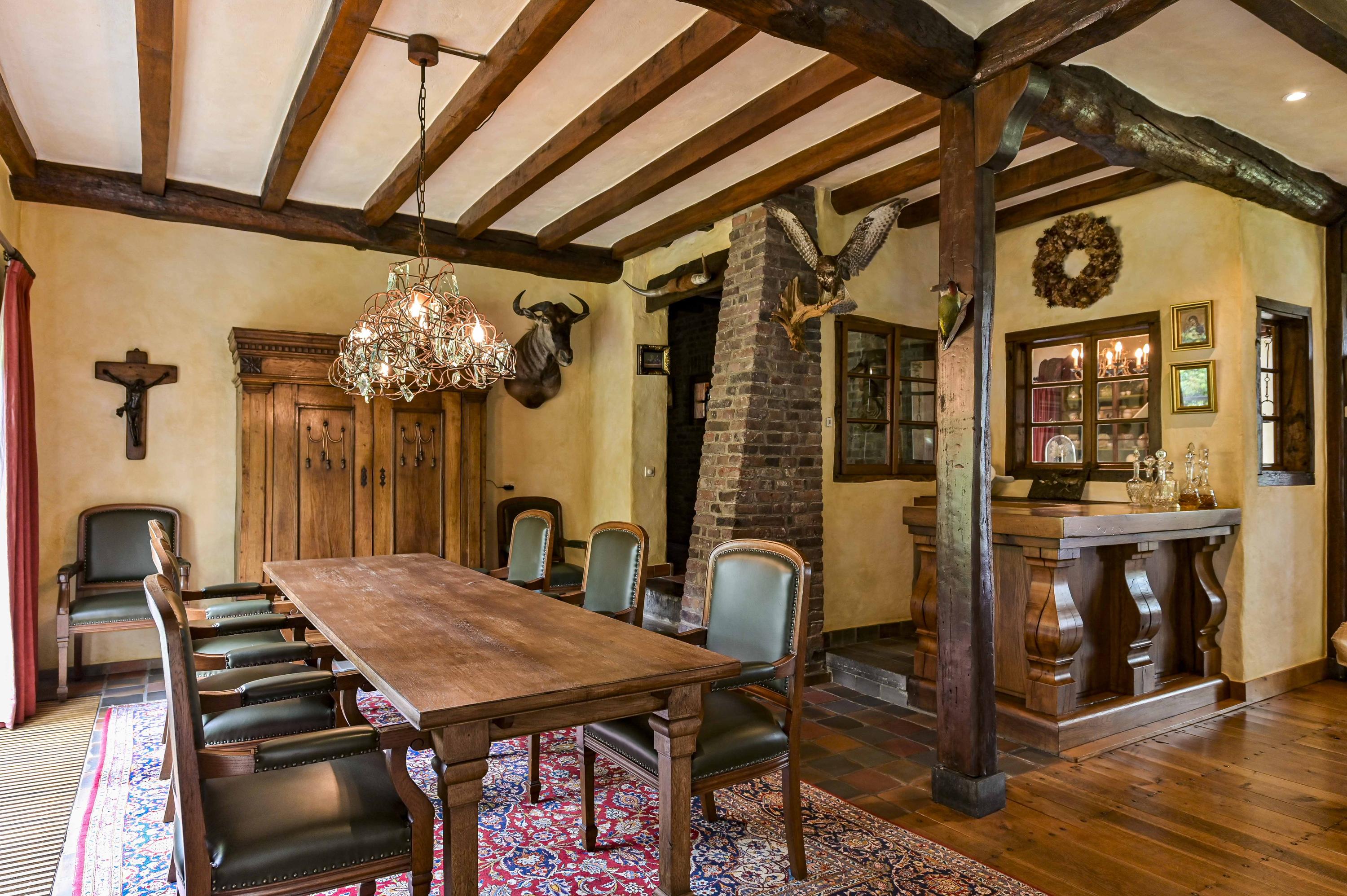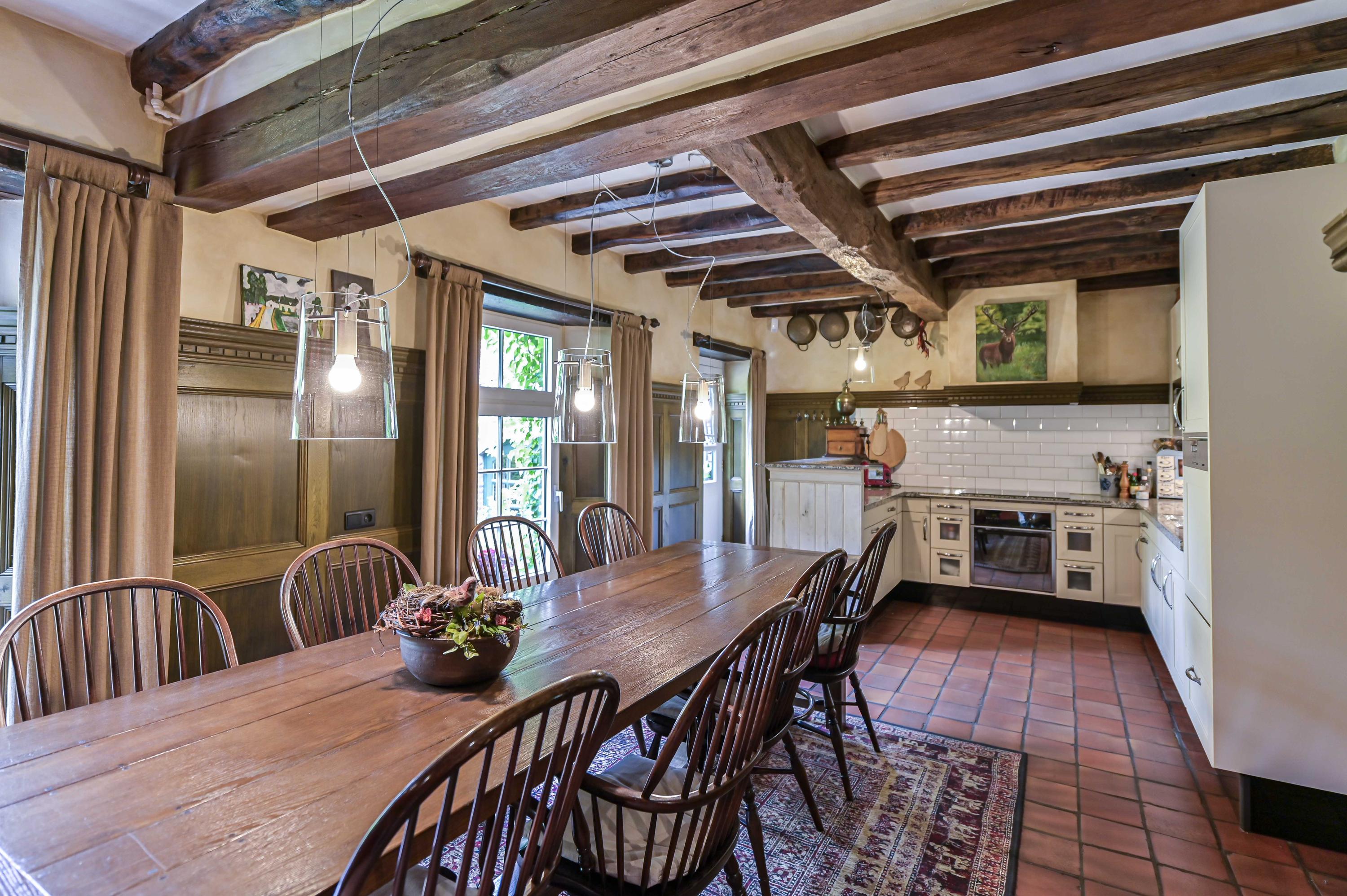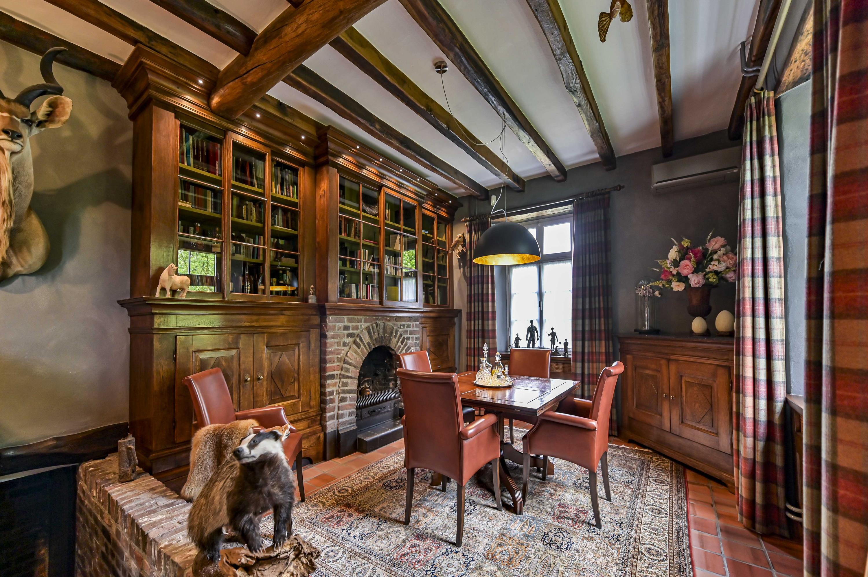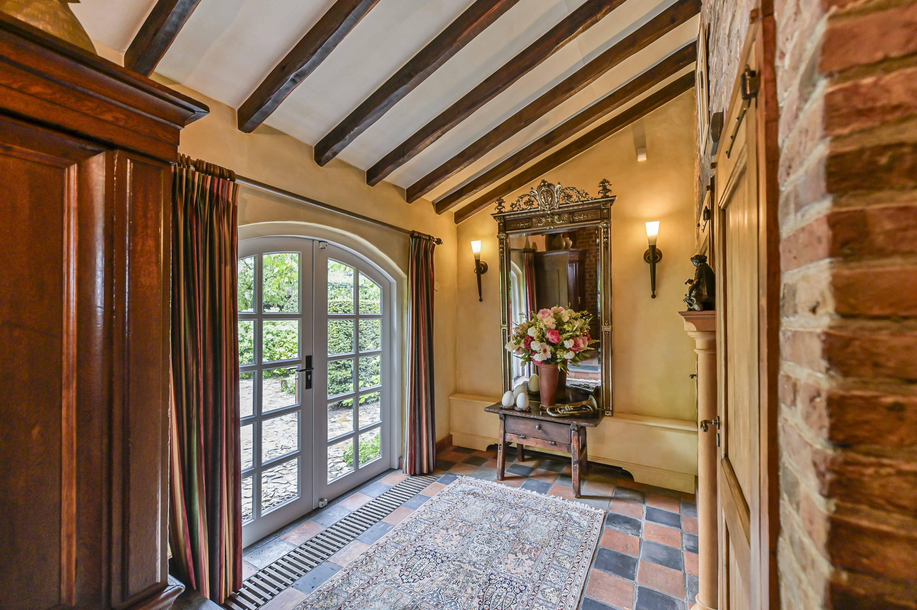 Dans toute la demeure, des éléments architecturaux d’origine tels que caves voûtées, portes-fenêtres, parquets en bois et majestueuse cheminée ouverte côtoient de grandes baies vitrées et un aménagement décloisonné aux volumes confortables. La cour centrale, ornée d’élégantes arches et d’une terrasse couverte de 65 m², est le cœur de la propriété et brouille subtilement les frontières entre intérieur et espaces extérieurs soignés. La véranda en aluminium avec chauffage au sol offre un panorama sur les jardins manucurés, un étang et des arbres matures, assurant lumière et tranquillité tout au long de l’année.